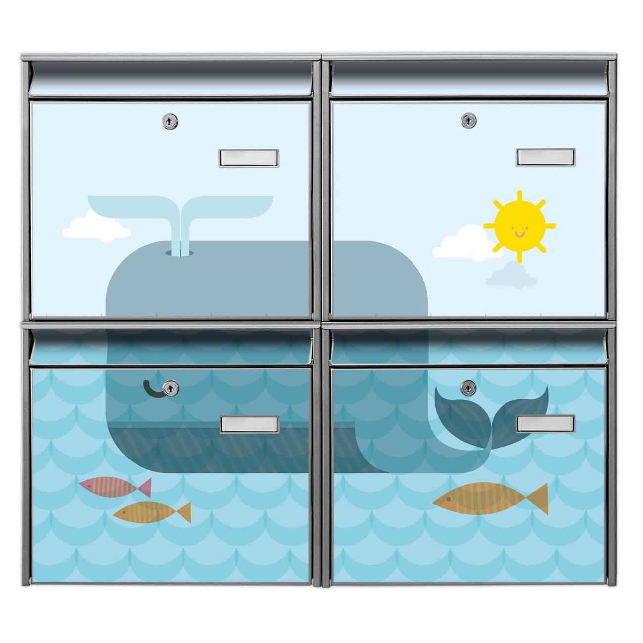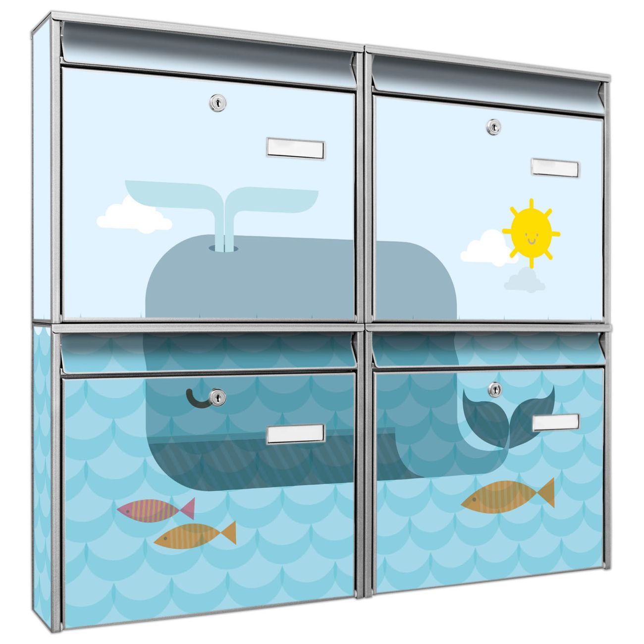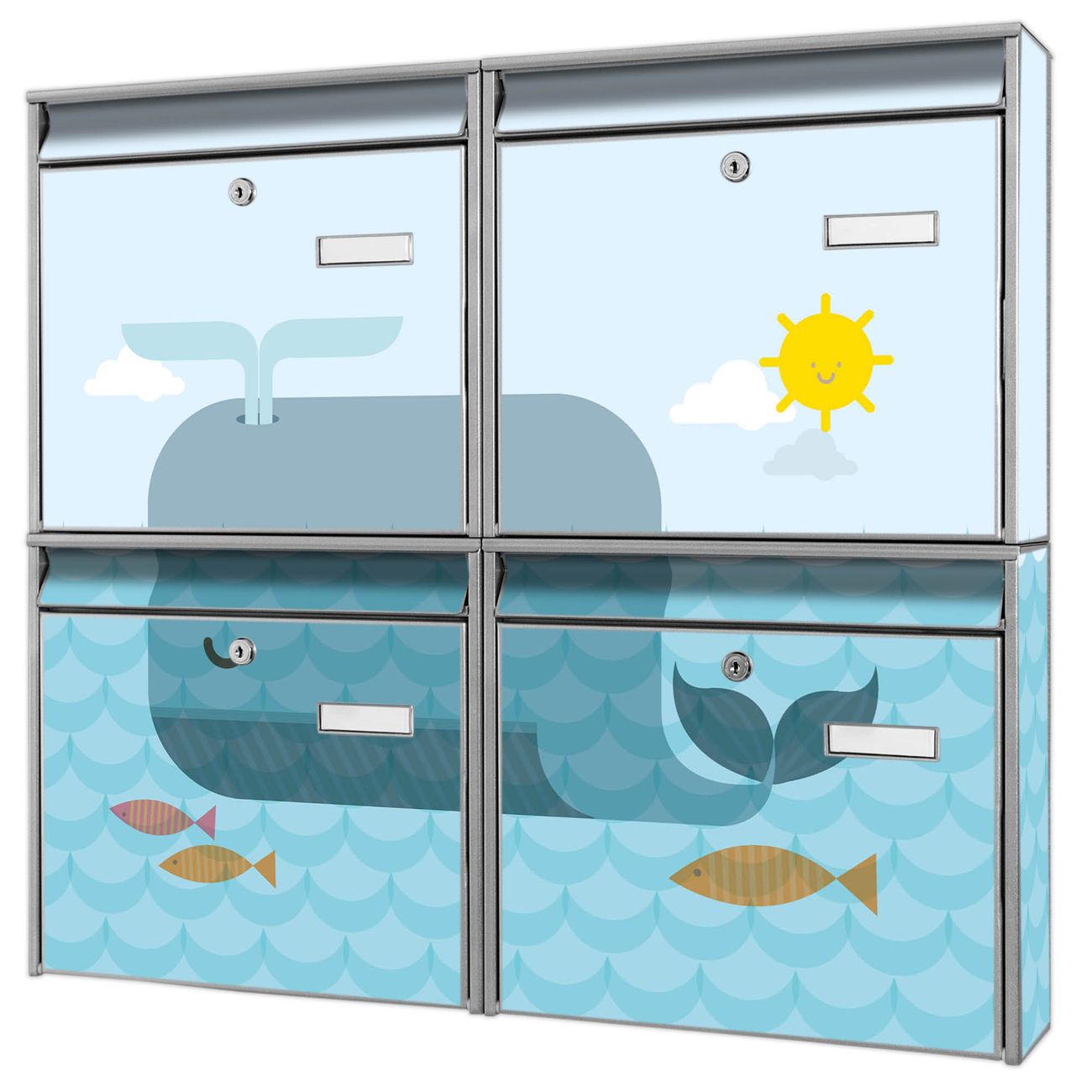 FUNKTION: Die Burg-Wächter Briefkastenanlage mit Motiv Schlafender Wal bietet Ihnen ausreichend Fassungsvermögen um auch A4 und C4 Sendungen zu empfangen. Das integrierte Namensschild lässt sich individuell beschriften. Wählen Sie aus den Grundfarben weiß, silber und schwarz. DESIGN: Die 4 Briefkästen haben ein ansprechendes und zeitloses Design, ohne dabei auf Funktionalität zu verzichten. Das Material ist sehr stabil, wetterfest und rostfrei. Durch das Motiv Schlafender Wal werden die Postkästen zu einem Blickfang. DETAILS: Die Postkästen bestehen aus verzinktem Stahl der zusätzlich mit Klarlack versiegelt wurde. Die Kästen sind gesamt 64,5cm hoch, 72,5cm breit und 10cm tief. Das Motiv besteht aus einer wetter- und UV-festen Folie, die Ihren Briefkasten zusätzlich vor Kratzern schützt. Die Postkästen werden mit Montagematerial, je einem Namensschild und je zwei Schlüsseln geliefert. NUTZEN: Das Briefkastenset eignet sich für die Wandmontage, die Größe bietet genügend Platz für Sendungen aller Art. Das zeitlose Design sowie die stabile Bauart bieten Ihnen einen treuen Begleiter für Ihre Post. BANJADO:
