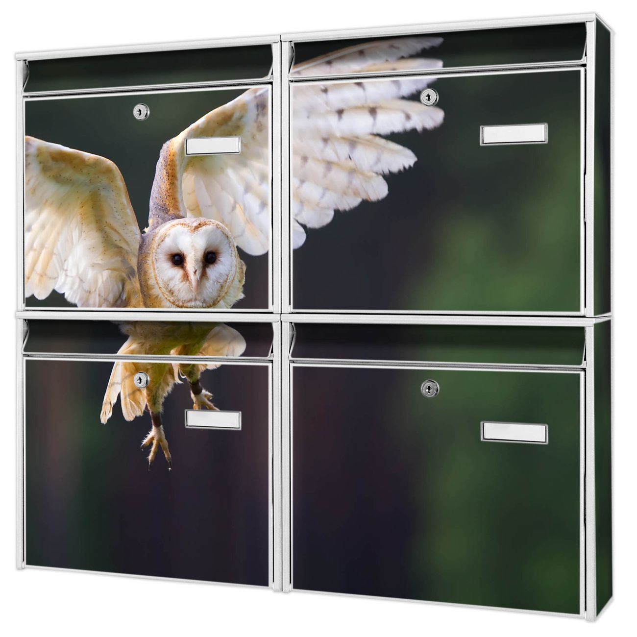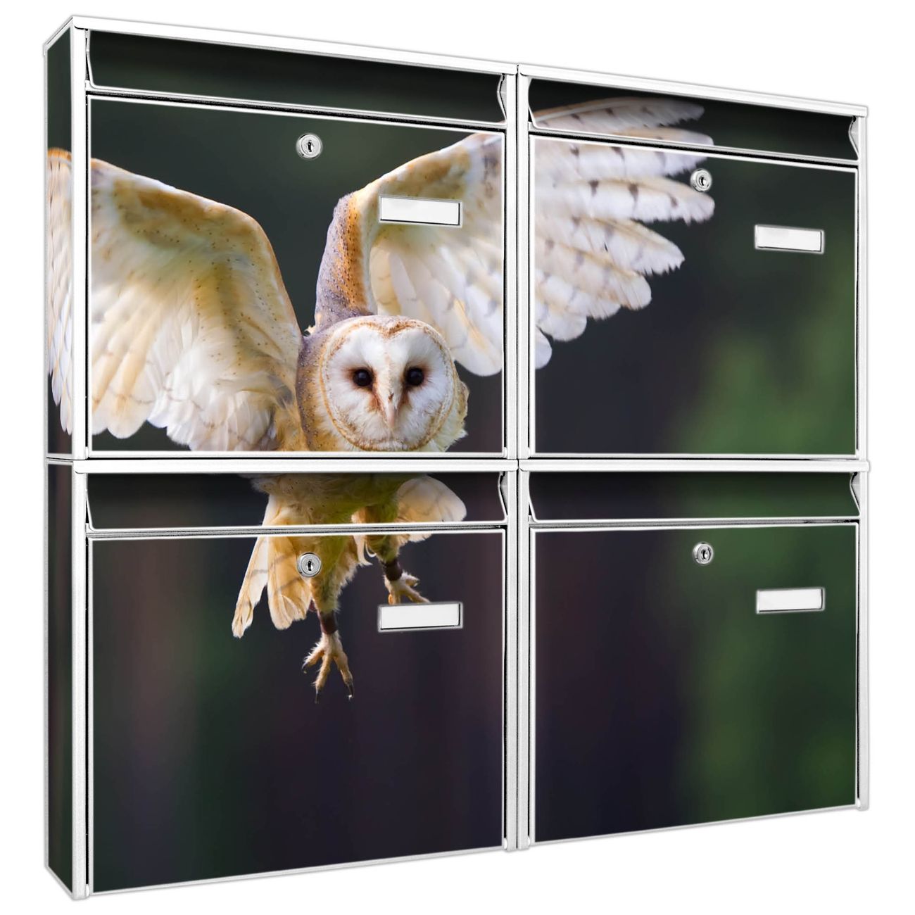 FUNKTION: Die Burg-Wächter Briefkastenanlage mit Motiv Schleiereule bietet Ihnen ausreichend Fassungsvermögen um auch A4 und C4 Sendungen zu empfangen. Das integrierte Namensschild lässt sich individuell beschriften. Wählen Sie aus den Grundfarben weiß, silber und schwarz. DESIGN: Die 4 Briefkästen haben ein ansprechendes und zeitloses Design, ohne dabei auf Funktionalität zu verzichten. Das Material ist sehr stabil, wetterfest und rostfrei. Durch das Motiv Schleiereule werden die Postkästen zu einem Blickfang. DETAILS: Die Postkästen bestehen aus verzinktem Stahl der zusätzlich mit Klarlack versiegelt wurde. Die Kästen sind gesamt 64,5cm hoch, 72,5cm breit und 10cm tief. Das Motiv besteht aus einer wetter- und UV-festen Folie, die Ihren Briefkasten zusätzlich vor Kratzern schützt. Die Postkästen werden mit Montagematerial, je einem Namensschild und je zwei Schlüsseln geliefert. NUTZEN: Das Briefkastenset eignet sich für die Wandmontage, die Größe bietet genügend Platz für Sendungen aller Art. Das zeitlose Design sowie die stabile Bauart bieten Ihnen einen treuen Begleiter für Ihre Post. BANJADO: