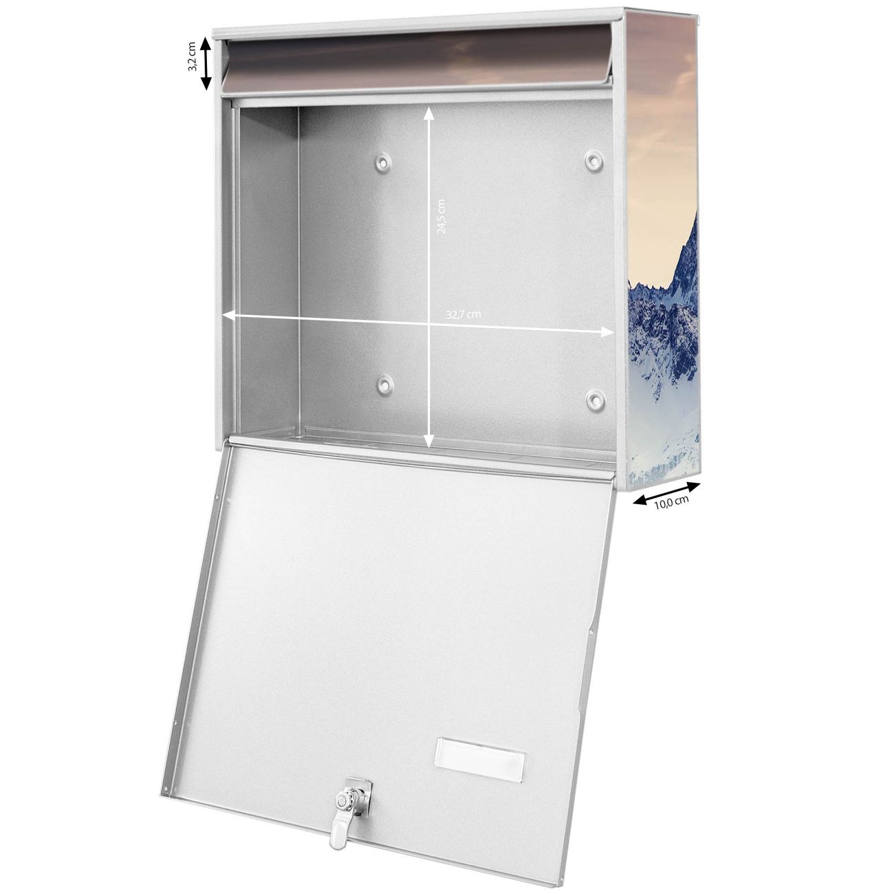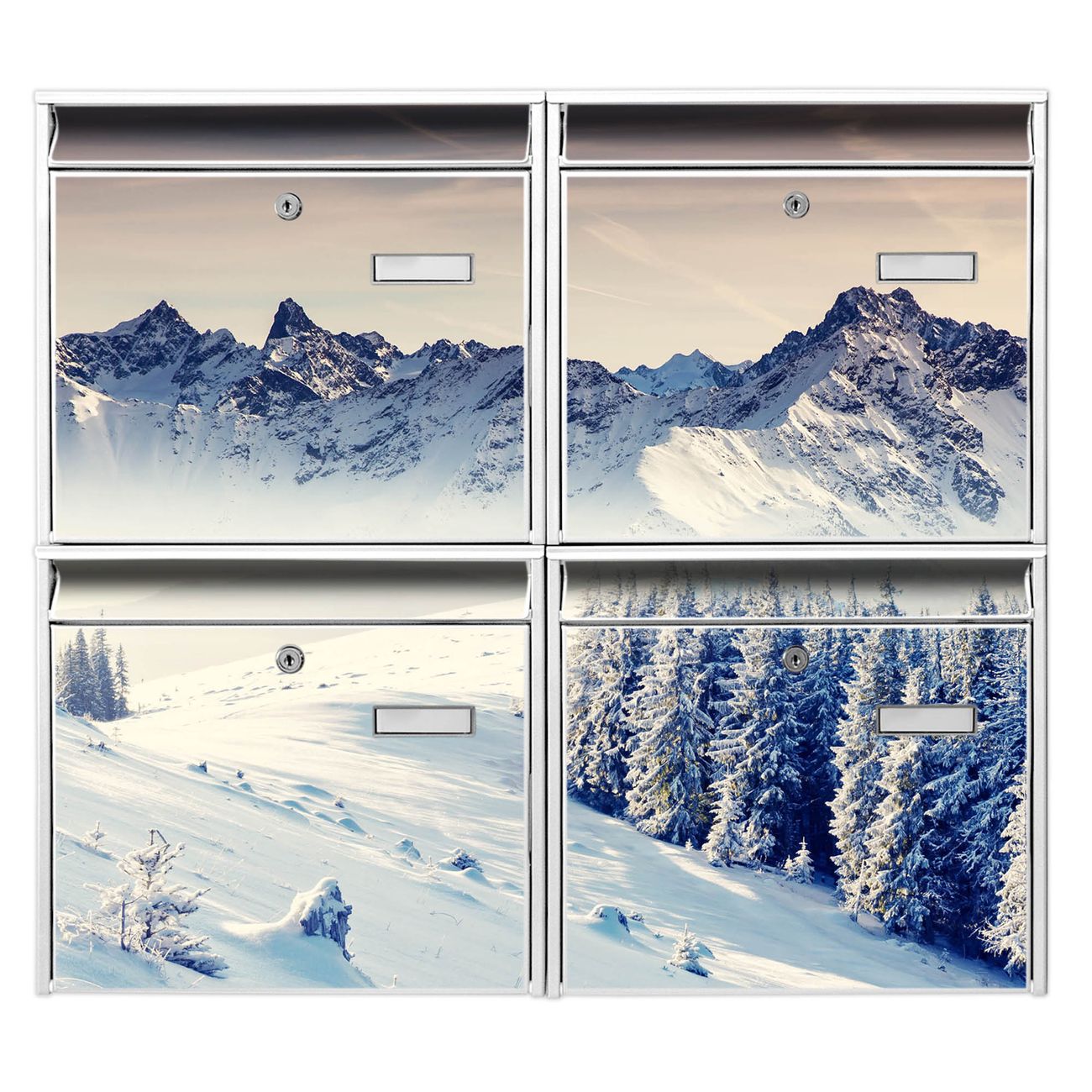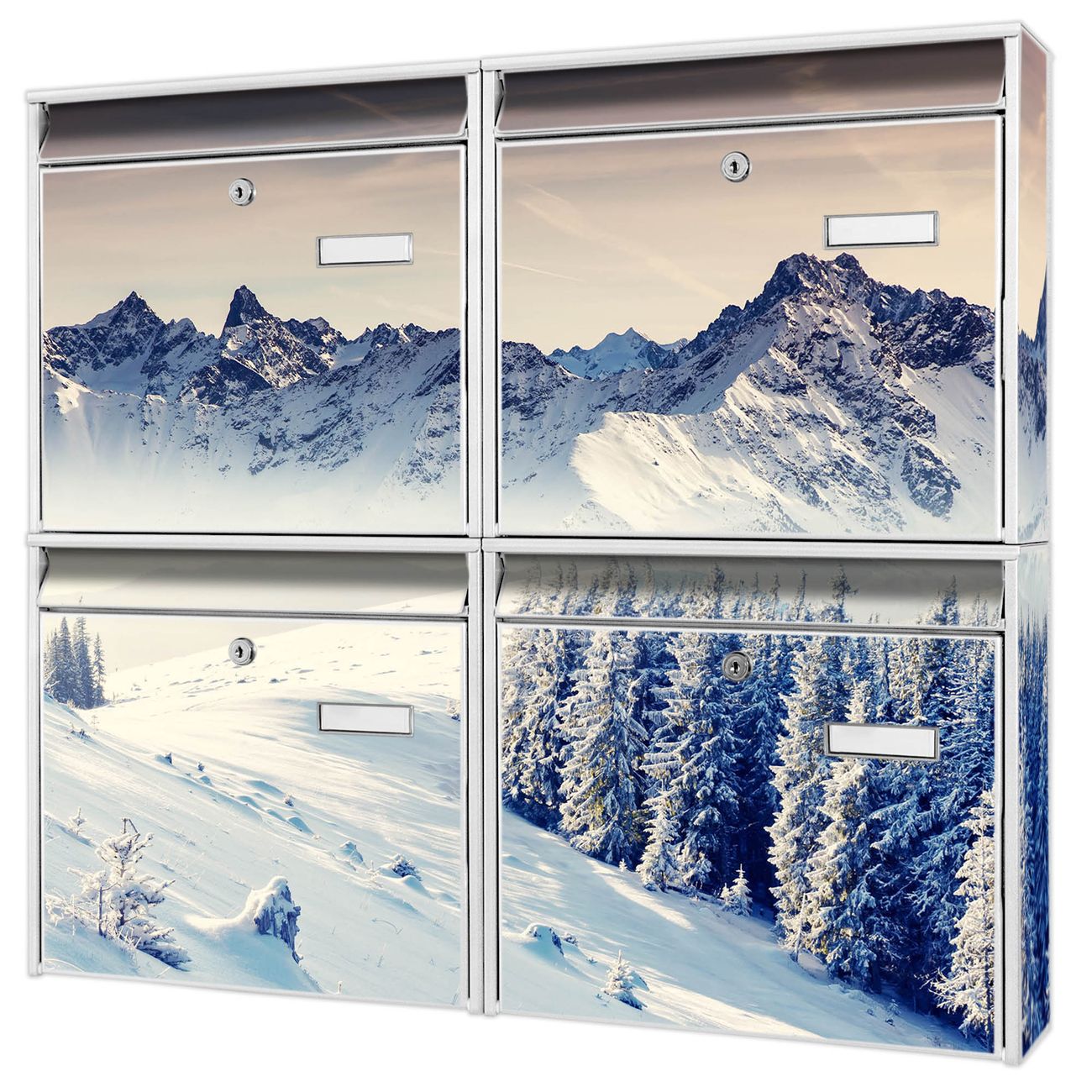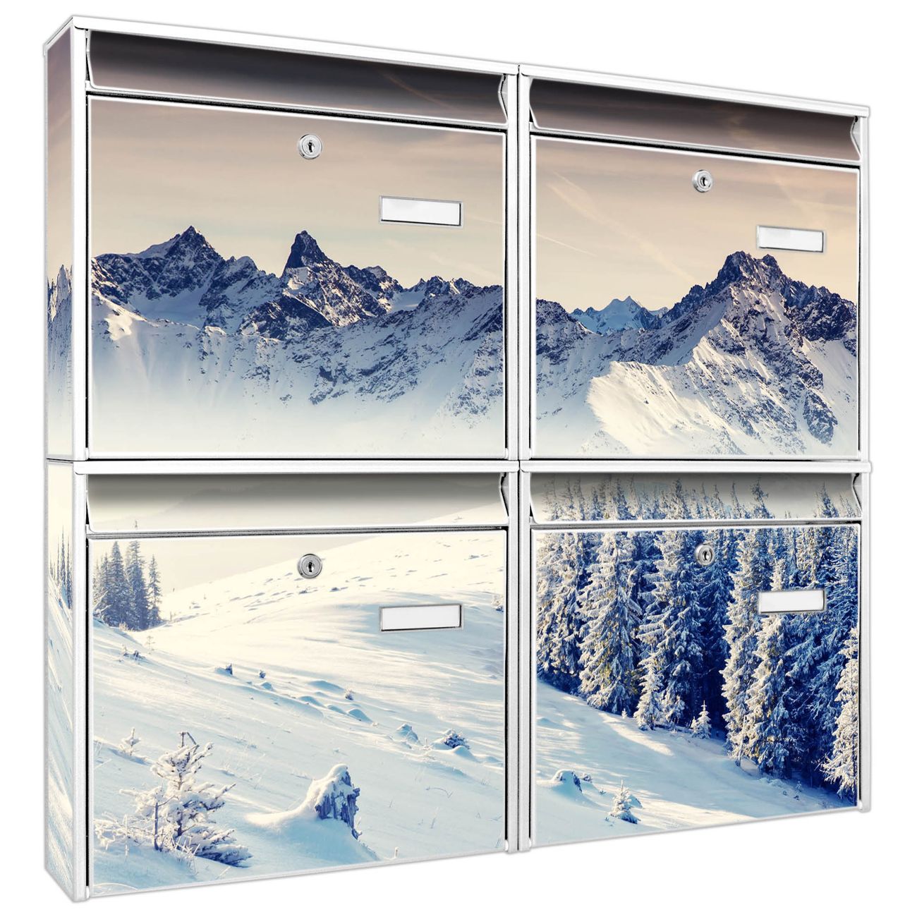 FUNKTION: Die Burg-Wächter Briefkastenanlage mit Motiv Schneebedeckte Berge bietet Ihnen ausreichend Fassungsvermögen um auch A4 und C4 Sendungen zu empfangen. Das integrierte Namensschild lässt sich individuell beschriften. Wählen Sie aus den Grundfarben weiß, silber und schwarz. DESIGN: Die 4 Briefkästen haben ein ansprechendes und zeitloses Design, ohne dabei auf Funktionalität zu verzichten. Das Material ist sehr stabil, wetterfest und rostfrei. Durch das Motiv Schneebedeckte Berge werden die Postkästen zu einem Blickfang. DETAILS: Die Postkästen bestehen aus verzinktem Stahl der zusätzlich mit Klarlack versiegelt wurde. Die Kästen sind gesamt 64,5cm hoch, 72,5cm breit und 10cm tief. Das Motiv besteht aus einer wetter- und UV-festen Folie, die Ihren Briefkasten zusätzlich vor Kratzern schützt. Die Postkästen werden mit Montagematerial, je einem Namensschild und je zwei Schlüsseln geliefert. NUTZEN: Das Briefkastenset eignet sich für die Wandmontage, die Größe bietet genügend Platz für Sendungen aller Art. Das zeitlose Design sowie die stabile Bauart bieten Ihnen einen treuen Begleiter für Ihre Post. BANJADO: