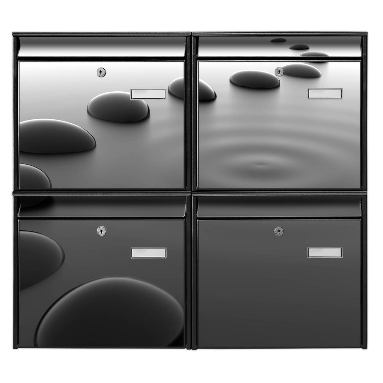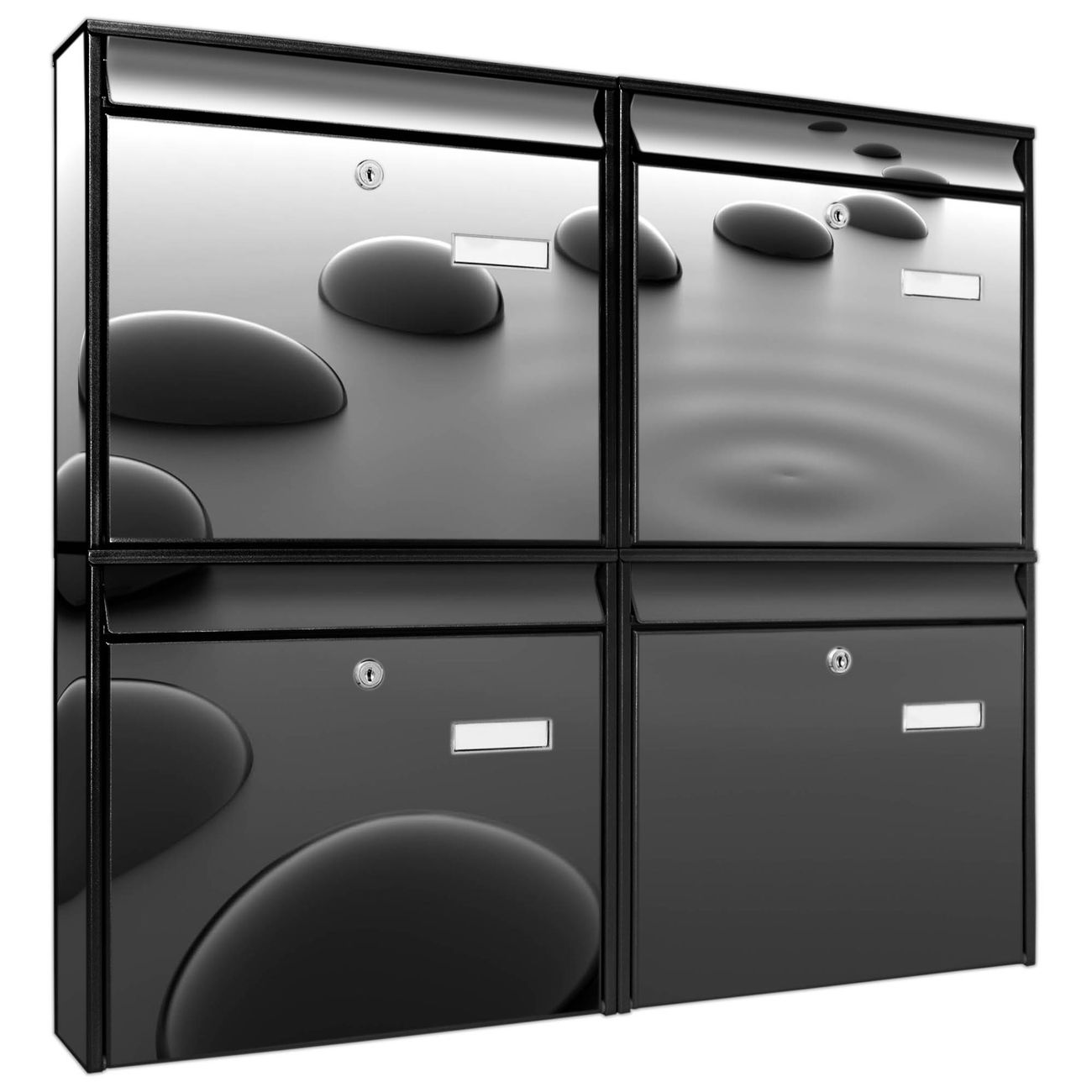 FUNKTION: Die Burg-Wächter Briefkastenanlage mit Motiv Schwarze Steine bietet Ihnen ausreichend Fassungsvermögen um auch A4 und C4 Sendungen zu empfangen. Das integrierte Namensschild lässt sich individuell beschriften. Wählen Sie aus den Grundfarben weiß, silber und schwarz. DESIGN: Die 4 Briefkästen haben ein ansprechendes und zeitloses Design, ohne dabei auf Funktionalität zu verzichten. Das Material ist sehr stabil, wetterfest und rostfrei. Durch das Motiv Schwarze Steine werden die Postkästen zu einem Blickfang. DETAILS: Die Postkästen bestehen aus verzinktem Stahl der zusätzlich mit Klarlack versiegelt wurde. Die Kästen sind gesamt 64,5cm hoch, 72,5cm breit und 10cm tief. Das Motiv besteht aus einer wetter- und UV-festen Folie, die Ihren Briefkasten zusätzlich vor Kratzern schützt. Die Postkästen werden mit Montagematerial, je einem Namensschild und je zwei Schlüsseln geliefert. NUTZEN: Das Briefkastenset eignet sich für die Wandmontage, die Größe bietet genügend Platz für Sendungen aller Art. Das zeitlose Design sowie die stabile Bauart bieten Ihnen einen treuen Begleiter für Ihre Post. BANJADO: