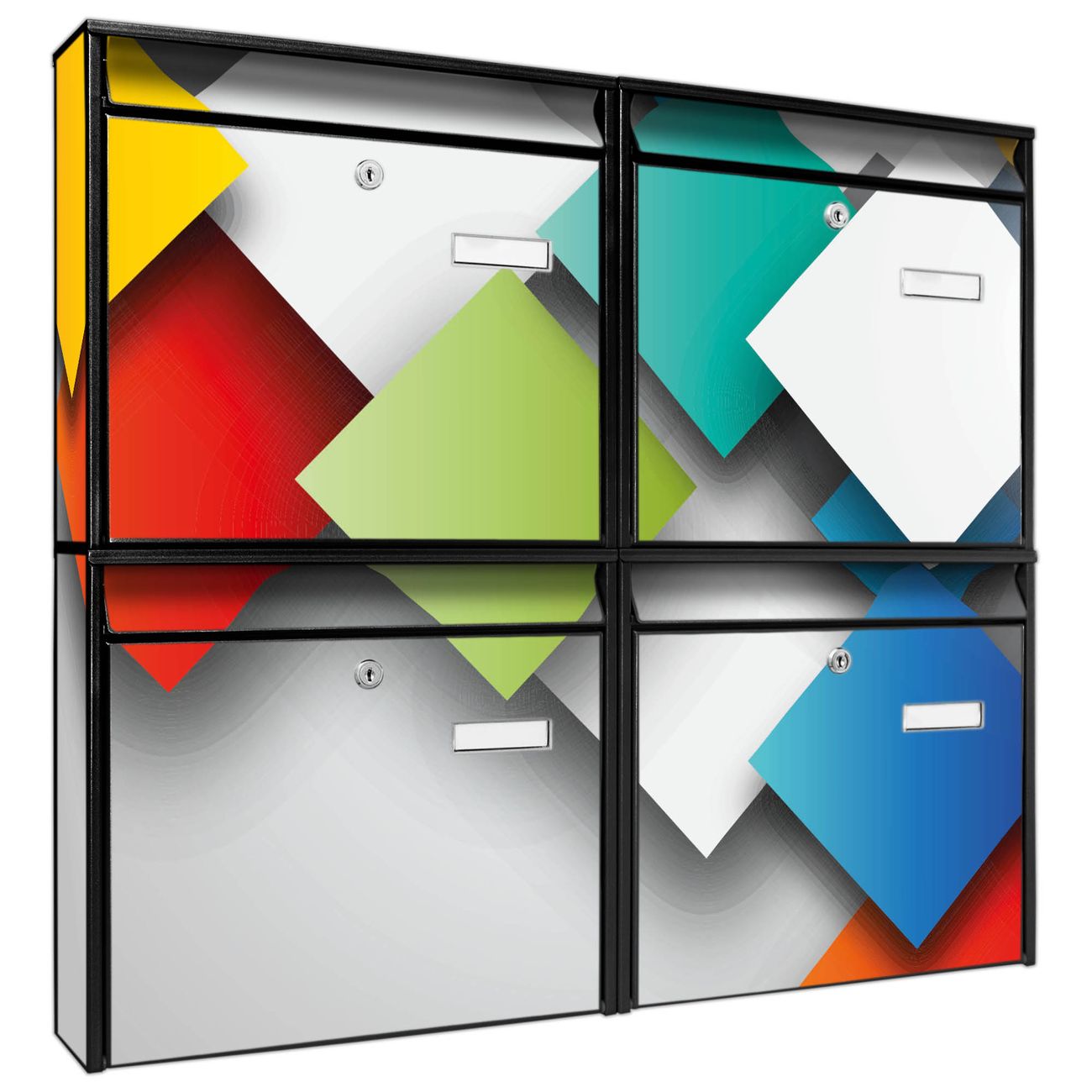 FUNKTION: Die Burg-Wächter Briefkastenanlage mit Motiv Schwebende Quadrate bietet Ihnen ausreichend Fassungsvermögen um auch A4 und C4 Sendungen zu empfangen. Das integrierte Namensschild lässt sich individuell beschriften. Wählen Sie aus den Grundfarben weiß, silber und schwarz. DESIGN: Die 4 Briefkästen haben ein ansprechendes und zeitloses Design, ohne dabei auf Funktionalität zu verzichten. Das Material ist sehr stabil, wetterfest und rostfrei. Durch das Motiv Schwebende Quadrate werden die Postkästen zu einem Blickfang. DETAILS: Die Postkästen bestehen aus verzinktem Stahl der zusätzlich mit Klarlack versiegelt wurde. Die Kästen sind gesamt 64,5cm hoch, 72,5cm breit und 10cm tief. Das Motiv besteht aus einer wetter- und UV-festen Folie, die Ihren Briefkasten zusätzlich vor Kratzern schützt. Die Postkästen werden mit Montagematerial, je einem Namensschild und je zwei Schlüsseln geliefert. NUTZEN: Das Briefkastenset eignet sich für die Wandmontage, die Größe bietet genügend Platz für Sendungen aller Art. Das zeitlose Design sowie die stabile Bauart bieten Ihnen einen treuen Begleiter für Ihre Post. BANJADO: