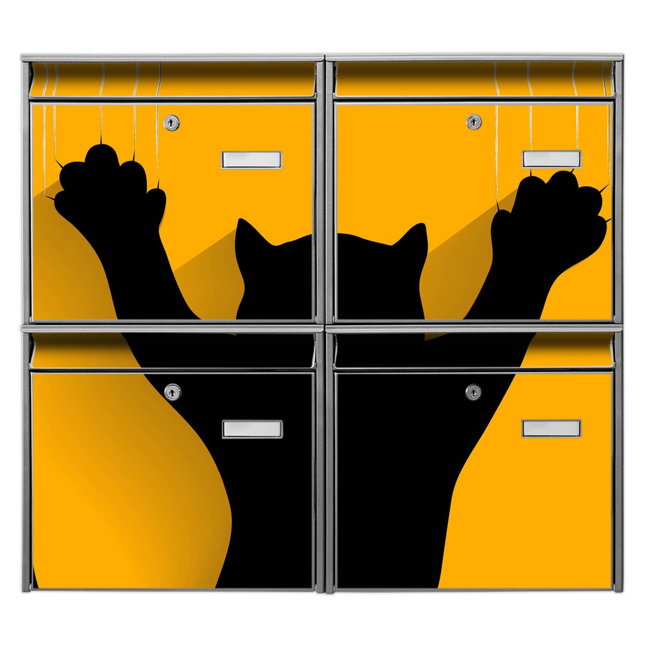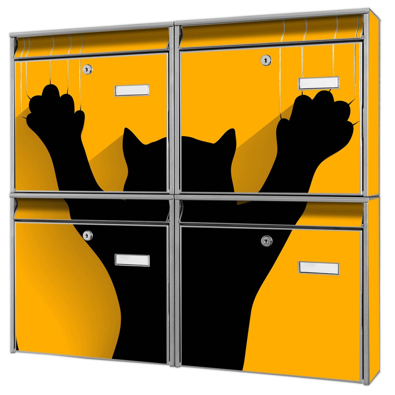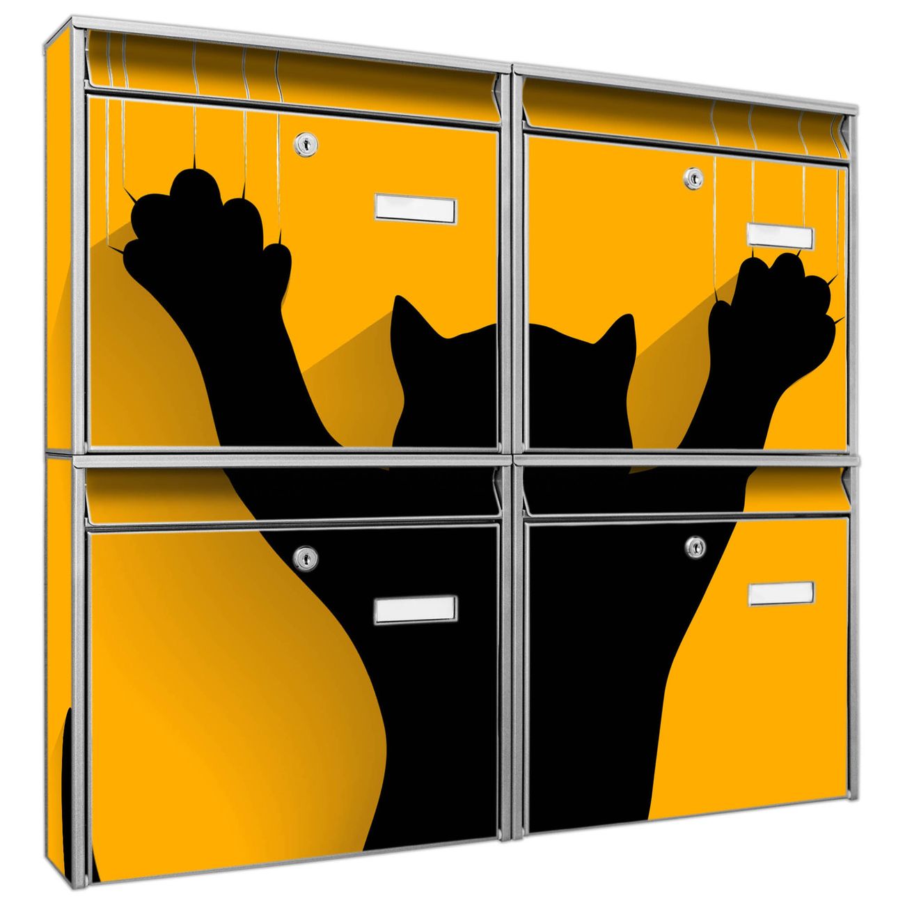 FUNKTION: Die Burg-Wächter Briefkastenanlage mit Motiv Scratch bietet Ihnen ausreichend Fassungsvermögen um auch A4 und C4 Sendungen zu empfangen. Das integrierte Namensschild lässt sich individuell beschriften. Wählen Sie aus den Grundfarben weiß, silber und schwarz. DESIGN: Die 4 Briefkästen haben ein ansprechendes und zeitloses Design, ohne dabei auf Funktionalität zu verzichten. Das Material ist sehr stabil, wetterfest und rostfrei. Durch das Motiv Scratch werden die Postkästen zu einem Blickfang. DETAILS: Die Postkästen bestehen aus verzinktem Stahl der zusätzlich mit Klarlack versiegelt wurde. Die Kästen sind gesamt 64,5cm hoch, 72,5cm breit und 10cm tief. Das Motiv besteht aus einer wetter- und UV-festen Folie, die Ihren Briefkasten zusätzlich vor Kratzern schützt. Die Postkästen werden mit Montagematerial, je einem Namensschild und je zwei Schlüsseln geliefert. NUTZEN: Das Briefkastenset eignet sich für die Wandmontage, die Größe bietet genügend Platz für Sendungen aller Art. Das zeitlose Design sowie die stabile Bauart bieten Ihnen einen treuen Begleiter für Ihre Post. BANJADO: