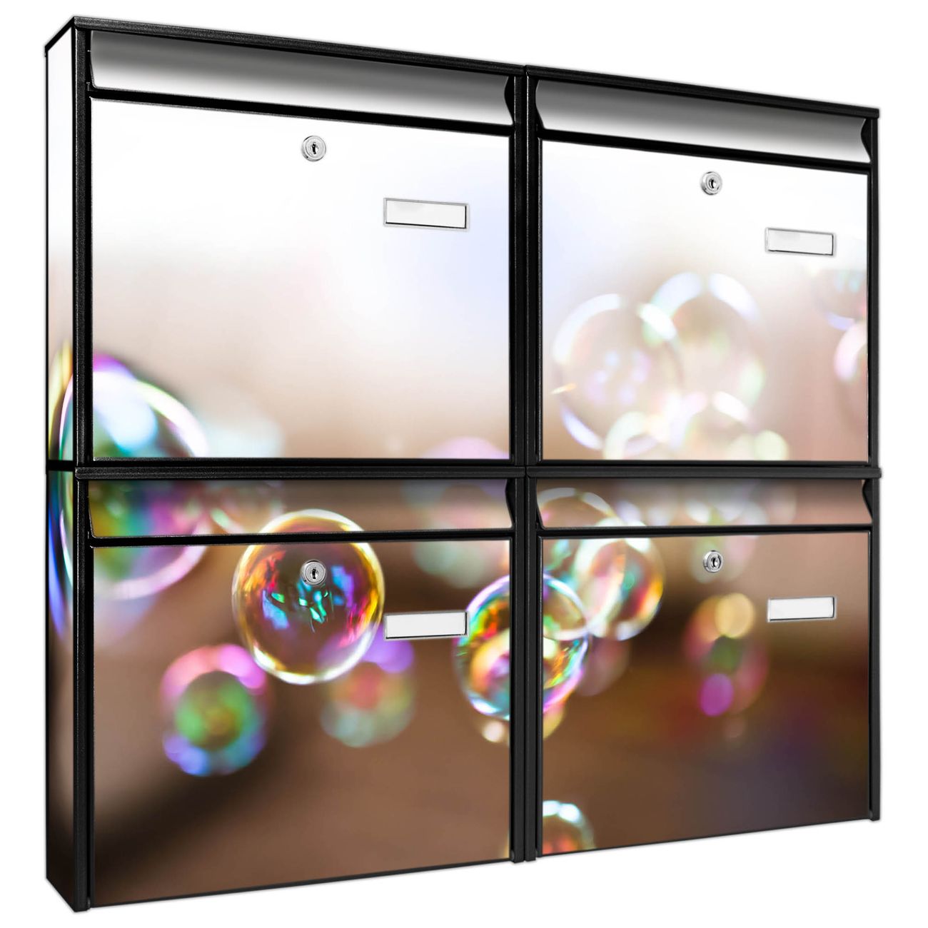 FUNKTION: Die Burg-Wächter Briefkastenanlage mit Motiv Seifenblasen bietet Ihnen ausreichend Fassungsvermögen um auch A4 und C4 Sendungen zu empfangen. Das integrierte Namensschild lässt sich individuell beschriften. Wählen Sie aus den Grundfarben weiß, silber und schwarz. DESIGN: Die 4 Briefkästen haben ein ansprechendes und zeitloses Design, ohne dabei auf Funktionalität zu verzichten. Das Material ist sehr stabil, wetterfest und rostfrei. Durch das Motiv Seifenblasen werden die Postkästen zu einem Blickfang. DETAILS: Die Postkästen bestehen aus verzinktem Stahl der zusätzlich mit Klarlack versiegelt wurde. Die Kästen sind gesamt 64,5cm hoch, 72,5cm breit und 10cm tief. Das Motiv besteht aus einer wetter- und UV-festen Folie, die Ihren Briefkasten zusätzlich vor Kratzern schützt. Die Postkästen werden mit Montagematerial, je einem Namensschild und je zwei Schlüsseln geliefert. NUTZEN: Das Briefkastenset eignet sich für die Wandmontage, die Größe bietet genügend Platz für Sendungen aller Art. Das zeitlose Design sowie die stabile Bauart bieten Ihnen einen treuen Begleiter für Ihre Post. BANJADO:
