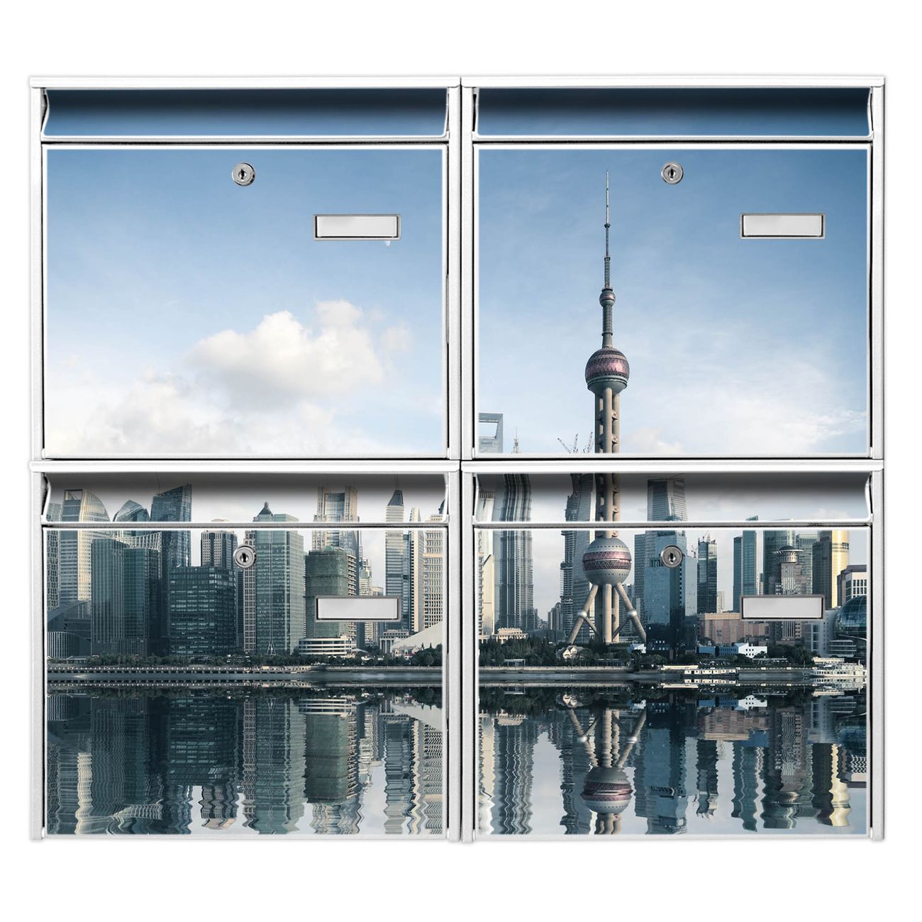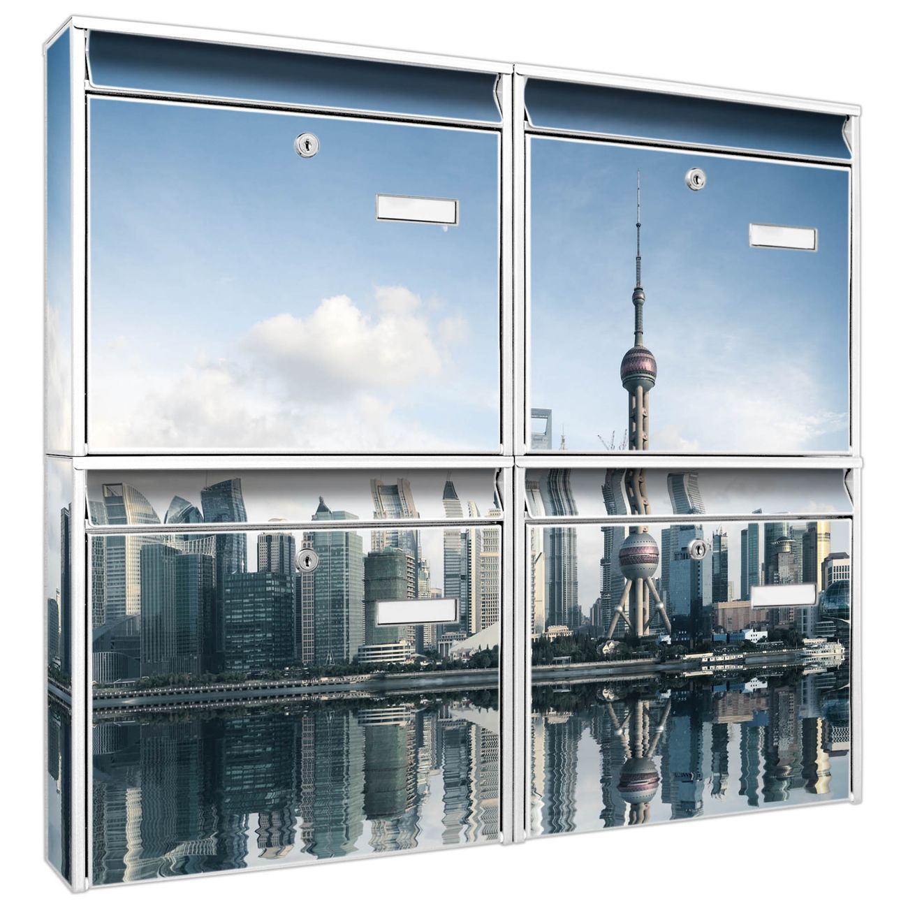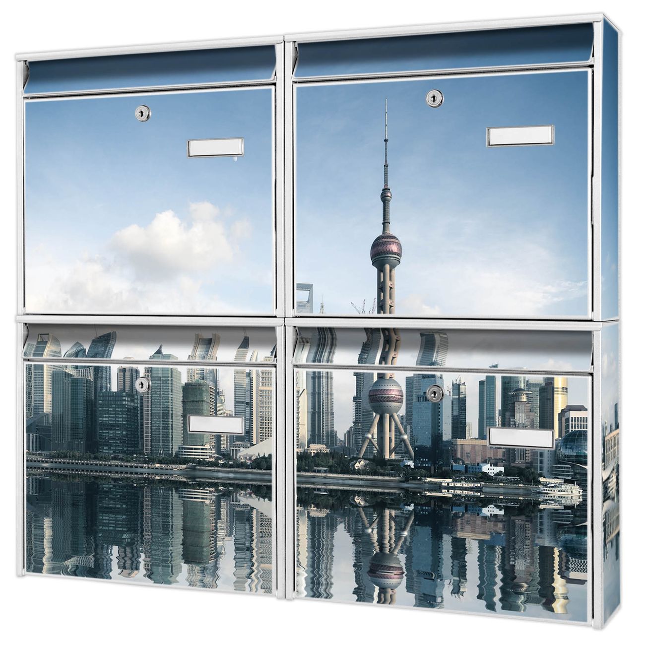 FUNKTION: Die Burg-Wächter Briefkastenanlage mit Motiv Shanghai bietet Ihnen ausreichend Fassungsvermögen um auch A4 und C4 Sendungen zu empfangen. Das integrierte Namensschild lässt sich individuell beschriften. Wählen Sie aus den Grundfarben weiß, silber und schwarz. DESIGN: Die 4 Briefkästen haben ein ansprechendes und zeitloses Design, ohne dabei auf Funktionalität zu verzichten. Das Material ist sehr stabil, wetterfest und rostfrei. Durch das Motiv Shanghai werden die Postkästen zu einem Blickfang. DETAILS: Die Postkästen bestehen aus verzinktem Stahl der zusätzlich mit Klarlack versiegelt wurde. Die Kästen sind gesamt 64,5cm hoch, 72,5cm breit und 10cm tief. Das Motiv besteht aus einer wetter- und UV-festen Folie, die Ihren Briefkasten zusätzlich vor Kratzern schützt. Die Postkästen werden mit Montagematerial, je einem Namensschild und je zwei Schlüsseln geliefert. NUTZEN: Das Briefkastenset eignet sich für die Wandmontage, die Größe bietet genügend Platz für Sendungen aller Art. Das zeitlose Design sowie die stabile Bauart bieten Ihnen einen treuen Begleiter für Ihre Post. BANJADO: