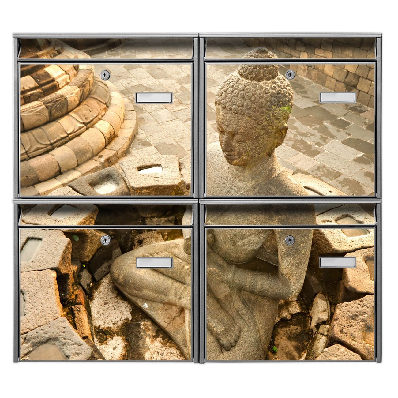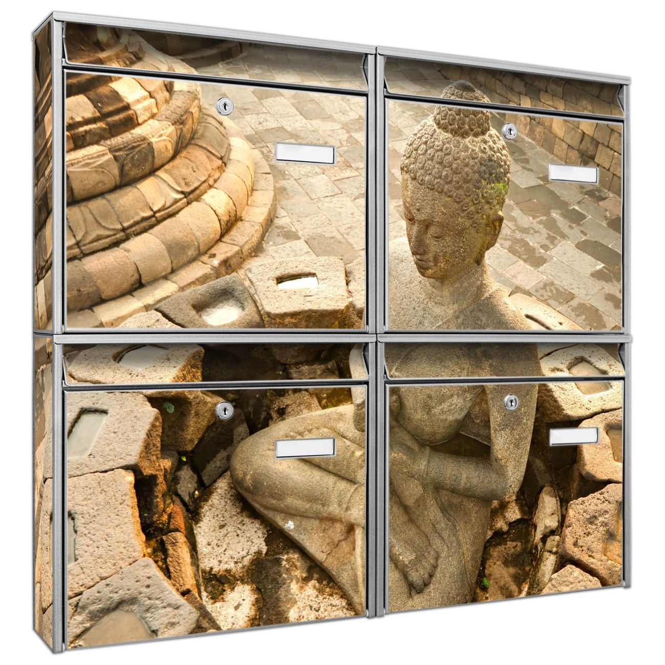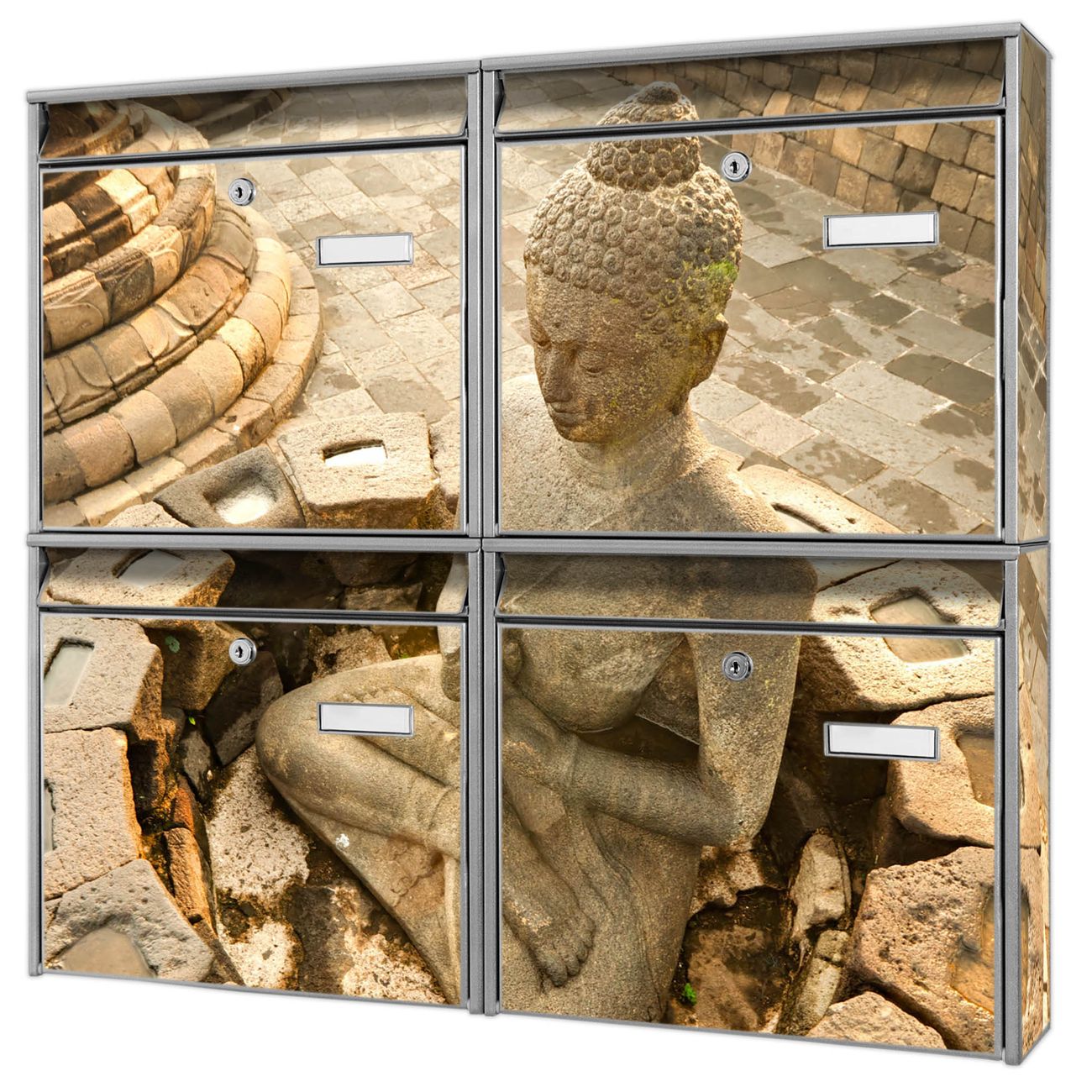 FUNKTION: Die Burg-Wächter Briefkastenanlage mit Motiv Sitzender Buddha bietet Ihnen ausreichend Fassungsvermögen um auch A4 und C4 Sendungen zu empfangen. Das integrierte Namensschild lässt sich individuell beschriften. Wählen Sie aus den Grundfarben weiß, silber und schwarz. DESIGN: Die 4 Briefkästen haben ein ansprechendes und zeitloses Design, ohne dabei auf Funktionalität zu verzichten. Das Material ist sehr stabil, wetterfest und rostfrei. Durch das Motiv Sitzender Buddha werden die Postkästen zu einem Blickfang. DETAILS: Die Postkästen bestehen aus verzinktem Stahl der zusätzlich mit Klarlack versiegelt wurde. Die Kästen sind gesamt 64,5cm hoch, 72,5cm breit und 10cm tief. Das Motiv besteht aus einer wetter- und UV-festen Folie, die Ihren Briefkasten zusätzlich vor Kratzern schützt. Die Postkästen werden mit Montagematerial, je einem Namensschild und je zwei Schlüsseln geliefert. NUTZEN: Das Briefkastenset eignet sich für die Wandmontage, die Größe bietet genügend Platz für Sendungen aller Art. Das zeitlose Design sowie die stabile Bauart bieten Ihnen einen treuen Begleiter für Ihre Post. BANJADO: