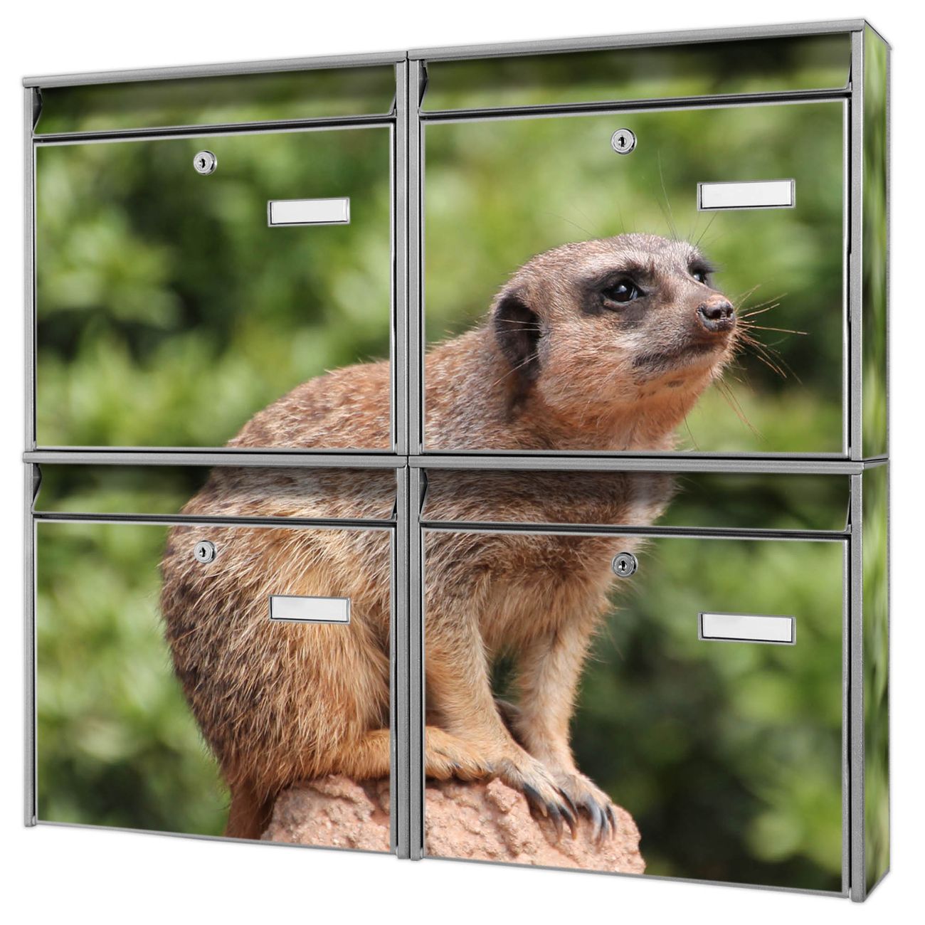FUNKTION: Die Burg-Wächter Briefkastenanlage mit Motiv Sitzendes Erdmännchen bietet Ihnen ausreichend Fassungsvermögen um auch A4 und C4 Sendungen zu empfangen. Das integrierte Namensschild lässt sich individuell beschriften. Wählen Sie aus den Grundfarben weiß, silber und schwarz. DESIGN: Die 4 Briefkästen haben ein ansprechendes und zeitloses Design, ohne dabei auf Funktionalität zu verzichten. Das Material ist sehr stabil, wetterfest und rostfrei. Durch das Motiv Sitzendes Erdmännchen werden die Postkästen zu einem Blickfang. DETAILS: Die Postkästen bestehen aus verzinktem Stahl der zusätzlich mit Klarlack versiegelt wurde. Die Kästen sind gesamt 64,5cm hoch, 72,5cm breit und 10cm tief. Das Motiv besteht aus einer wetter- und UV-festen Folie, die Ihren Briefkasten zusätzlich vor Kratzern schützt. Die Postkästen werden mit Montagematerial, je einem Namensschild und je zwei Schlüsseln geliefert. NUTZEN: Das Briefkastenset eignet sich für die Wandmontage, die Größe bietet genügend Platz für Sendungen aller Art. Das zeitlose Design sowie die stabile Bauart bieten Ihnen einen treuen Begleiter für Ihre Post. BANJADO: