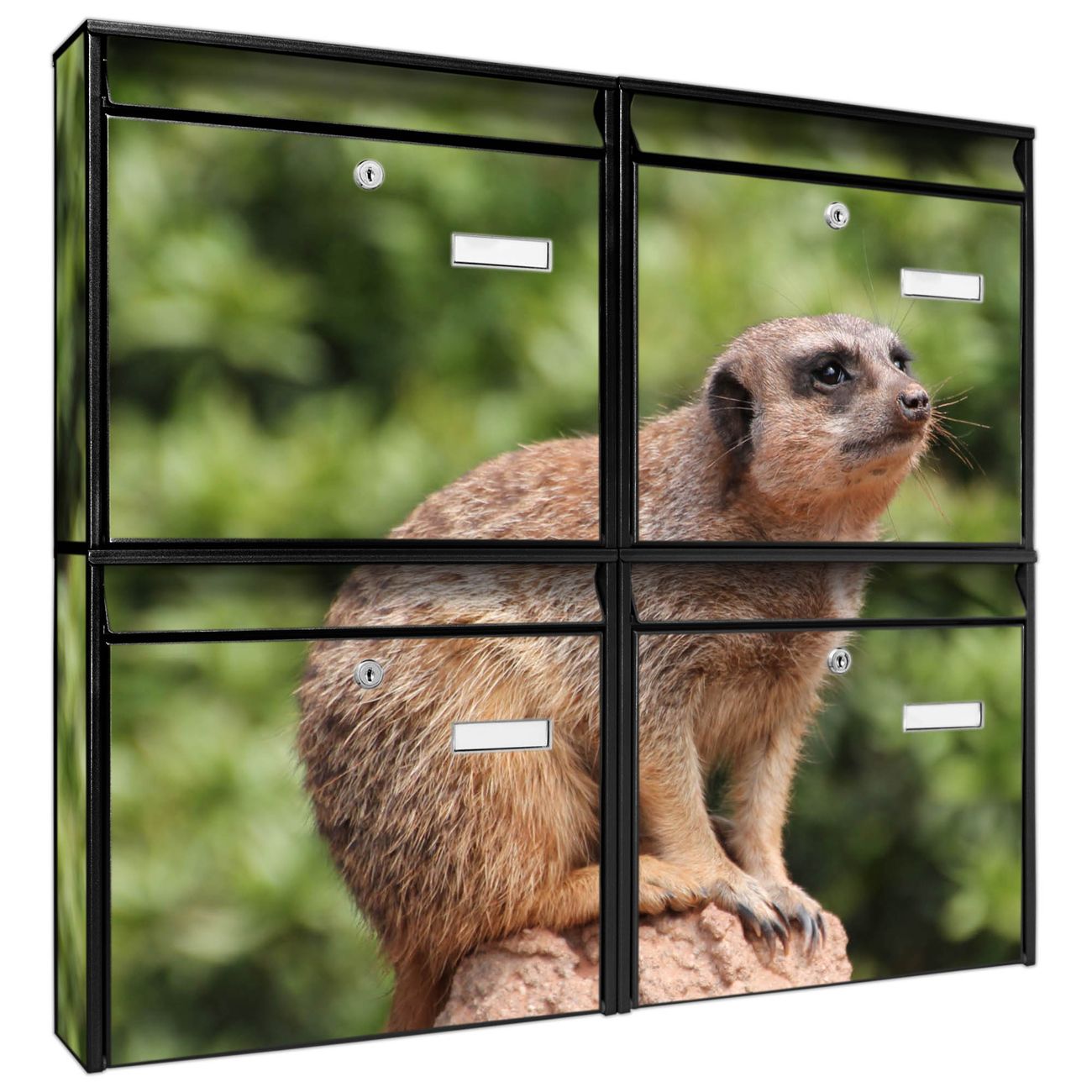 FUNKTION: Die Burg-Wächter Briefkastenanlage mit Motiv Sitzendes Erdmännchen bietet Ihnen ausreichend Fassungsvermögen um auch A4 und C4 Sendungen zu empfangen. Das integrierte Namensschild lässt sich individuell beschriften. Wählen Sie aus den Grundfarben weiß, silber und schwarz. DESIGN: Die 4 Briefkästen haben ein ansprechendes und zeitloses Design, ohne dabei auf Funktionalität zu verzichten. Das Material ist sehr stabil, wetterfest und rostfrei. Durch das Motiv Sitzendes Erdmännchen werden die Postkästen zu einem Blickfang. DETAILS: Die Postkästen bestehen aus verzinktem Stahl der zusätzlich mit Klarlack versiegelt wurde. Die Kästen sind gesamt 64,5cm hoch, 72,5cm breit und 10cm tief. Das Motiv besteht aus einer wetter- und UV-festen Folie, die Ihren Briefkasten zusätzlich vor Kratzern schützt. Die Postkästen werden mit Montagematerial, je einem Namensschild und je zwei Schlüsseln geliefert. NUTZEN: Das Briefkastenset eignet sich für die Wandmontage, die Größe bietet genügend Platz für Sendungen aller Art. Das zeitlose Design sowie die stabile Bauart bieten Ihnen einen treuen Begleiter für Ihre Post. BANJADO: