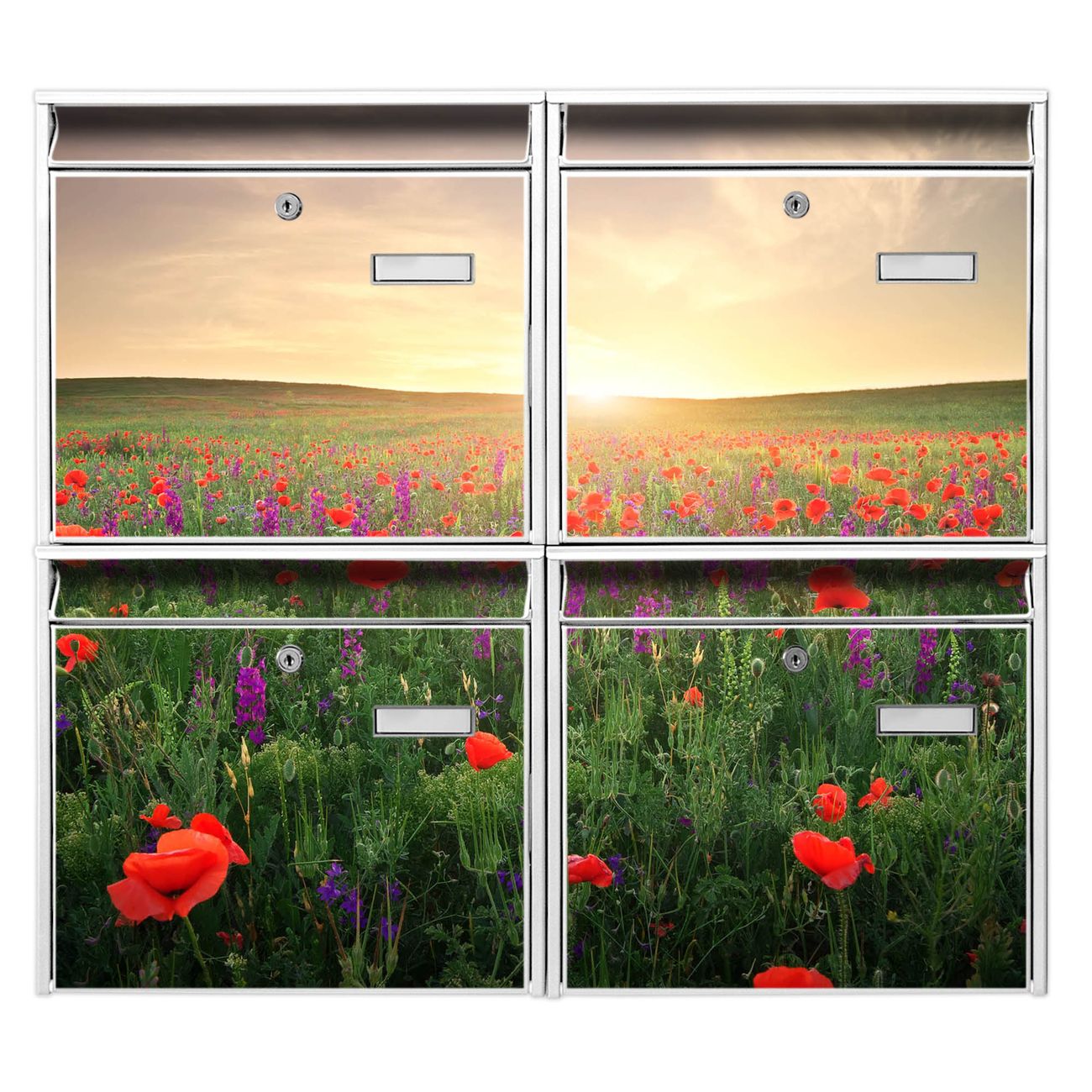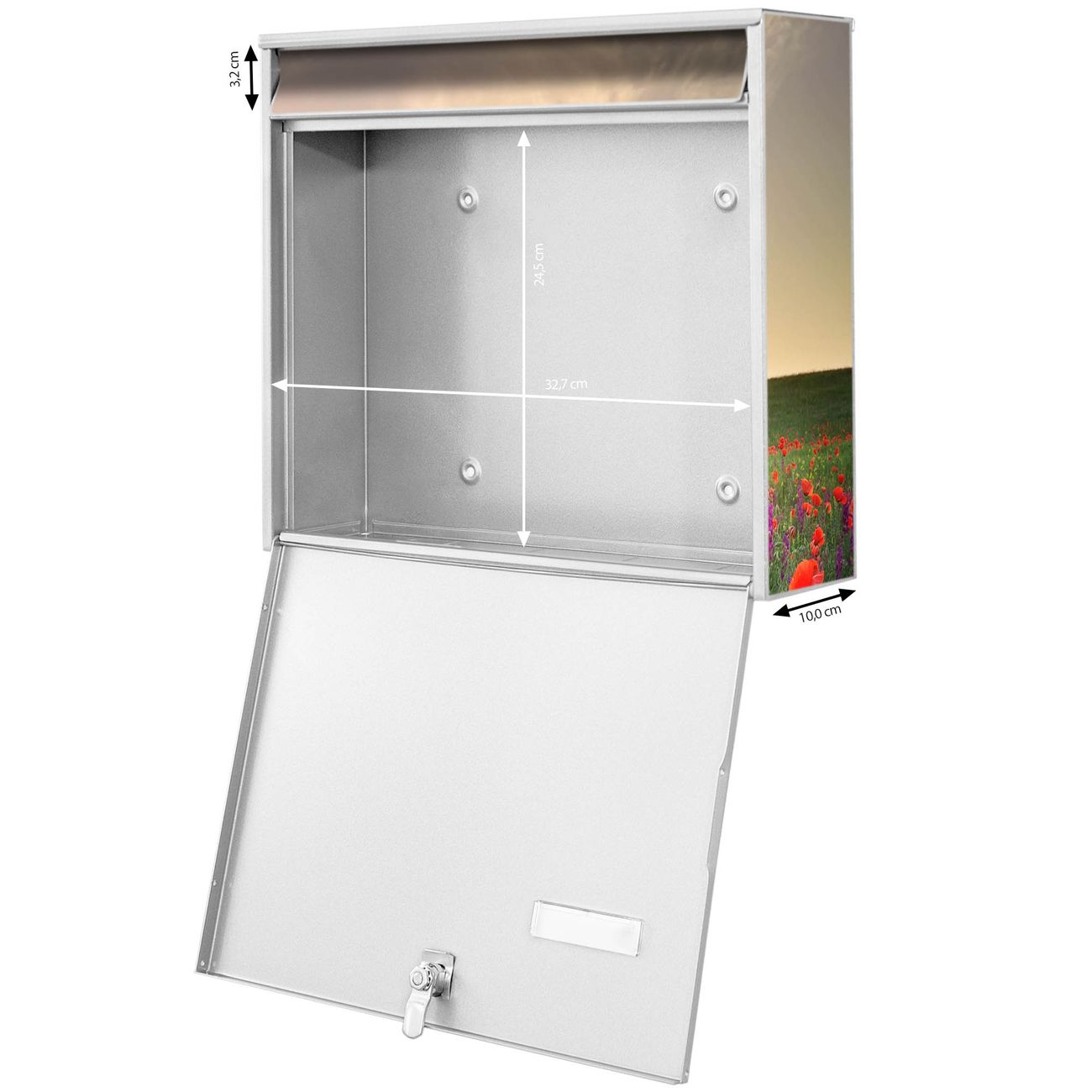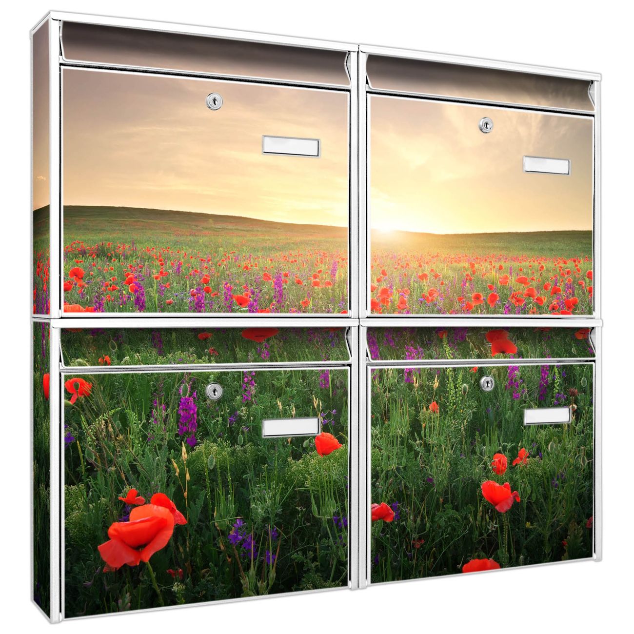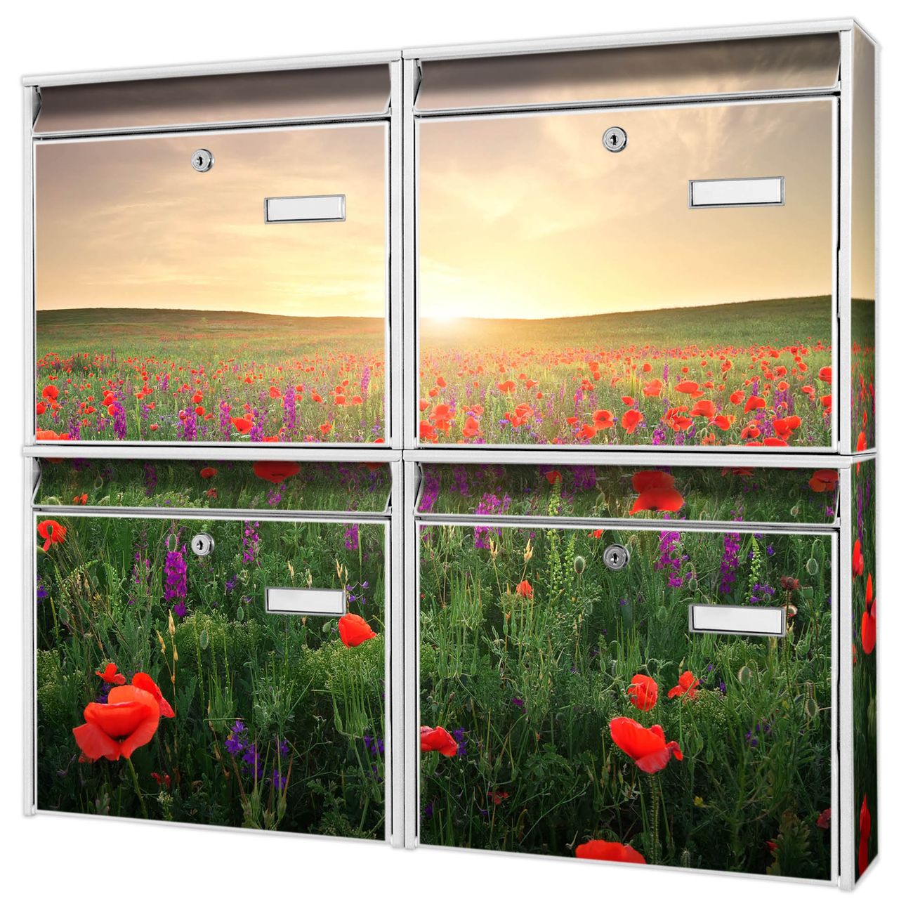 FUNKTION: Die Burg-Wächter Briefkastenanlage mit Motiv Sommerfeld bietet Ihnen ausreichend Fassungsvermögen um auch A4 und C4 Sendungen zu empfangen. Das integrierte Namensschild lässt sich individuell beschriften. Wählen Sie aus den Grundfarben weiß, silber und schwarz. DESIGN: Die 4 Briefkästen haben ein ansprechendes und zeitloses Design, ohne dabei auf Funktionalität zu verzichten. Das Material ist sehr stabil, wetterfest und rostfrei. Durch das Motiv Sommerfeld werden die Postkästen zu einem Blickfang. DETAILS: Die Postkästen bestehen aus verzinktem Stahl der zusätzlich mit Klarlack versiegelt wurde. Die Kästen sind gesamt 64,5cm hoch, 72,5cm breit und 10cm tief. Das Motiv besteht aus einer wetter- und UV-festen Folie, die Ihren Briefkasten zusätzlich vor Kratzern schützt. Die Postkästen werden mit Montagematerial, je einem Namensschild und je zwei Schlüsseln geliefert. NUTZEN: Das Briefkastenset eignet sich für die Wandmontage, die Größe bietet genügend Platz für Sendungen aller Art. Das zeitlose Design sowie die stabile Bauart bieten Ihnen einen treuen Begleiter für Ihre Post. BANJADO: