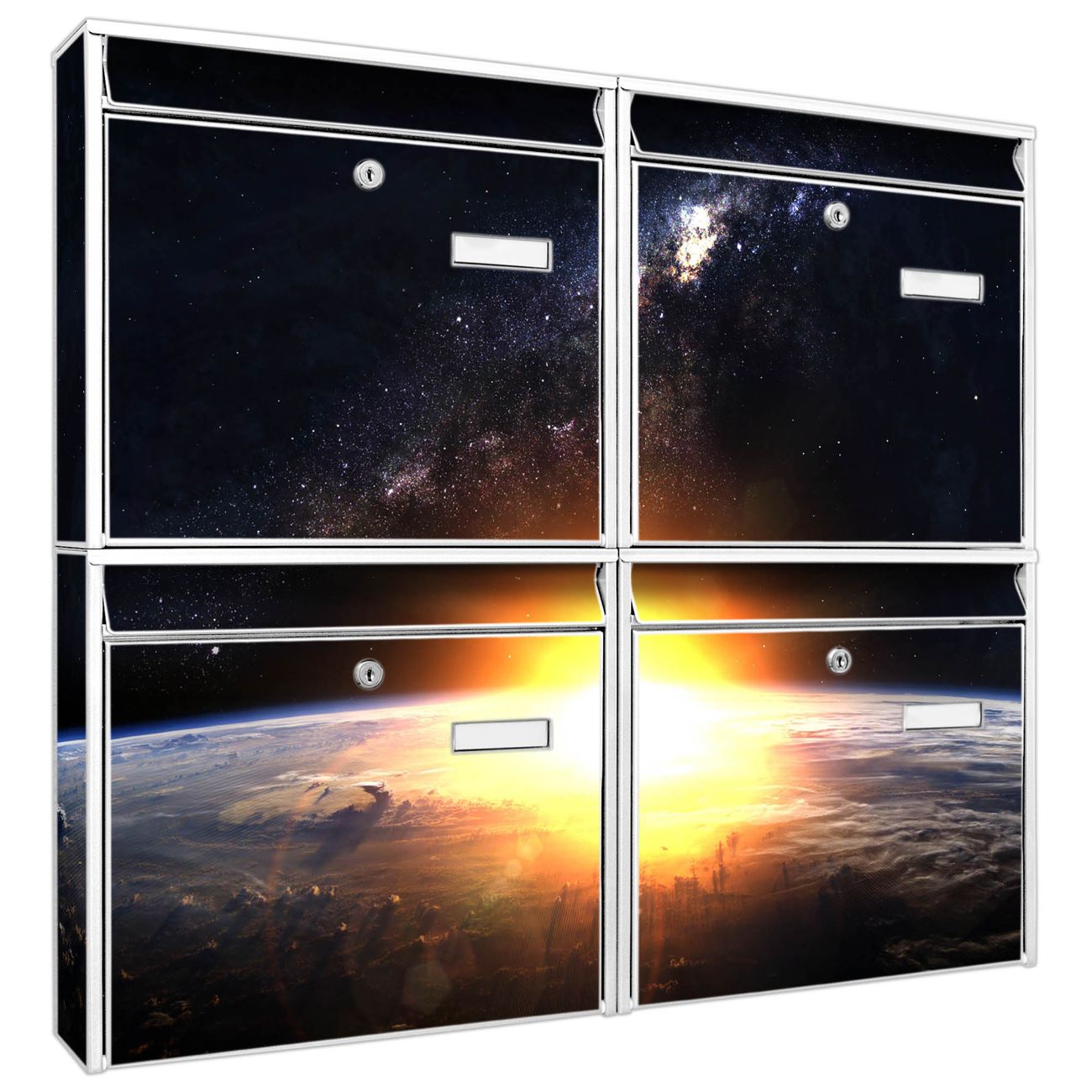 FUNKTION: Die Burg-Wächter Briefkastenanlage mit Motiv Sonne im Weltall bietet Ihnen ausreichend Fassungsvermögen um auch A4 und C4 Sendungen zu empfangen. Das integrierte Namensschild lässt sich individuell beschriften. Wählen Sie aus den Grundfarben weiß, silber und schwarz. DESIGN: Die 4 Briefkästen haben ein ansprechendes und zeitloses Design, ohne dabei auf Funktionalität zu verzichten. Das Material ist sehr stabil, wetterfest und rostfrei. Durch das Motiv Sonne im Weltall werden die Postkästen zu einem Blickfang. DETAILS: Die Postkästen bestehen aus verzinktem Stahl der zusätzlich mit Klarlack versiegelt wurde. Die Kästen sind gesamt 64,5cm hoch, 72,5cm breit und 10cm tief. Das Motiv besteht aus einer wetter- und UV-festen Folie, die Ihren Briefkasten zusätzlich vor Kratzern schützt. Die Postkästen werden mit Montagematerial, je einem Namensschild und je zwei Schlüsseln geliefert. NUTZEN: Das Briefkastenset eignet sich für die Wandmontage, die Größe bietet genügend Platz für Sendungen aller Art. Das zeitlose Design sowie die stabile Bauart bieten Ihnen einen treuen Begleiter für Ihre Post. BANJADO: