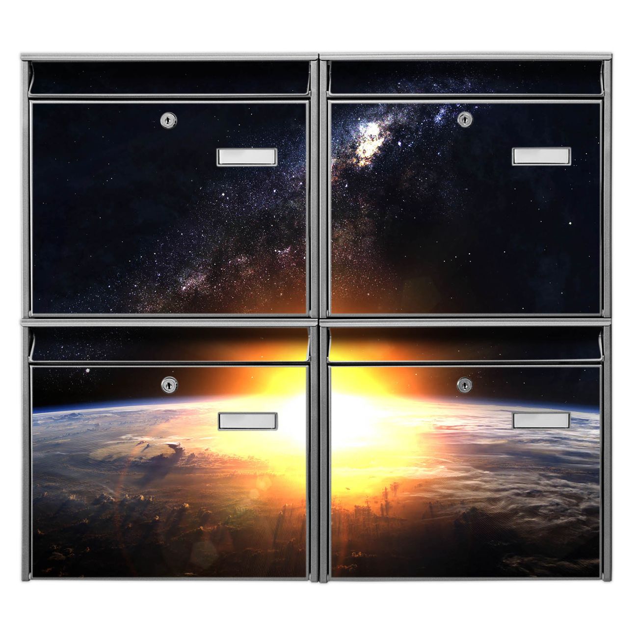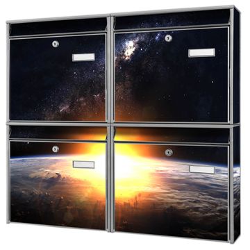 FUNKTION: Die Burg-Wächter Briefkastenanlage mit Motiv Sonne im Weltall bietet Ihnen ausreichend Fassungsvermögen um auch A4 und C4 Sendungen zu empfangen. Das integrierte Namensschild lässt sich individuell beschriften. Wählen Sie aus den Grundfarben weiß, silber und schwarz. DESIGN: Die 4 Briefkästen haben ein ansprechendes und zeitloses Design, ohne dabei auf Funktionalität zu verzichten. Das Material ist sehr stabil, wetterfest und rostfrei. Durch das Motiv Sonne im Weltall werden die Postkästen zu einem Blickfang. DETAILS: Die Postkästen bestehen aus verzinktem Stahl der zusätzlich mit Klarlack versiegelt wurde. Die Kästen sind gesamt 64,5cm hoch, 72,5cm breit und 10cm tief. Das Motiv besteht aus einer wetter- und UV-festen Folie, die Ihren Briefkasten zusätzlich vor Kratzern schützt. Die Postkästen werden mit Montagematerial, je einem Namensschild und je zwei Schlüsseln geliefert. NUTZEN: Das Briefkastenset eignet sich für die Wandmontage, die Größe bietet genügend Platz für Sendungen aller Art. Das zeitlose Design sowie die stabile Bauart bieten Ihnen einen treuen Begleiter für Ihre Post. BANJADO: