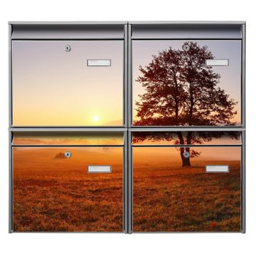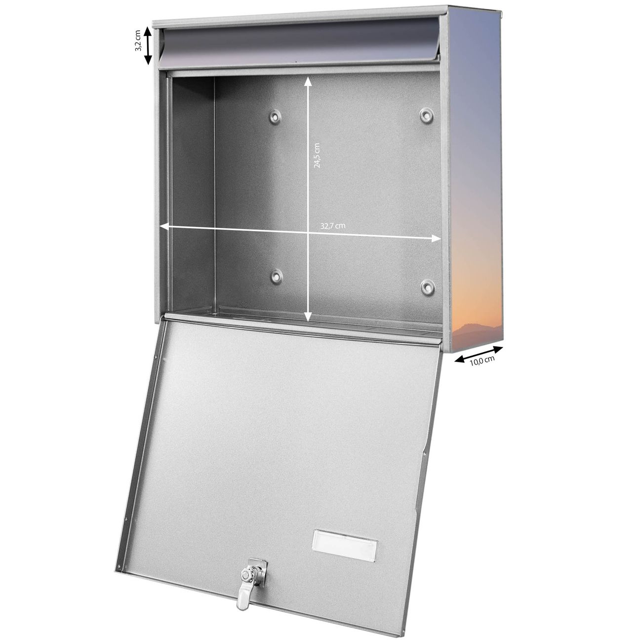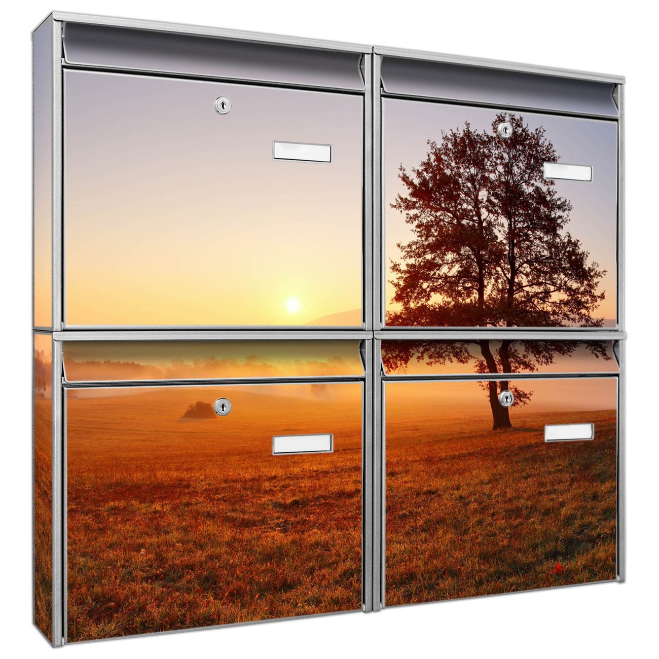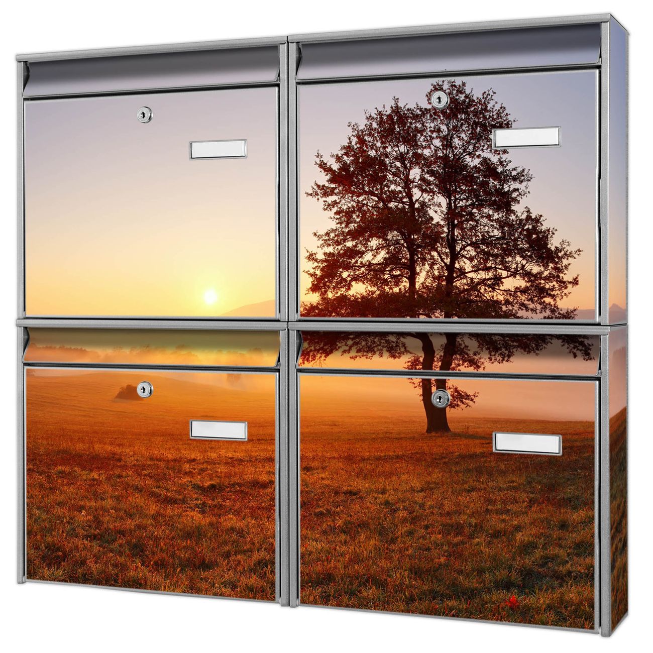 FUNKTION: Die Burg-Wächter Briefkastenanlage mit Motiv Sonnenaufgang bietet Ihnen ausreichend Fassungsvermögen um auch A4 und C4 Sendungen zu empfangen. Das integrierte Namensschild lässt sich individuell beschriften. Wählen Sie aus den Grundfarben weiß, silber und schwarz. DESIGN: Die 4 Briefkästen haben ein ansprechendes und zeitloses Design, ohne dabei auf Funktionalität zu verzichten. Das Material ist sehr stabil, wetterfest und rostfrei. Durch das Motiv Sonnenaufgang werden die Postkästen zu einem Blickfang. DETAILS: Die Postkästen bestehen aus verzinktem Stahl der zusätzlich mit Klarlack versiegelt wurde. Die Kästen sind gesamt 64,5cm hoch, 72,5cm breit und 10cm tief. Das Motiv besteht aus einer wetter- und UV-festen Folie, die Ihren Briefkasten zusätzlich vor Kratzern schützt. Die Postkästen werden mit Montagematerial, je einem Namensschild und je zwei Schlüsseln geliefert. NUTZEN: Das Briefkastenset eignet sich für die Wandmontage, die Größe bietet genügend Platz für Sendungen aller Art. Das zeitlose Design sowie die stabile Bauart bieten Ihnen einen treuen Begleiter für Ihre Post. BANJADO: