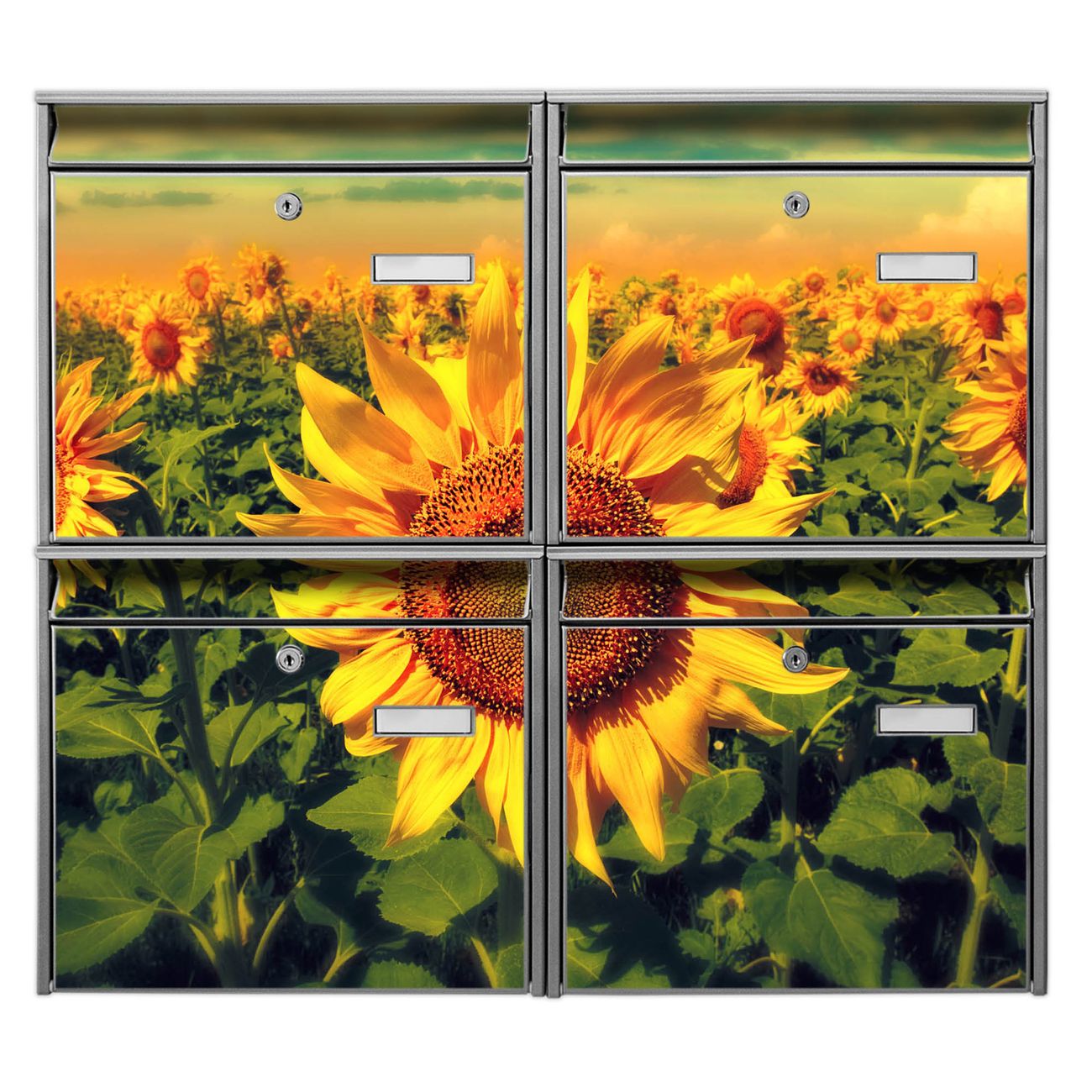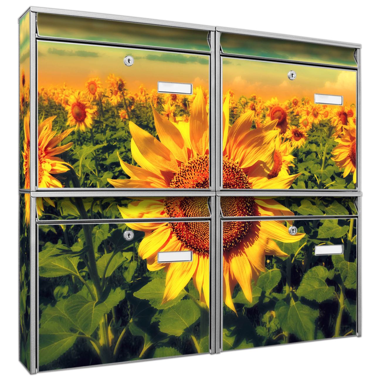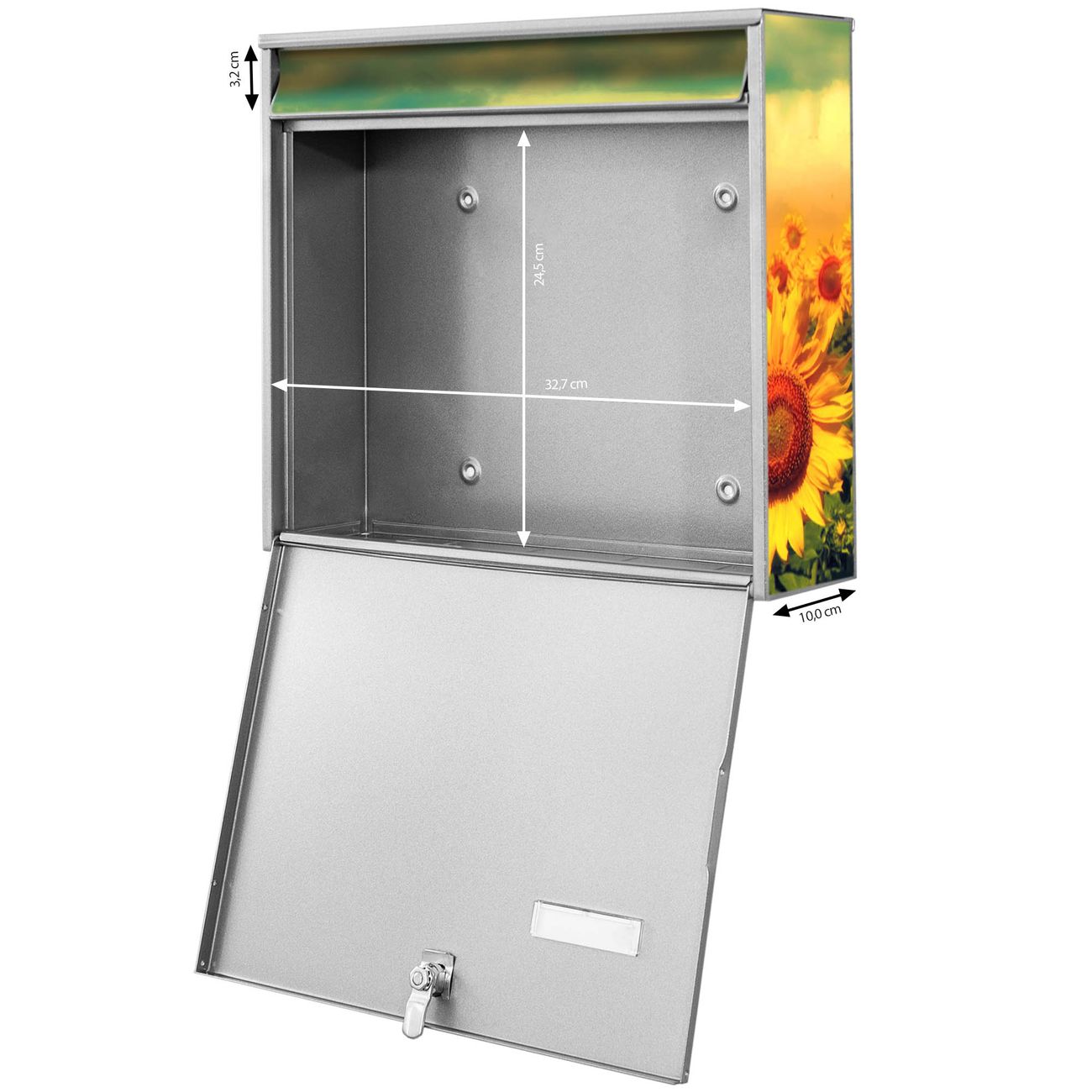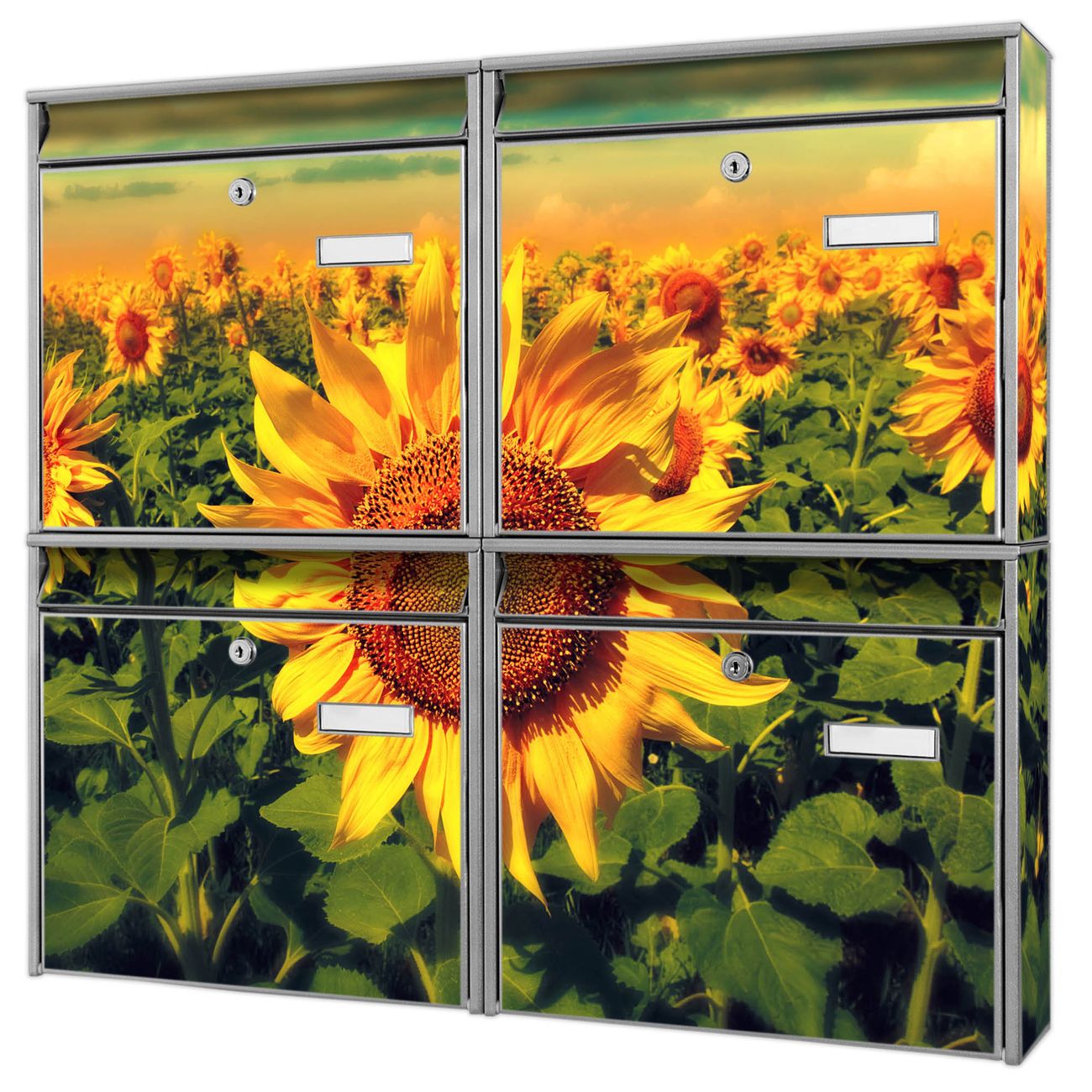 FUNKTION: Die Burg-Wächter Briefkastenanlage mit Motiv Sonnenblumen bietet Ihnen ausreichend Fassungsvermögen um auch A4 und C4 Sendungen zu empfangen. Das integrierte Namensschild lässt sich individuell beschriften. Wählen Sie aus den Grundfarben weiß, silber und schwarz. DESIGN: Die 4 Briefkästen haben ein ansprechendes und zeitloses Design, ohne dabei auf Funktionalität zu verzichten. Das Material ist sehr stabil, wetterfest und rostfrei. Durch das Motiv Sonnenblumen werden die Postkästen zu einem Blickfang. DETAILS: Die Postkästen bestehen aus verzinktem Stahl der zusätzlich mit Klarlack versiegelt wurde. Die Kästen sind gesamt 64,5cm hoch, 72,5cm breit und 10cm tief. Das Motiv besteht aus einer wetter- und UV-festen Folie, die Ihren Briefkasten zusätzlich vor Kratzern schützt. Die Postkästen werden mit Montagematerial, je einem Namensschild und je zwei Schlüsseln geliefert. NUTZEN: Das Briefkastenset eignet sich für die Wandmontage, die Größe bietet genügend Platz für Sendungen aller Art. Das zeitlose Design sowie die stabile Bauart bieten Ihnen einen treuen Begleiter für Ihre Post. BANJADO: