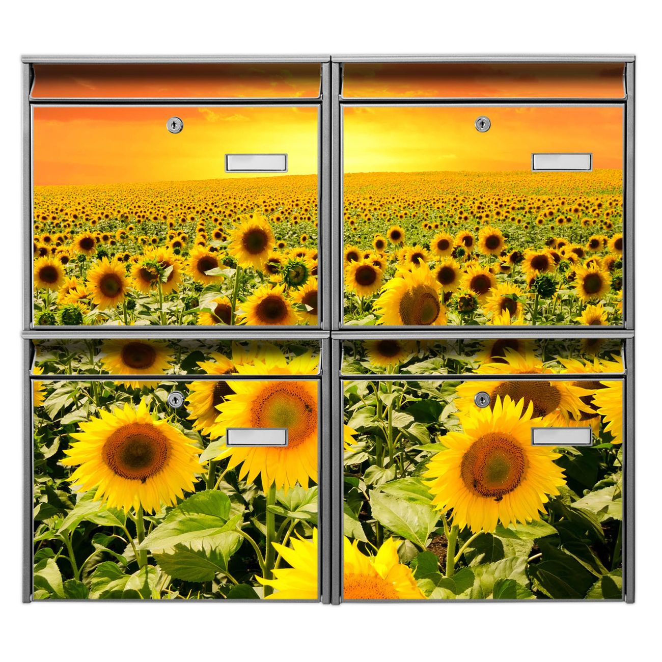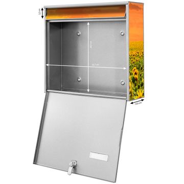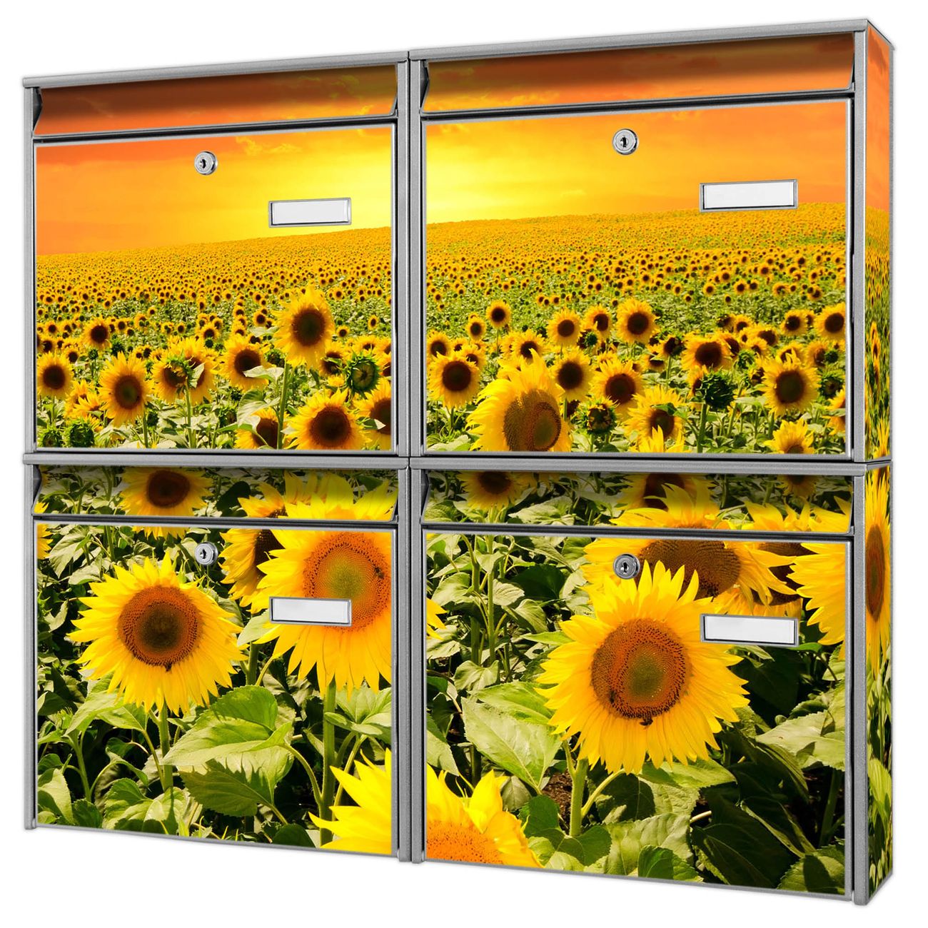 FUNKTION: Die Burg-Wächter Briefkastenanlage mit Motiv Sonnenblumenmeer bietet Ihnen ausreichend Fassungsvermögen um auch A4 und C4 Sendungen zu empfangen. Das integrierte Namensschild lässt sich individuell beschriften. Wählen Sie aus den Grundfarben weiß, silber und schwarz. DESIGN: Die 4 Briefkästen haben ein ansprechendes und zeitloses Design, ohne dabei auf Funktionalität zu verzichten. Das Material ist sehr stabil, wetterfest und rostfrei. Durch das Motiv Sonnenblumenmeer werden die Postkästen zu einem Blickfang. DETAILS: Die Postkästen bestehen aus verzinktem Stahl der zusätzlich mit Klarlack versiegelt wurde. Die Kästen sind gesamt 64,5cm hoch, 72,5cm breit und 10cm tief. Das Motiv besteht aus einer wetter- und UV-festen Folie, die Ihren Briefkasten zusätzlich vor Kratzern schützt. Die Postkästen werden mit Montagematerial, je einem Namensschild und je zwei Schlüsseln geliefert. NUTZEN: Das Briefkastenset eignet sich für die Wandmontage, die Größe bietet genügend Platz für Sendungen aller Art. Das zeitlose Design sowie die stabile Bauart bieten Ihnen einen treuen Begleiter für Ihre Post. BANJADO: