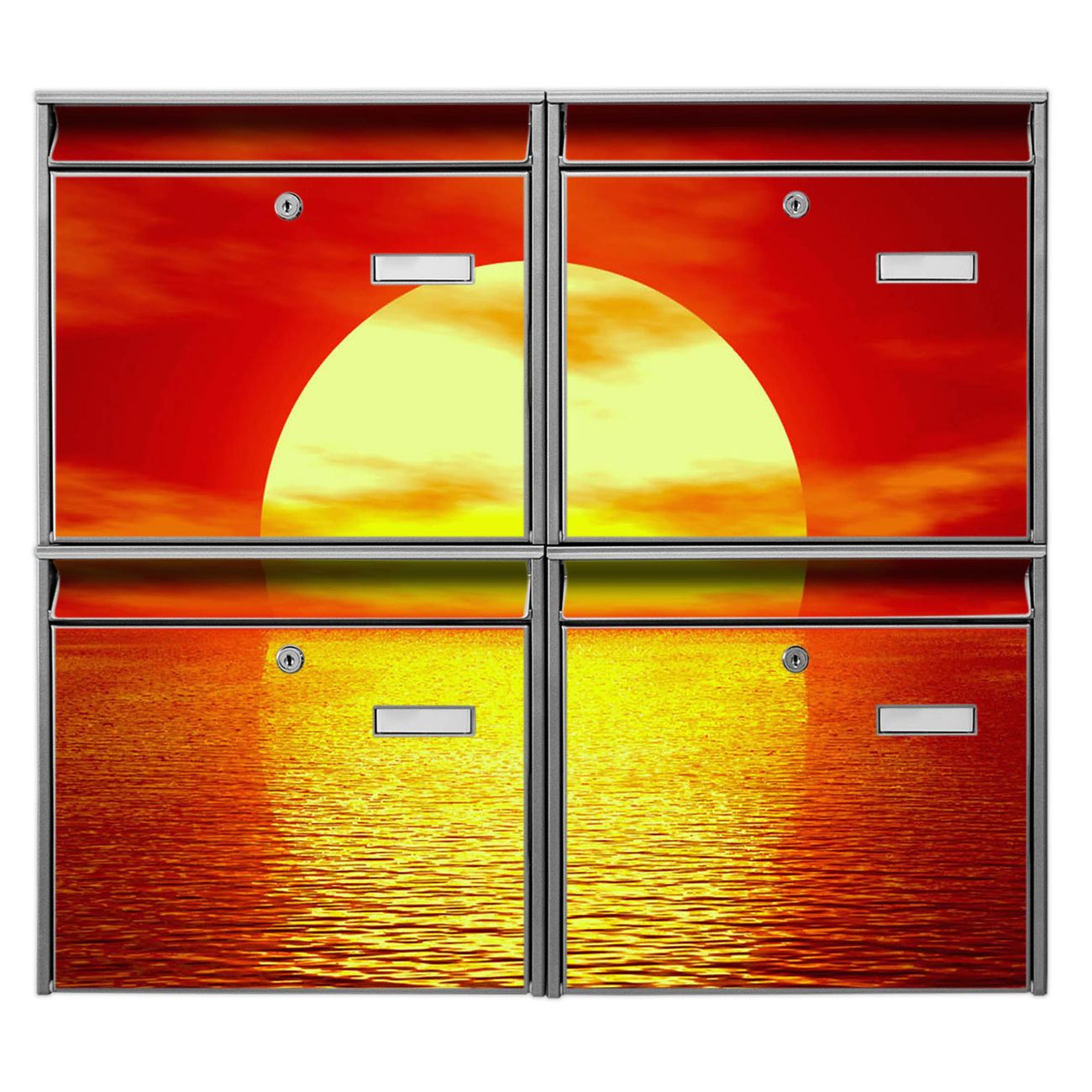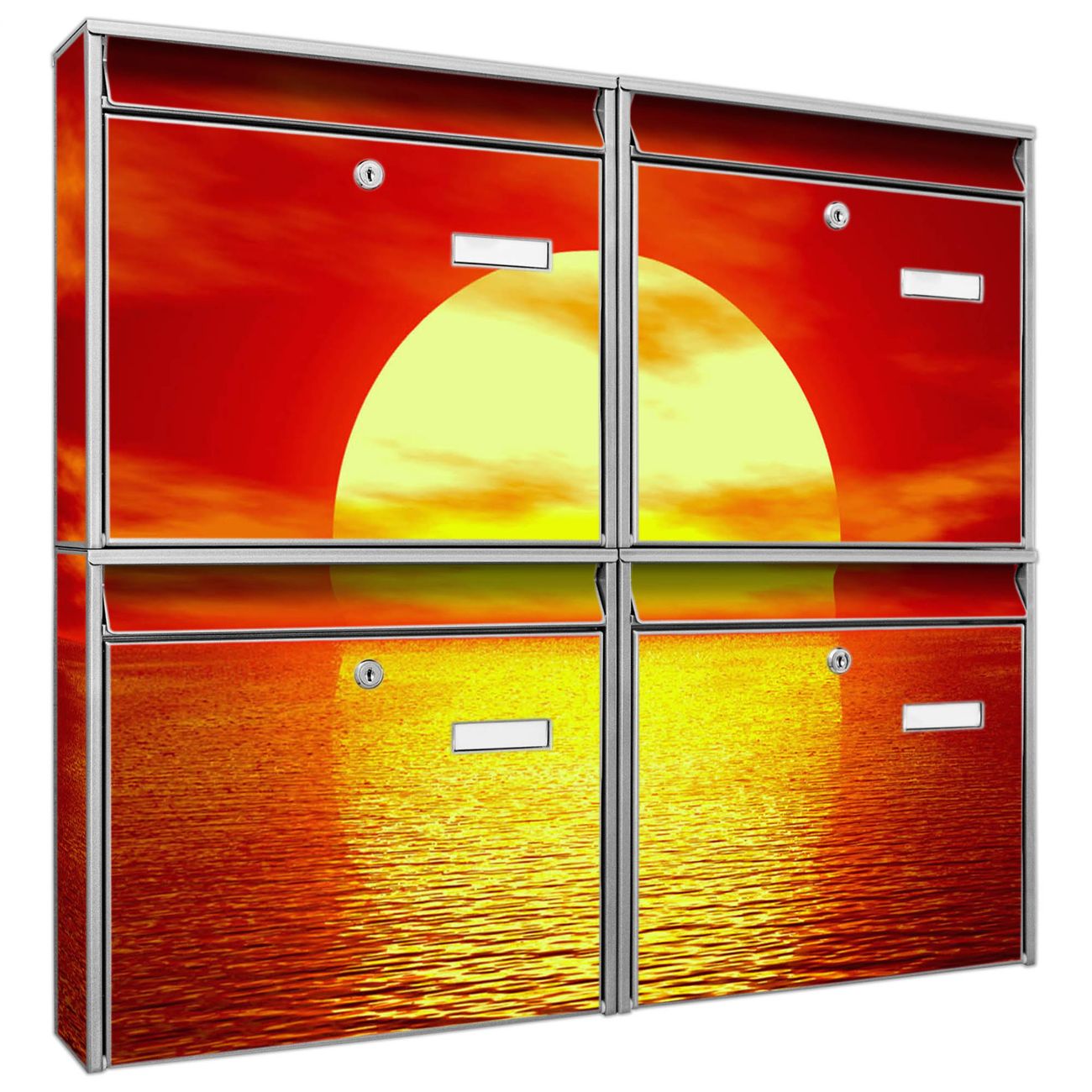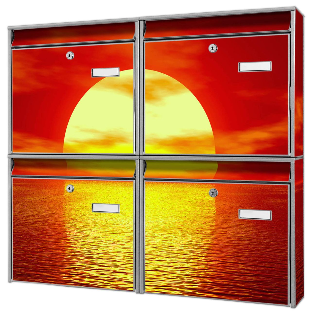 FUNKTION: Die Burg-Wächter Briefkastenanlage mit Motiv Sonnenuntergang bietet Ihnen ausreichend Fassungsvermögen um auch A4 und C4 Sendungen zu empfangen. Das integrierte Namensschild lässt sich individuell beschriften. Wählen Sie aus den Grundfarben weiß, silber und schwarz. DESIGN: Die 4 Briefkästen haben ein ansprechendes und zeitloses Design, ohne dabei auf Funktionalität zu verzichten. Das Material ist sehr stabil, wetterfest und rostfrei. Durch das Motiv Sonnenuntergang werden die Postkästen zu einem Blickfang. DETAILS: Die Postkästen bestehen aus verzinktem Stahl der zusätzlich mit Klarlack versiegelt wurde. Die Kästen sind gesamt 64,5cm hoch, 72,5cm breit und 10cm tief. Das Motiv besteht aus einer wetter- und UV-festen Folie, die Ihren Briefkasten zusätzlich vor Kratzern schützt. Die Postkästen werden mit Montagematerial, je einem Namensschild und je zwei Schlüsseln geliefert. NUTZEN: Das Briefkastenset eignet sich für die Wandmontage, die Größe bietet genügend Platz für Sendungen aller Art. Das zeitlose Design sowie die stabile Bauart bieten Ihnen einen treuen Begleiter für Ihre Post. BANJADO: