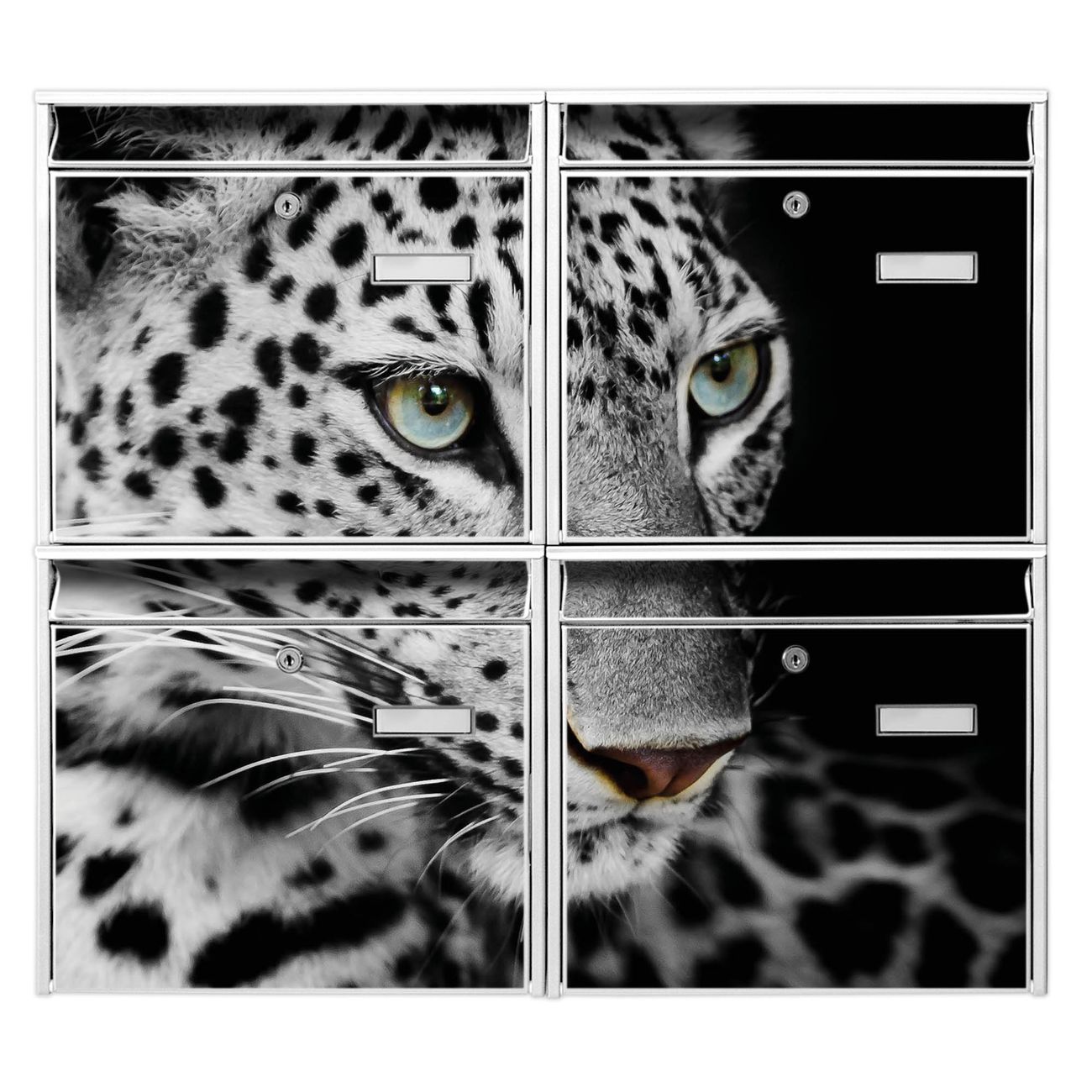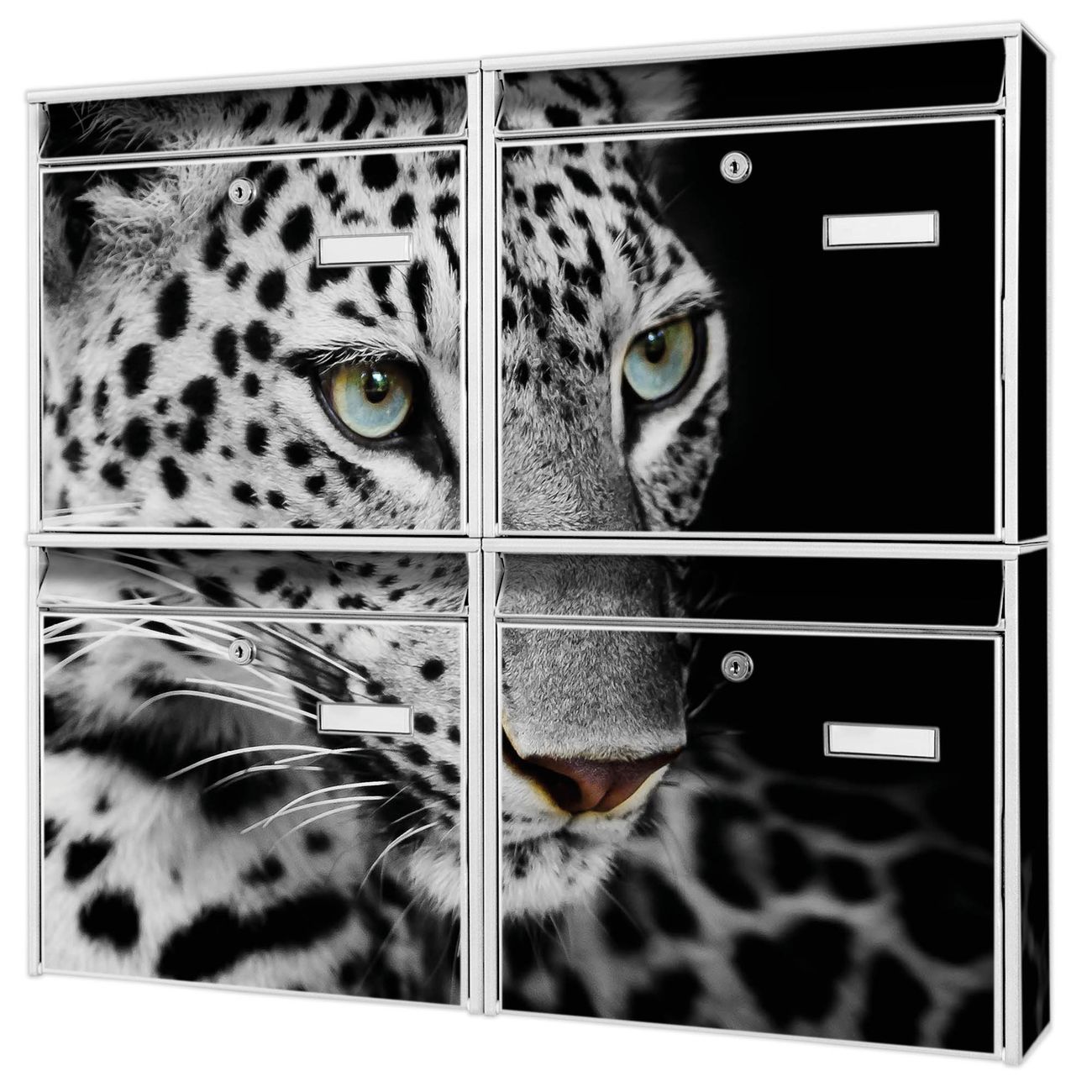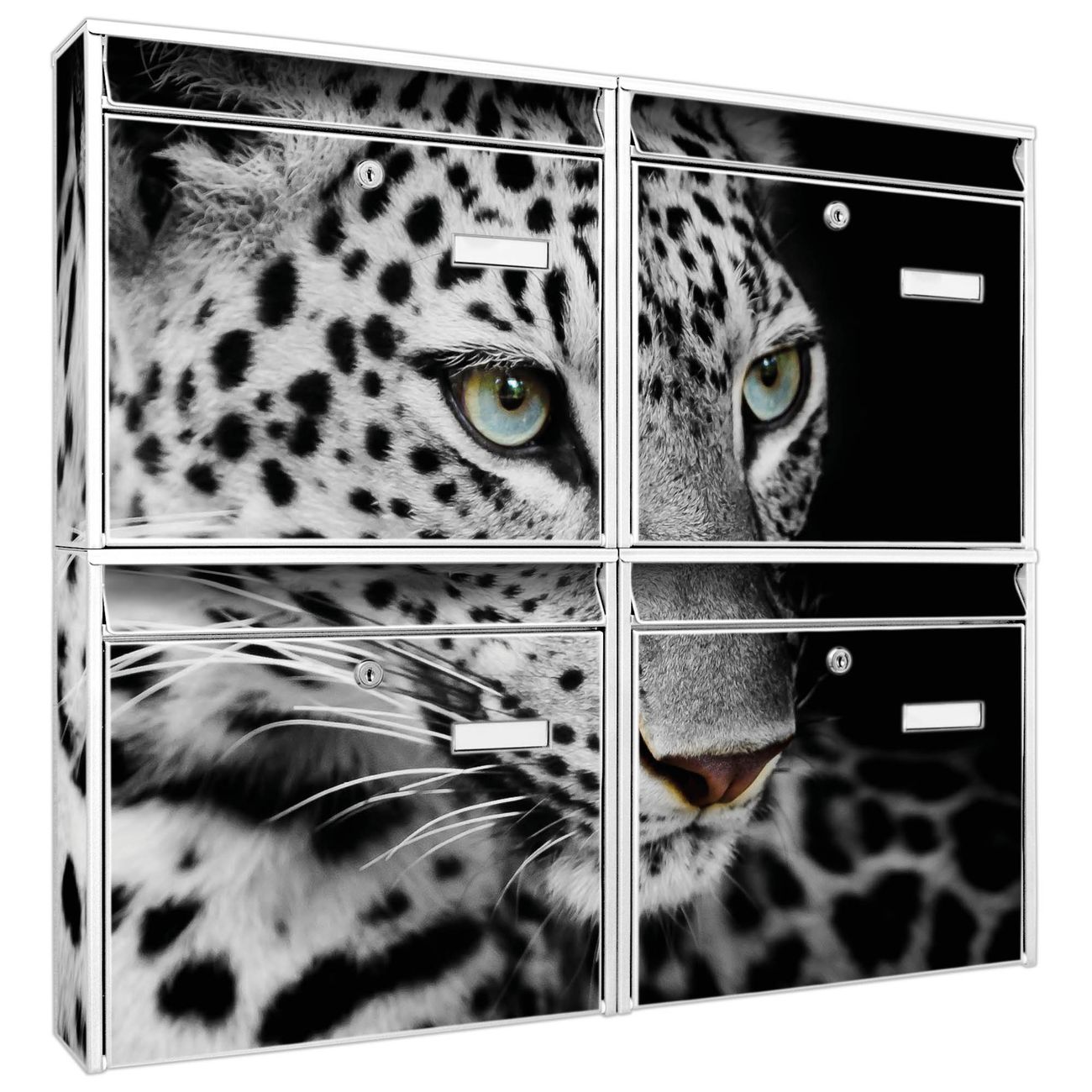 FUNKTION: Die Burg-Wächter Briefkastenanlage mit Motiv Sophie bietet Ihnen ausreichend Fassungsvermögen um auch A4 und C4 Sendungen zu empfangen. Das integrierte Namensschild lässt sich individuell beschriften. Wählen Sie aus den Grundfarben weiß, silber und schwarz. DESIGN: Die 4 Briefkästen haben ein ansprechendes und zeitloses Design, ohne dabei auf Funktionalität zu verzichten. Das Material ist sehr stabil, wetterfest und rostfrei. Durch das Motiv Sophie werden die Postkästen zu einem Blickfang. DETAILS: Die Postkästen bestehen aus verzinktem Stahl der zusätzlich mit Klarlack versiegelt wurde. Die Kästen sind gesamt 64,5cm hoch, 72,5cm breit und 10cm tief. Das Motiv besteht aus einer wetter- und UV-festen Folie, die Ihren Briefkasten zusätzlich vor Kratzern schützt. Die Postkästen werden mit Montagematerial, je einem Namensschild und je zwei Schlüsseln geliefert. NUTZEN: Das Briefkastenset eignet sich für die Wandmontage, die Größe bietet genügend Platz für Sendungen aller Art. Das zeitlose Design sowie die stabile Bauart bieten Ihnen einen treuen Begleiter für Ihre Post. BANJADO: