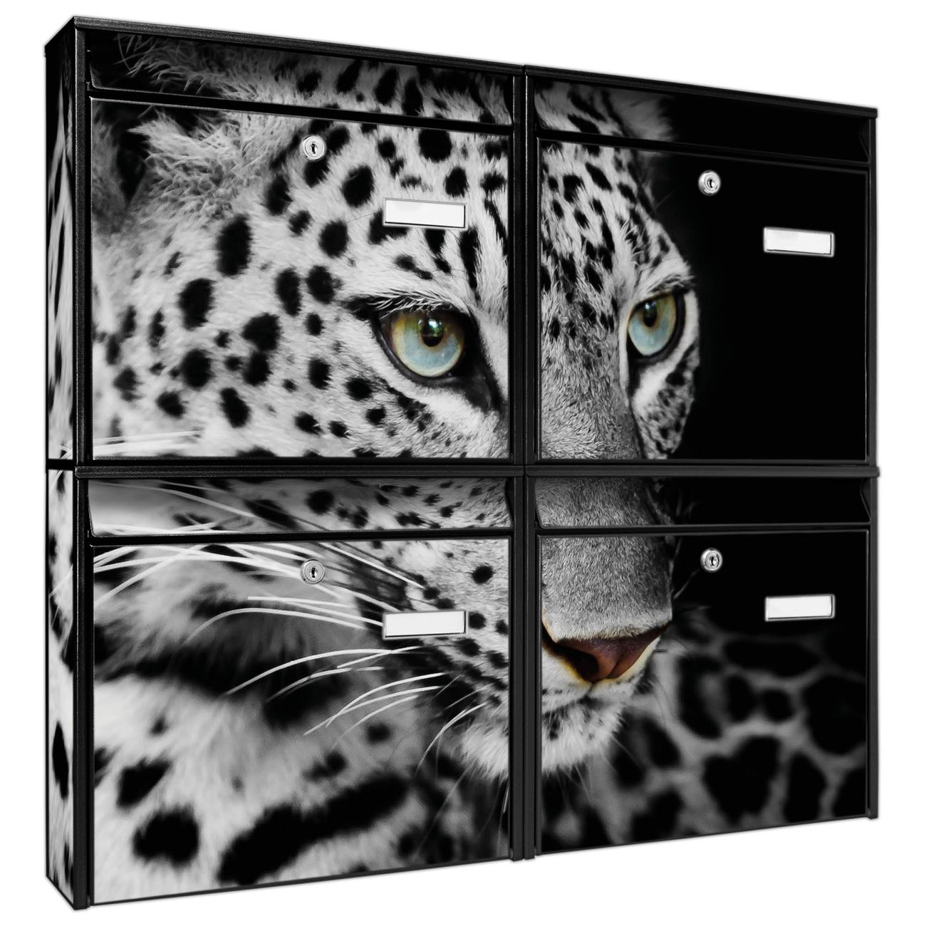 FUNKTION: Die Burg-Wächter Briefkastenanlage mit Motiv Sophie bietet Ihnen ausreichend Fassungsvermögen um auch A4 und C4 Sendungen zu empfangen. Das integrierte Namensschild lässt sich individuell beschriften. Wählen Sie aus den Grundfarben weiß, silber und schwarz. DESIGN: Die 4 Briefkästen haben ein ansprechendes und zeitloses Design, ohne dabei auf Funktionalität zu verzichten. Das Material ist sehr stabil, wetterfest und rostfrei. Durch das Motiv Sophie werden die Postkästen zu einem Blickfang. DETAILS: Die Postkästen bestehen aus verzinktem Stahl der zusätzlich mit Klarlack versiegelt wurde. Die Kästen sind gesamt 64,5cm hoch, 72,5cm breit und 10cm tief. Das Motiv besteht aus einer wetter- und UV-festen Folie, die Ihren Briefkasten zusätzlich vor Kratzern schützt. Die Postkästen werden mit Montagematerial, je einem Namensschild und je zwei Schlüsseln geliefert. NUTZEN: Das Briefkastenset eignet sich für die Wandmontage, die Größe bietet genügend Platz für Sendungen aller Art. Das zeitlose Design sowie die stabile Bauart bieten Ihnen einen treuen Begleiter für Ihre Post. BANJADO: