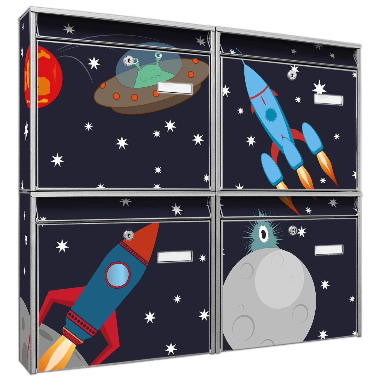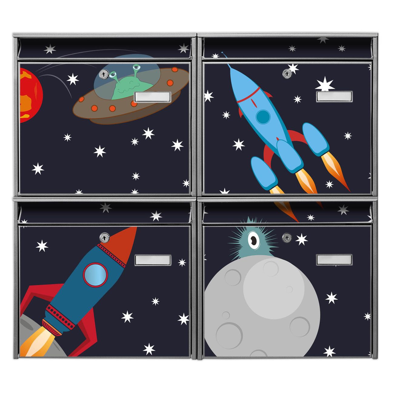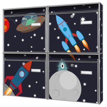 FUNKTION: Die Burg-Wächter Briefkastenanlage mit Motiv Space Traffic bietet Ihnen ausreichend Fassungsvermögen um auch A4 und C4 Sendungen zu empfangen. Das integrierte Namensschild lässt sich individuell beschriften. Wählen Sie aus den Grundfarben weiß, silber und schwarz. DESIGN: Die 4 Briefkästen haben ein ansprechendes und zeitloses Design, ohne dabei auf Funktionalität zu verzichten. Das Material ist sehr stabil, wetterfest und rostfrei. Durch das Motiv Space Traffic werden die Postkästen zu einem Blickfang. DETAILS: Die Postkästen bestehen aus verzinktem Stahl der zusätzlich mit Klarlack versiegelt wurde. Die Kästen sind gesamt 64,5cm hoch, 72,5cm breit und 10cm tief. Das Motiv besteht aus einer wetter- und UV-festen Folie, die Ihren Briefkasten zusätzlich vor Kratzern schützt. Die Postkästen werden mit Montagematerial, je einem Namensschild und je zwei Schlüsseln geliefert. NUTZEN: Das Briefkastenset eignet sich für die Wandmontage, die Größe bietet genügend Platz für Sendungen aller Art. Das zeitlose Design sowie die stabile Bauart bieten Ihnen einen treuen Begleiter für Ihre Post. BANJADO: