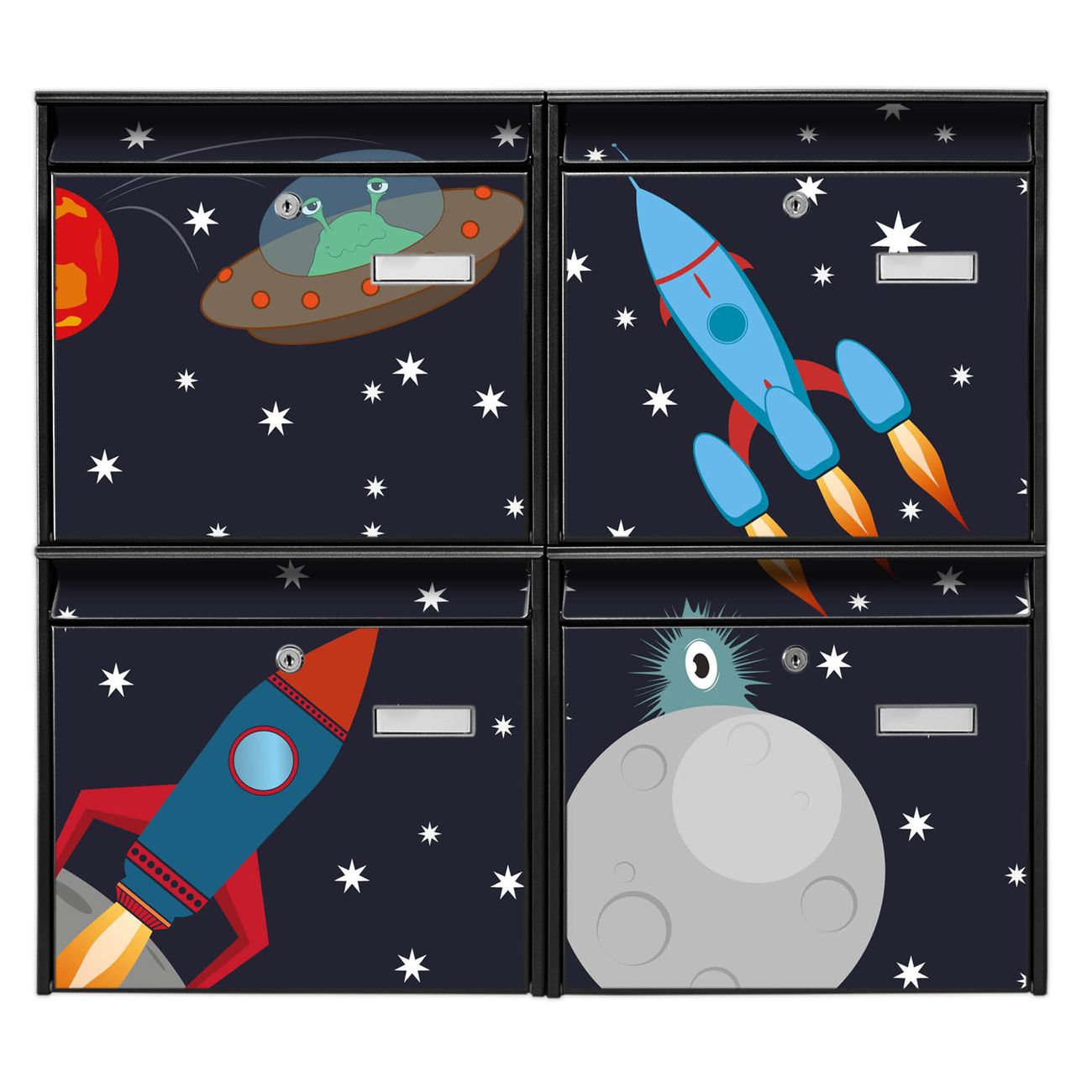 FUNKTION: Die Burg-Wächter Briefkastenanlage mit Motiv Space Traffic bietet Ihnen ausreichend Fassungsvermögen um auch A4 und C4 Sendungen zu empfangen. Das integrierte Namensschild lässt sich individuell beschriften. Wählen Sie aus den Grundfarben weiß, silber und schwarz. DESIGN: Die 4 Briefkästen haben ein ansprechendes und zeitloses Design, ohne dabei auf Funktionalität zu verzichten. Das Material ist sehr stabil, wetterfest und rostfrei. Durch das Motiv Space Traffic werden die Postkästen zu einem Blickfang. DETAILS: Die Postkästen bestehen aus verzinktem Stahl der zusätzlich mit Klarlack versiegelt wurde. Die Kästen sind gesamt 64,5cm hoch, 72,5cm breit und 10cm tief. Das Motiv besteht aus einer wetter- und UV-festen Folie, die Ihren Briefkasten zusätzlich vor Kratzern schützt. Die Postkästen werden mit Montagematerial, je einem Namensschild und je zwei Schlüsseln geliefert. NUTZEN: Das Briefkastenset eignet sich für die Wandmontage, die Größe bietet genügend Platz für Sendungen aller Art. Das zeitlose Design sowie die stabile Bauart bieten Ihnen einen treuen Begleiter für Ihre Post. BANJADO: