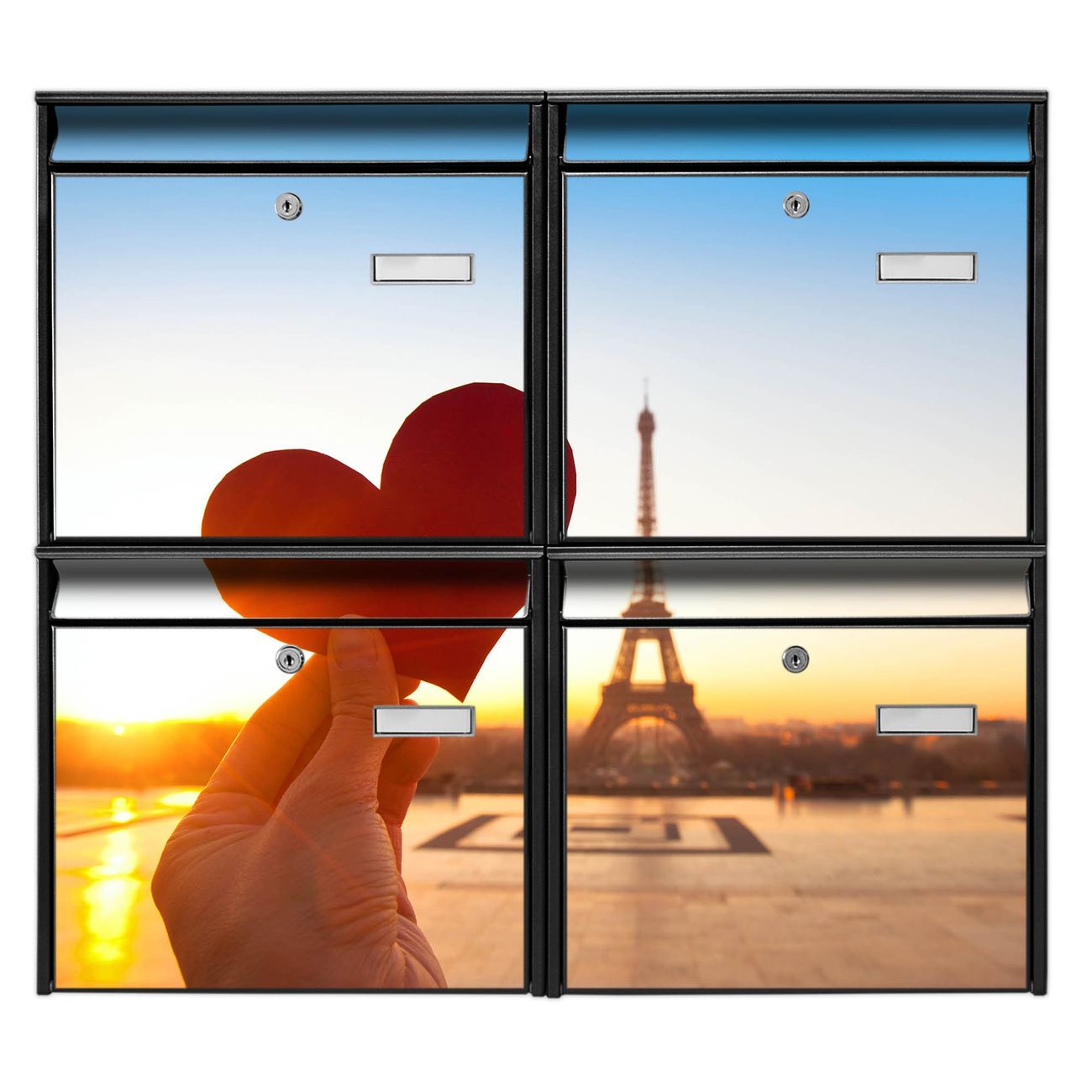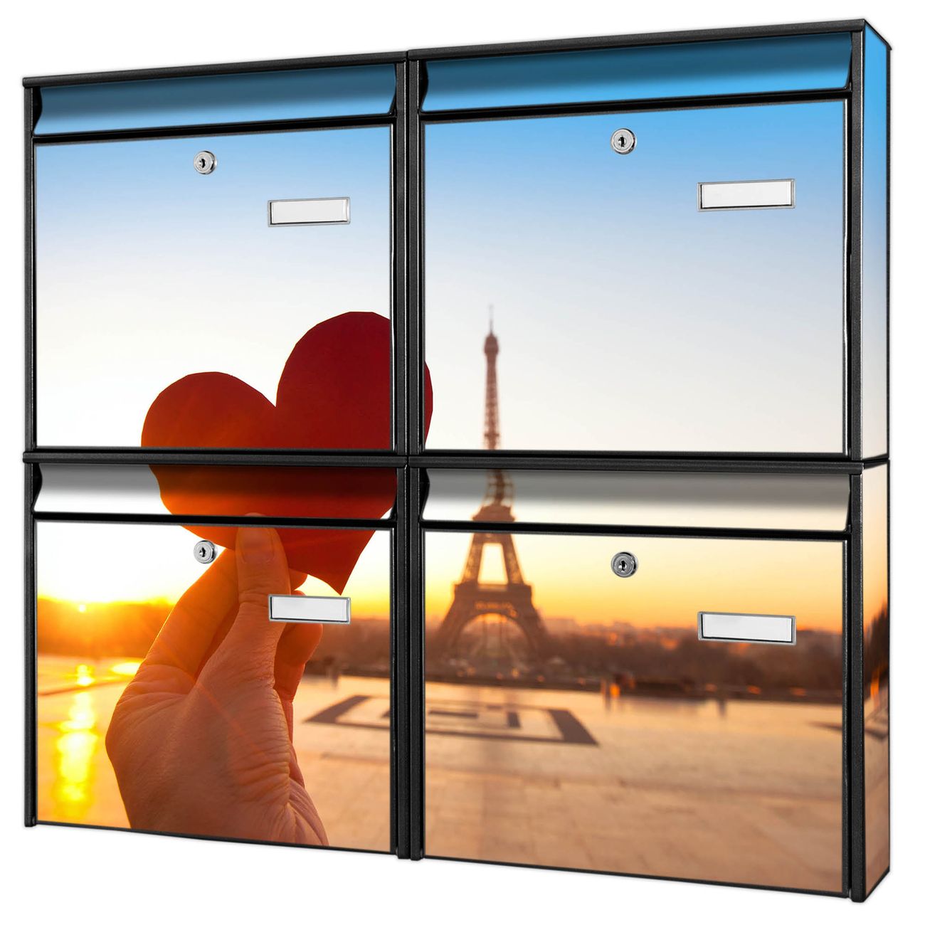 FUNKTION: Die Burg-Wächter Briefkastenanlage mit Motiv Stadt Der Liebe bietet Ihnen ausreichend Fassungsvermögen um auch A4 und C4 Sendungen zu empfangen. Das integrierte Namensschild lässt sich individuell beschriften. Wählen Sie aus den Grundfarben weiß, silber und schwarz. DESIGN: Die 4 Briefkästen haben ein ansprechendes und zeitloses Design, ohne dabei auf Funktionalität zu verzichten. Das Material ist sehr stabil, wetterfest und rostfrei. Durch das Motiv Stadt Der Liebe werden die Postkästen zu einem Blickfang. DETAILS: Die Postkästen bestehen aus verzinktem Stahl der zusätzlich mit Klarlack versiegelt wurde. Die Kästen sind gesamt 64,5cm hoch, 72,5cm breit und 10cm tief. Das Motiv besteht aus einer wetter- und UV-festen Folie, die Ihren Briefkasten zusätzlich vor Kratzern schützt. Die Postkästen werden mit Montagematerial, je einem Namensschild und je zwei Schlüsseln geliefert. NUTZEN: Das Briefkastenset eignet sich für die Wandmontage, die Größe bietet genügend Platz für Sendungen aller Art. Das zeitlose Design sowie die stabile Bauart bieten Ihnen einen treuen Begleiter für Ihre Post. BANJADO: