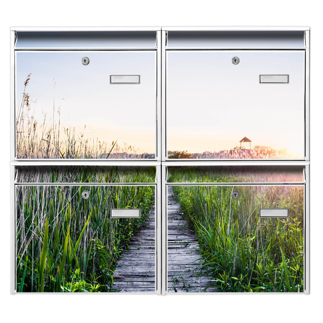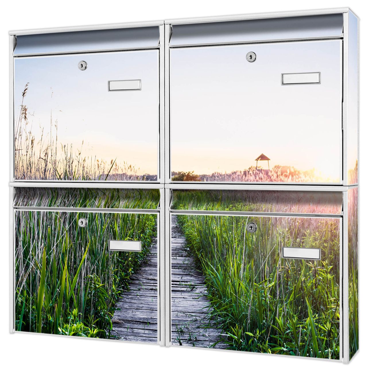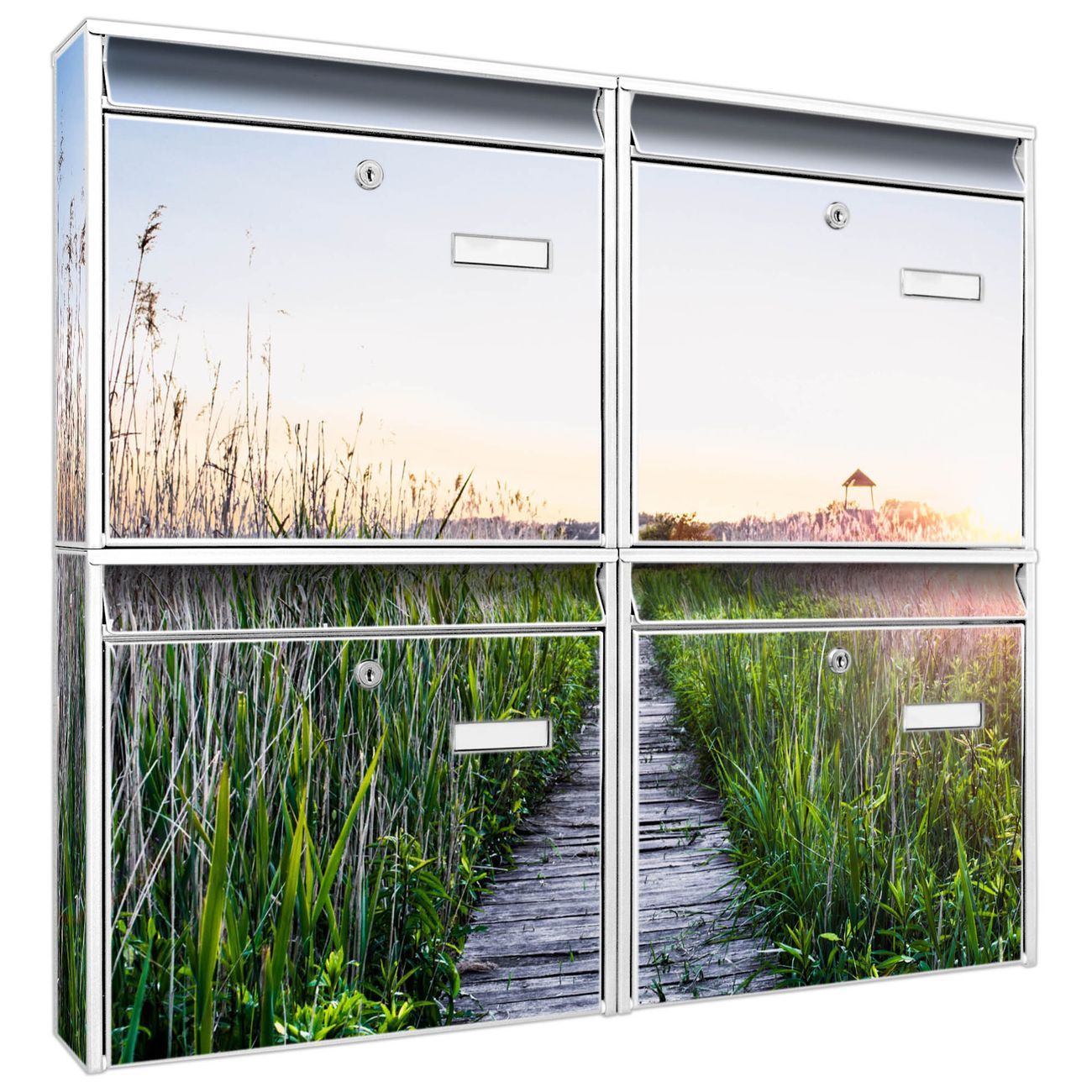 FUNKTION: Die Burg-Wächter Briefkastenanlage mit Motiv Steg Durchs Schilf bietet Ihnen ausreichend Fassungsvermögen um auch A4 und C4 Sendungen zu empfangen. Das integrierte Namensschild lässt sich individuell beschriften. Wählen Sie aus den Grundfarben weiß, silber und schwarz. DESIGN: Die 4 Briefkästen haben ein ansprechendes und zeitloses Design, ohne dabei auf Funktionalität zu verzichten. Das Material ist sehr stabil, wetterfest und rostfrei. Durch das Motiv Steg Durchs Schilf werden die Postkästen zu einem Blickfang. DETAILS: Die Postkästen bestehen aus verzinktem Stahl der zusätzlich mit Klarlack versiegelt wurde. Die Kästen sind gesamt 64,5cm hoch, 72,5cm breit und 10cm tief. Das Motiv besteht aus einer wetter- und UV-festen Folie, die Ihren Briefkasten zusätzlich vor Kratzern schützt. Die Postkästen werden mit Montagematerial, je einem Namensschild und je zwei Schlüsseln geliefert. NUTZEN: Das Briefkastenset eignet sich für die Wandmontage, die Größe bietet genügend Platz für Sendungen aller Art. Das zeitlose Design sowie die stabile Bauart bieten Ihnen einen treuen Begleiter für Ihre Post. BANJADO: