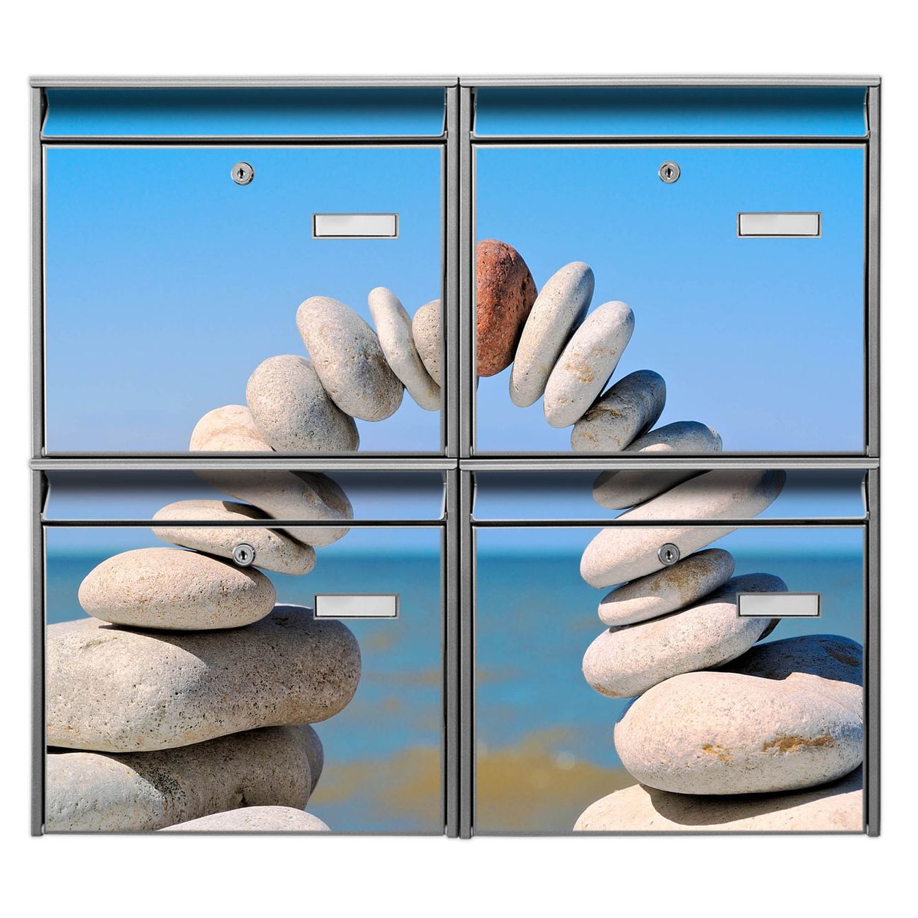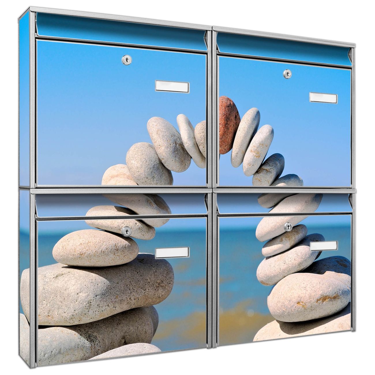 FUNKTION: Die Burg-Wächter Briefkastenanlage mit Motiv Steine&Meer bietet Ihnen ausreichend Fassungsvermögen um auch A4 und C4 Sendungen zu empfangen. Das integrierte Namensschild lässt sich individuell beschriften. Wählen Sie aus den Grundfarben weiß, silber und schwarz. DESIGN: Die 4 Briefkästen haben ein ansprechendes und zeitloses Design, ohne dabei auf Funktionalität zu verzichten. Das Material ist sehr stabil, wetterfest und rostfrei. Durch das Motiv Steine&Meer werden die Postkästen zu einem Blickfang. DETAILS: Die Postkästen bestehen aus verzinktem Stahl der zusätzlich mit Klarlack versiegelt wurde. Die Kästen sind gesamt 64,5cm hoch, 72,5cm breit und 10cm tief. Das Motiv besteht aus einer wetter- und UV-festen Folie, die Ihren Briefkasten zusätzlich vor Kratzern schützt. Die Postkästen werden mit Montagematerial, je einem Namensschild und je zwei Schlüsseln geliefert. NUTZEN: Das Briefkastenset eignet sich für die Wandmontage, die Größe bietet genügend Platz für Sendungen aller Art. Das zeitlose Design sowie die stabile Bauart bieten Ihnen einen treuen Begleiter für Ihre Post. BANJADO: