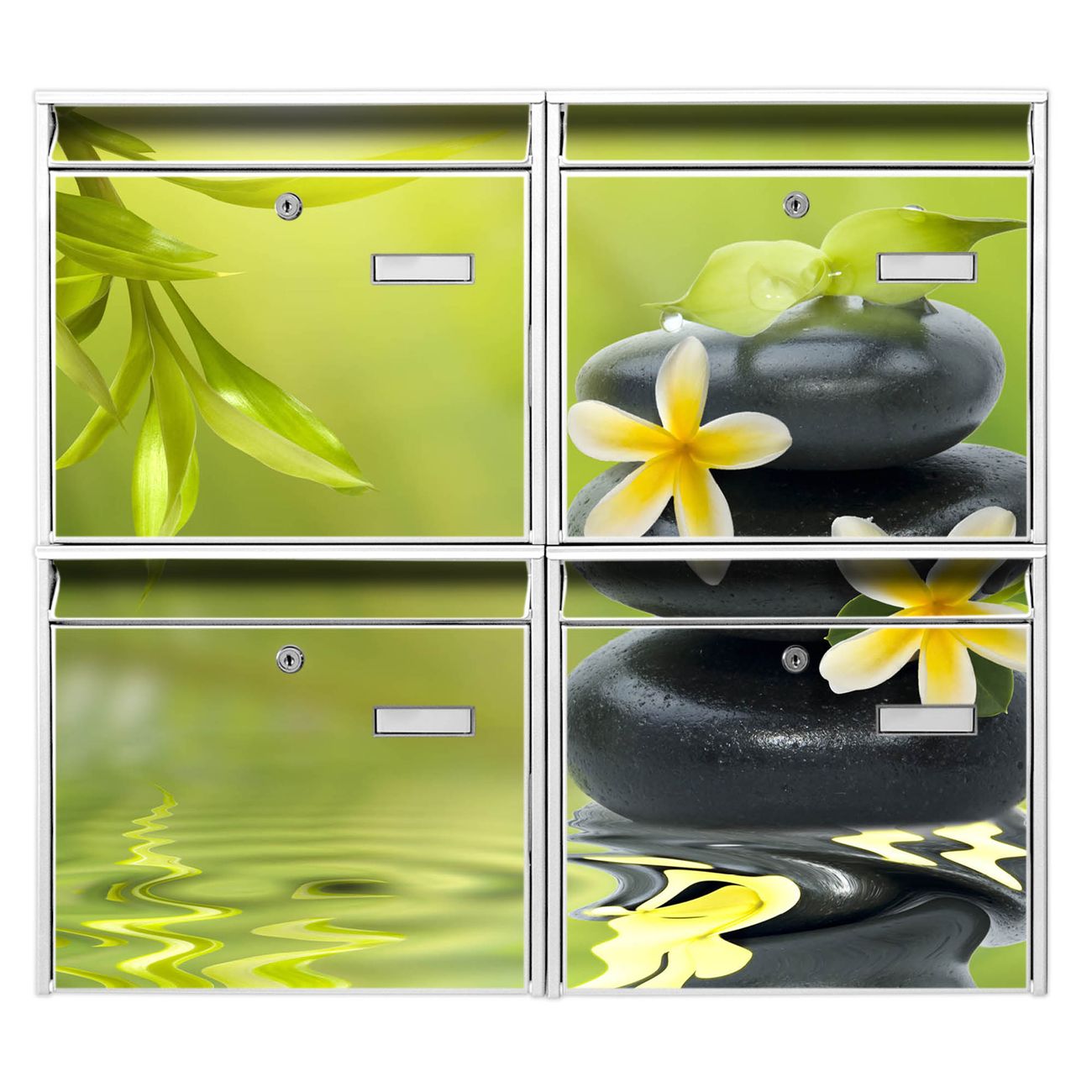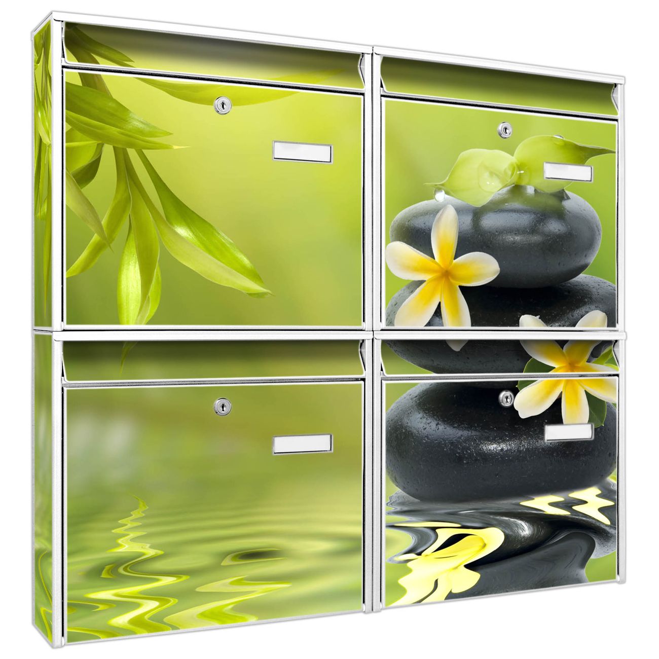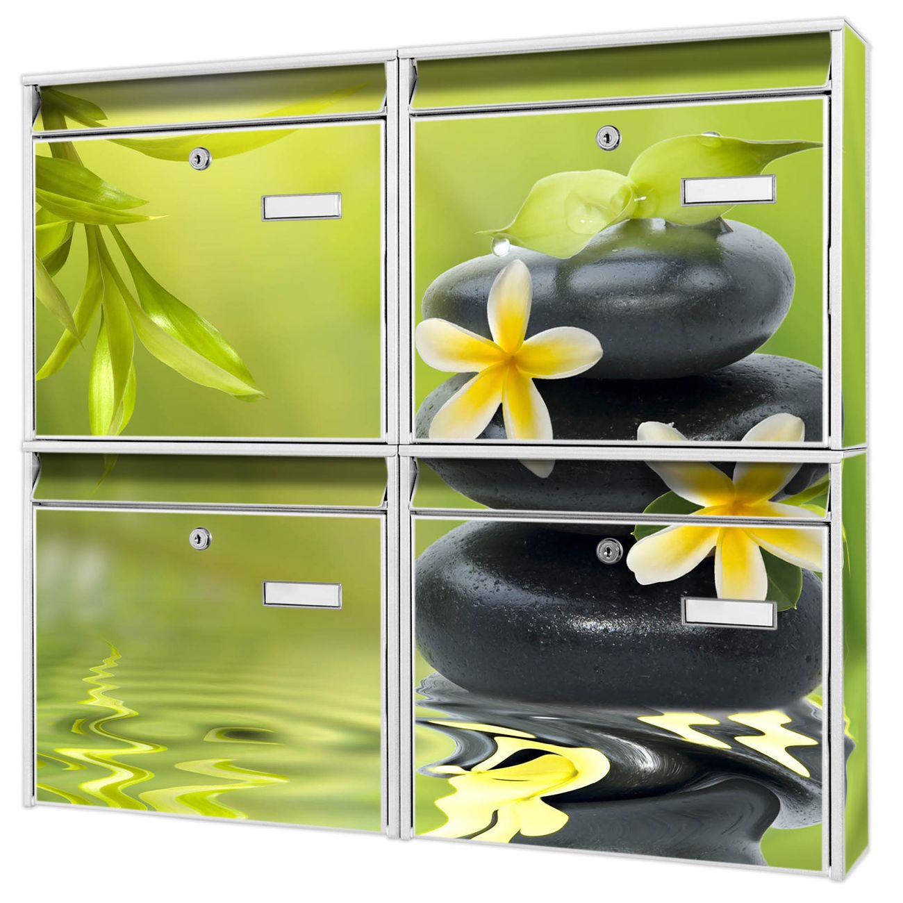 FUNKTION: Die Burg-Wächter Briefkastenanlage mit Motiv Steine & Relax 4 bietet Ihnen ausreichend Fassungsvermögen um auch A4 und C4 Sendungen zu empfangen. Das integrierte Namensschild lässt sich individuell beschriften. Wählen Sie aus den Grundfarben weiß, silber und schwarz. DESIGN: Die 4 Briefkästen haben ein ansprechendes und zeitloses Design, ohne dabei auf Funktionalität zu verzichten. Das Material ist sehr stabil, wetterfest und rostfrei. Durch das Motiv Steine & Relax 4 werden die Postkästen zu einem Blickfang. DETAILS: Die Postkästen bestehen aus verzinktem Stahl der zusätzlich mit Klarlack versiegelt wurde. Die Kästen sind gesamt 64,5cm hoch, 72,5cm breit und 10cm tief. Das Motiv besteht aus einer wetter- und UV-festen Folie, die Ihren Briefkasten zusätzlich vor Kratzern schützt. Die Postkästen werden mit Montagematerial, je einem Namensschild und je zwei Schlüsseln geliefert. NUTZEN: Das Briefkastenset eignet sich für die Wandmontage, die Größe bietet genügend Platz für Sendungen aller Art. Das zeitlose Design sowie die stabile Bauart bieten Ihnen einen treuen Begleiter für Ihre Post. BANJADO: