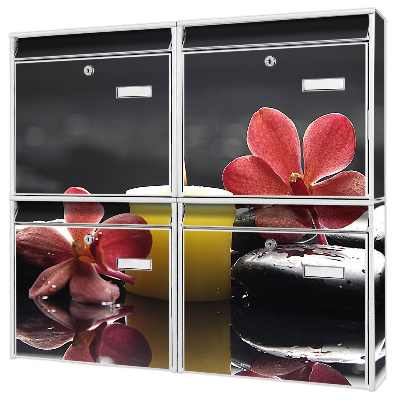 FUNKTION: Die Burg-Wächter Briefkastenanlage mit Motiv Steine & Relax 5 bietet Ihnen ausreichend Fassungsvermögen um auch A4 und C4 Sendungen zu empfangen. Das integrierte Namensschild lässt sich individuell beschriften. Wählen Sie aus den Grundfarben weiß, silber und schwarz. DESIGN: Die 4 Briefkästen haben ein ansprechendes und zeitloses Design, ohne dabei auf Funktionalität zu verzichten. Das Material ist sehr stabil, wetterfest und rostfrei. Durch das Motiv Steine & Relax 5 werden die Postkästen zu einem Blickfang. DETAILS: Die Postkästen bestehen aus verzinktem Stahl der zusätzlich mit Klarlack versiegelt wurde. Die Kästen sind gesamt 64,5cm hoch, 72,5cm breit und 10cm tief. Das Motiv besteht aus einer wetter- und UV-festen Folie, die Ihren Briefkasten zusätzlich vor Kratzern schützt. Die Postkästen werden mit Montagematerial, je einem Namensschild und je zwei Schlüsseln geliefert. NUTZEN: Das Briefkastenset eignet sich für die Wandmontage, die Größe bietet genügend Platz für Sendungen aller Art. Das zeitlose Design sowie die stabile Bauart bieten Ihnen einen treuen Begleiter für Ihre Post. BANJADO: