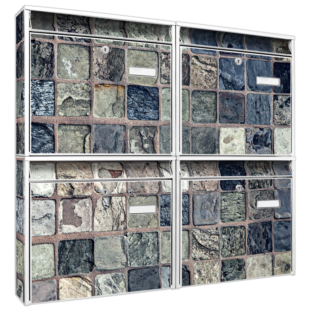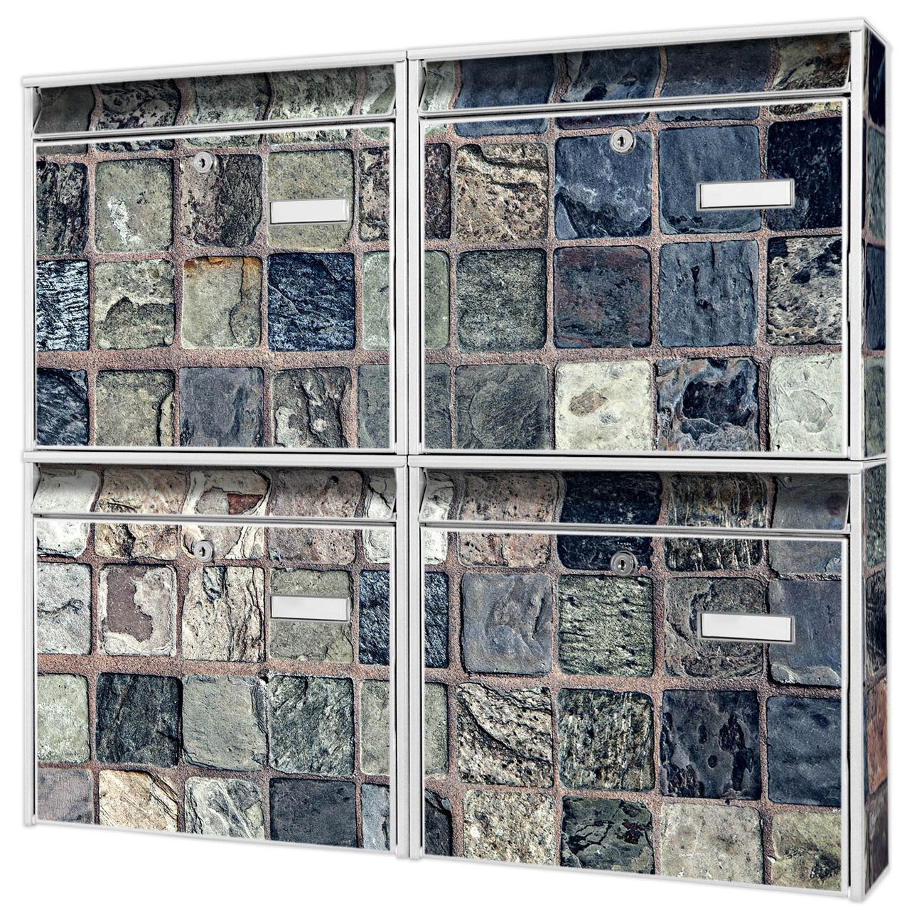 FUNKTION: Die Burg-Wächter Briefkastenanlage mit Motiv Steinfliesen bietet Ihnen ausreichend Fassungsvermögen um auch A4 und C4 Sendungen zu empfangen. Das integrierte Namensschild lässt sich individuell beschriften. Wählen Sie aus den Grundfarben weiß, silber und schwarz. DESIGN: Die 4 Briefkästen haben ein ansprechendes und zeitloses Design, ohne dabei auf Funktionalität zu verzichten. Das Material ist sehr stabil, wetterfest und rostfrei. Durch das Motiv Steinfliesen werden die Postkästen zu einem Blickfang. DETAILS: Die Postkästen bestehen aus verzinktem Stahl der zusätzlich mit Klarlack versiegelt wurde. Die Kästen sind gesamt 64,5cm hoch, 72,5cm breit und 10cm tief. Das Motiv besteht aus einer wetter- und UV-festen Folie, die Ihren Briefkasten zusätzlich vor Kratzern schützt. Die Postkästen werden mit Montagematerial, je einem Namensschild und je zwei Schlüsseln geliefert. NUTZEN: Das Briefkastenset eignet sich für die Wandmontage, die Größe bietet genügend Platz für Sendungen aller Art. Das zeitlose Design sowie die stabile Bauart bieten Ihnen einen treuen Begleiter für Ihre Post. BANJADO: