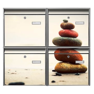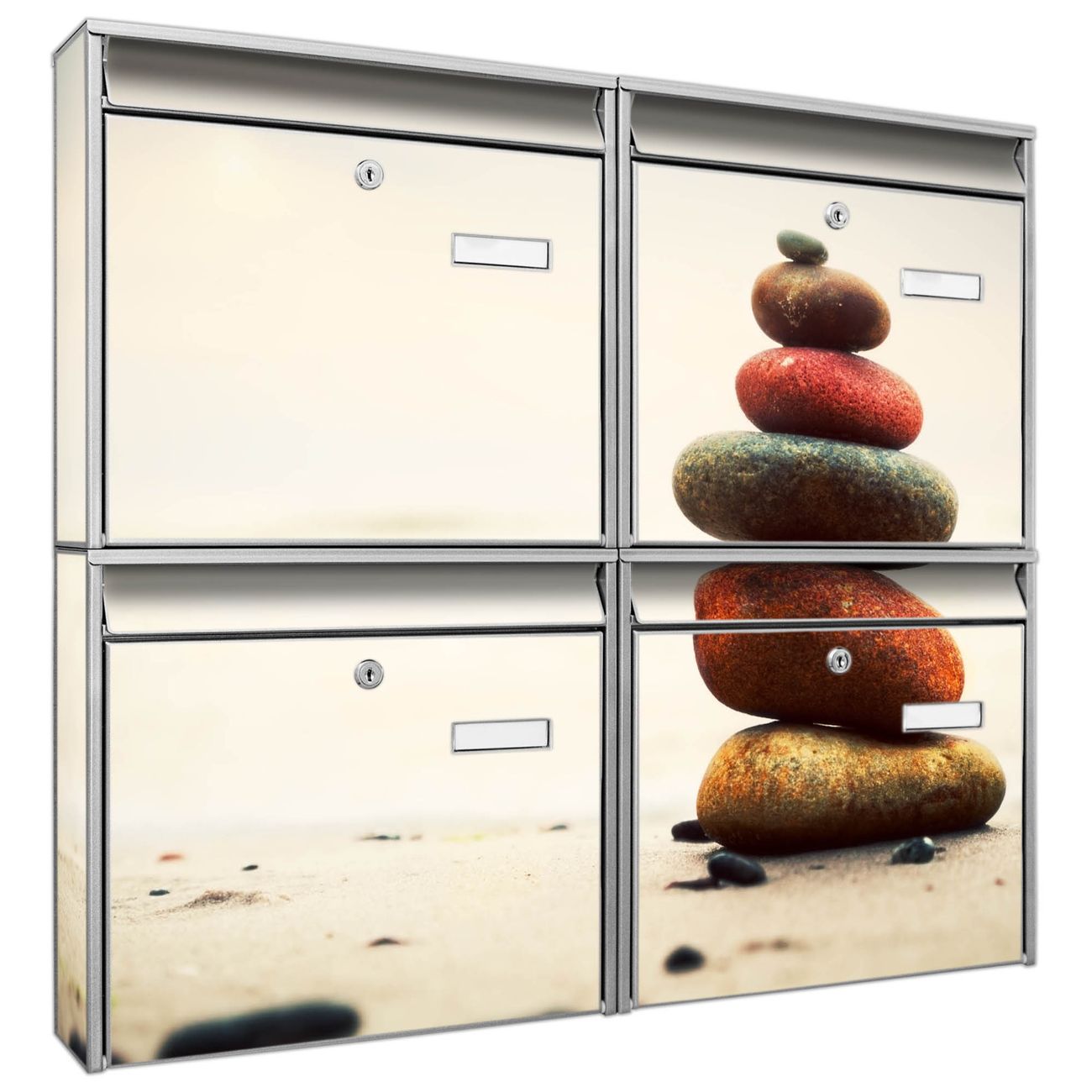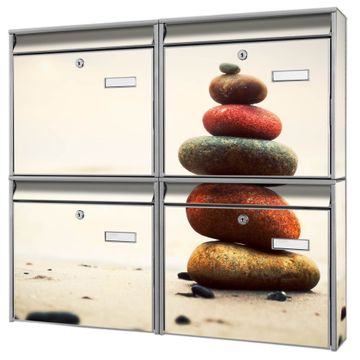 FUNKTION: Die Burg-Wächter Briefkastenanlage mit Motiv Steinmännchen bietet Ihnen ausreichend Fassungsvermögen um auch A4 und C4 Sendungen zu empfangen. Das integrierte Namensschild lässt sich individuell beschriften. Wählen Sie aus den Grundfarben weiß, silber und schwarz. DESIGN: Die 4 Briefkästen haben ein ansprechendes und zeitloses Design, ohne dabei auf Funktionalität zu verzichten. Das Material ist sehr stabil, wetterfest und rostfrei. Durch das Motiv Steinmännchen werden die Postkästen zu einem Blickfang. DETAILS: Die Postkästen bestehen aus verzinktem Stahl der zusätzlich mit Klarlack versiegelt wurde. Die Kästen sind gesamt 64,5cm hoch, 72,5cm breit und 10cm tief. Das Motiv besteht aus einer wetter- und UV-festen Folie, die Ihren Briefkasten zusätzlich vor Kratzern schützt. Die Postkästen werden mit Montagematerial, je einem Namensschild und je zwei Schlüsseln geliefert. NUTZEN: Das Briefkastenset eignet sich für die Wandmontage, die Größe bietet genügend Platz für Sendungen aller Art. Das zeitlose Design sowie die stabile Bauart bieten Ihnen einen treuen Begleiter für Ihre Post. BANJADO: