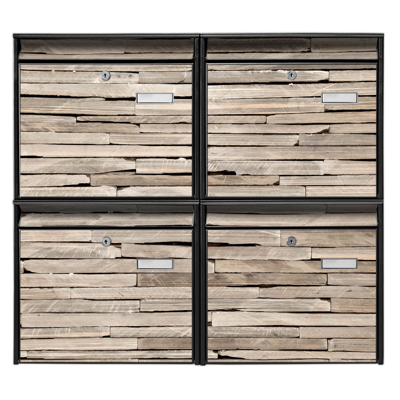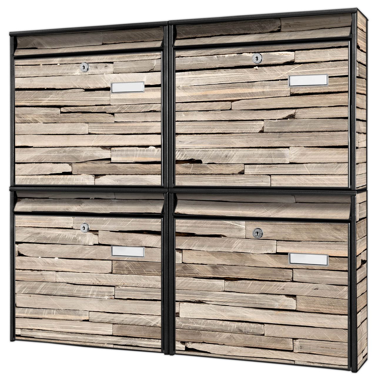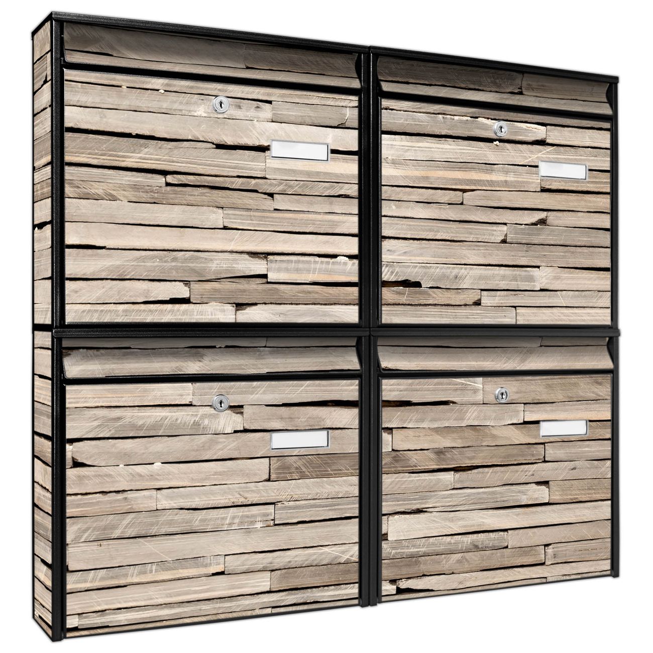 FUNKTION: Die Burg-Wächter Briefkastenanlage mit Motiv Steinplatten bietet Ihnen ausreichend Fassungsvermögen um auch A4 und C4 Sendungen zu empfangen. Das integrierte Namensschild lässt sich individuell beschriften. Wählen Sie aus den Grundfarben weiß, silber und schwarz. DESIGN: Die 4 Briefkästen haben ein ansprechendes und zeitloses Design, ohne dabei auf Funktionalität zu verzichten. Das Material ist sehr stabil, wetterfest und rostfrei. Durch das Motiv Steinplatten werden die Postkästen zu einem Blickfang. DETAILS: Die Postkästen bestehen aus verzinktem Stahl der zusätzlich mit Klarlack versiegelt wurde. Die Kästen sind gesamt 64,5cm hoch, 72,5cm breit und 10cm tief. Das Motiv besteht aus einer wetter- und UV-festen Folie, die Ihren Briefkasten zusätzlich vor Kratzern schützt. Die Postkästen werden mit Montagematerial, je einem Namensschild und je zwei Schlüsseln geliefert. NUTZEN: Das Briefkastenset eignet sich für die Wandmontage, die Größe bietet genügend Platz für Sendungen aller Art. Das zeitlose Design sowie die stabile Bauart bieten Ihnen einen treuen Begleiter für Ihre Post. BANJADO: