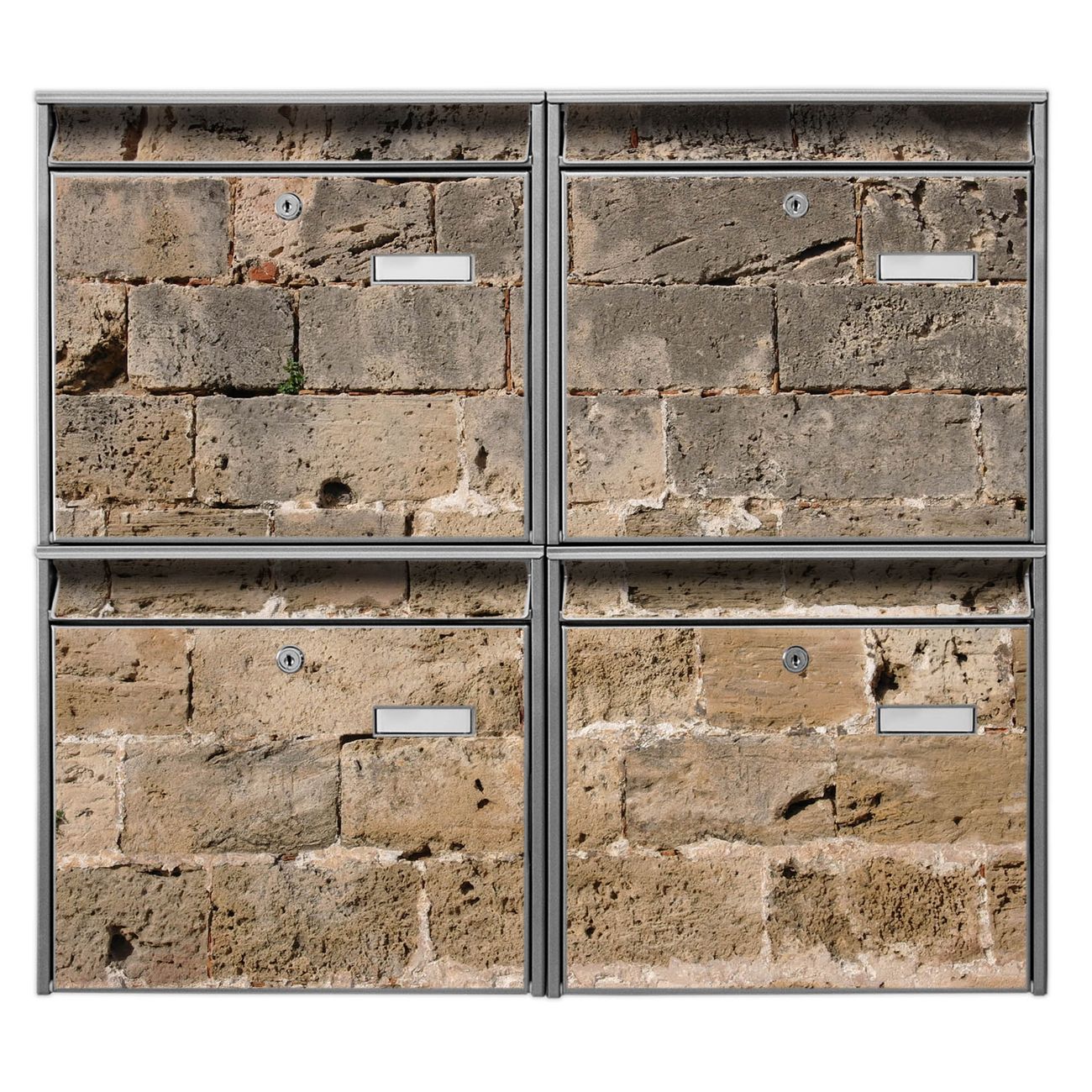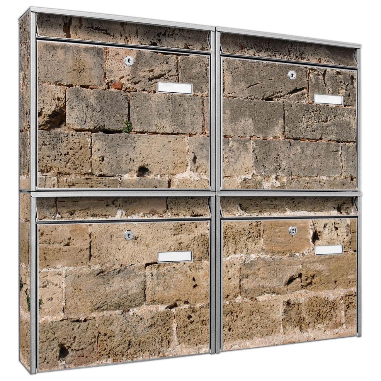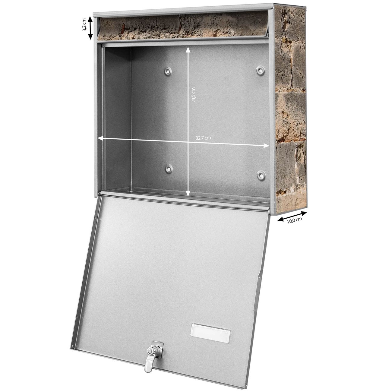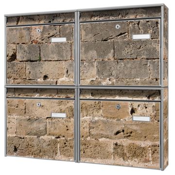 FUNKTION: Die Burg-Wächter Briefkastenanlage mit Motiv Steinwand Antik bietet Ihnen ausreichend Fassungsvermögen um auch A4 und C4 Sendungen zu empfangen. Das integrierte Namensschild lässt sich individuell beschriften. Wählen Sie aus den Grundfarben weiß, silber und schwarz. DESIGN: Die 4 Briefkästen haben ein ansprechendes und zeitloses Design, ohne dabei auf Funktionalität zu verzichten. Das Material ist sehr stabil, wetterfest und rostfrei. Durch das Motiv Steinwand Antik werden die Postkästen zu einem Blickfang. DETAILS: Die Postkästen bestehen aus verzinktem Stahl der zusätzlich mit Klarlack versiegelt wurde. Die Kästen sind gesamt 64,5cm hoch, 72,5cm breit und 10cm tief. Das Motiv besteht aus einer wetter- und UV-festen Folie, die Ihren Briefkasten zusätzlich vor Kratzern schützt. Die Postkästen werden mit Montagematerial, je einem Namensschild und je zwei Schlüsseln geliefert. NUTZEN: Das Briefkastenset eignet sich für die Wandmontage, die Größe bietet genügend Platz für Sendungen aller Art. Das zeitlose Design sowie die stabile Bauart bieten Ihnen einen treuen Begleiter für Ihre Post. BANJADO: