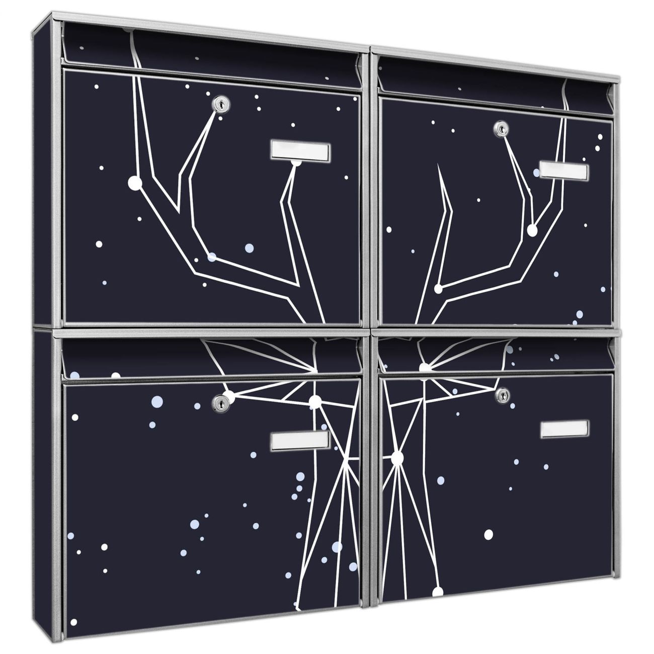 FUNKTION: Die Burg-Wächter Briefkastenanlage mit Motiv Sternbild Hirsch bietet Ihnen ausreichend Fassungsvermögen um auch A4 und C4 Sendungen zu empfangen. Das integrierte Namensschild lässt sich individuell beschriften. Wählen Sie aus den Grundfarben weiß, silber und schwarz. DESIGN: Die 4 Briefkästen haben ein ansprechendes und zeitloses Design, ohne dabei auf Funktionalität zu verzichten. Das Material ist sehr stabil, wetterfest und rostfrei. Durch das Motiv Sternbild Hirsch werden die Postkästen zu einem Blickfang. DETAILS: Die Postkästen bestehen aus verzinktem Stahl der zusätzlich mit Klarlack versiegelt wurde. Die Kästen sind gesamt 64,5cm hoch, 72,5cm breit und 10cm tief. Das Motiv besteht aus einer wetter- und UV-festen Folie, die Ihren Briefkasten zusätzlich vor Kratzern schützt. Die Postkästen werden mit Montagematerial, je einem Namensschild und je zwei Schlüsseln geliefert. NUTZEN: Das Briefkastenset eignet sich für die Wandmontage, die Größe bietet genügend Platz für Sendungen aller Art. Das zeitlose Design sowie die stabile Bauart bieten Ihnen einen treuen Begleiter für Ihre Post. BANJADO: