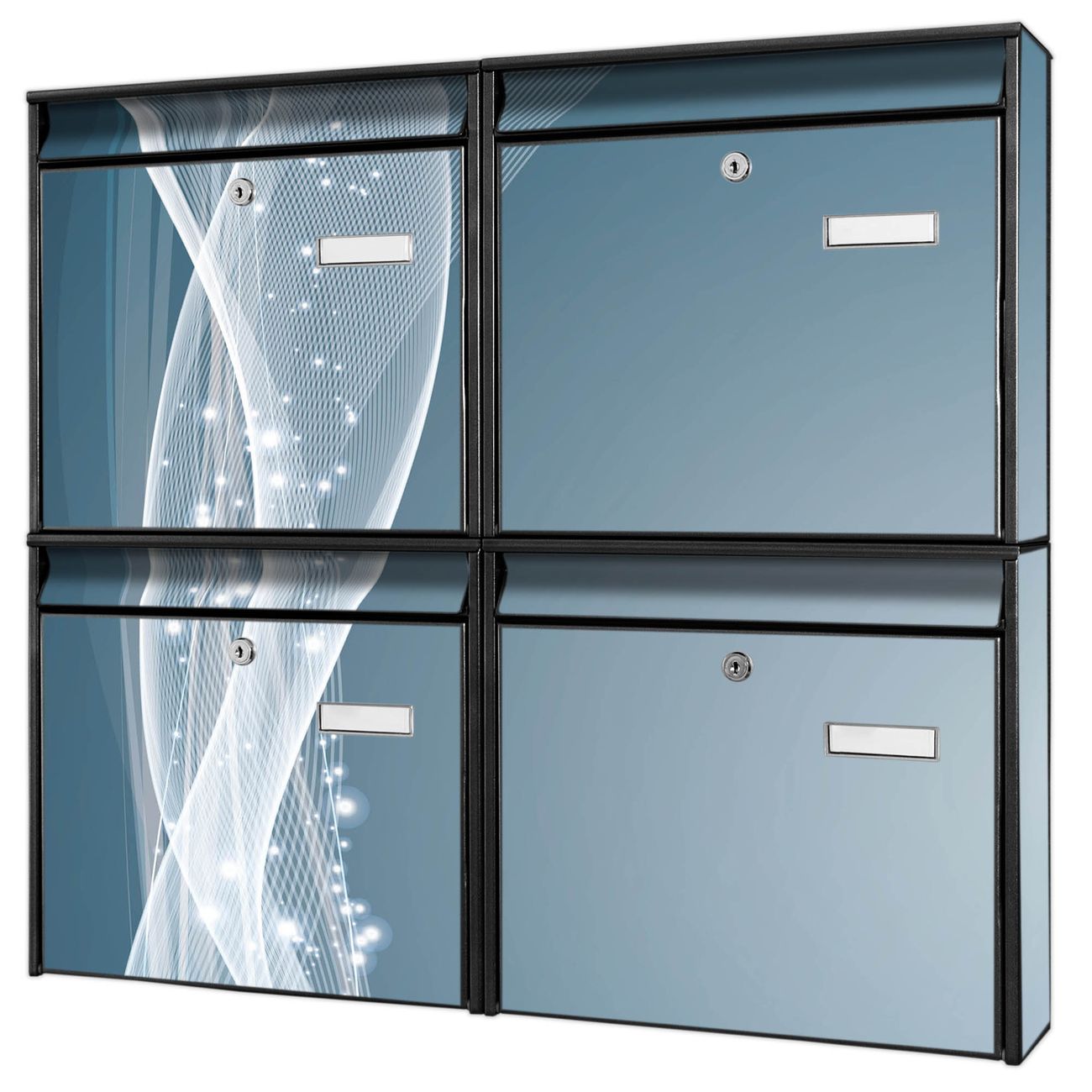 FUNKTION: Die Burg-Wächter Briefkastenanlage mit Motiv Sternenstaub bietet Ihnen ausreichend Fassungsvermögen um auch A4 und C4 Sendungen zu empfangen. Das integrierte Namensschild lässt sich individuell beschriften. Wählen Sie aus den Grundfarben weiß, silber und schwarz. DESIGN: Die 4 Briefkästen haben ein ansprechendes und zeitloses Design, ohne dabei auf Funktionalität zu verzichten. Das Material ist sehr stabil, wetterfest und rostfrei. Durch das Motiv Sternenstaub werden die Postkästen zu einem Blickfang. DETAILS: Die Postkästen bestehen aus verzinktem Stahl der zusätzlich mit Klarlack versiegelt wurde. Die Kästen sind gesamt 64,5cm hoch, 72,5cm breit und 10cm tief. Das Motiv besteht aus einer wetter- und UV-festen Folie, die Ihren Briefkasten zusätzlich vor Kratzern schützt. Die Postkästen werden mit Montagematerial, je einem Namensschild und je zwei Schlüsseln geliefert. NUTZEN: Das Briefkastenset eignet sich für die Wandmontage, die Größe bietet genügend Platz für Sendungen aller Art. Das zeitlose Design sowie die stabile Bauart bieten Ihnen einen treuen Begleiter für Ihre Post. BANJADO: