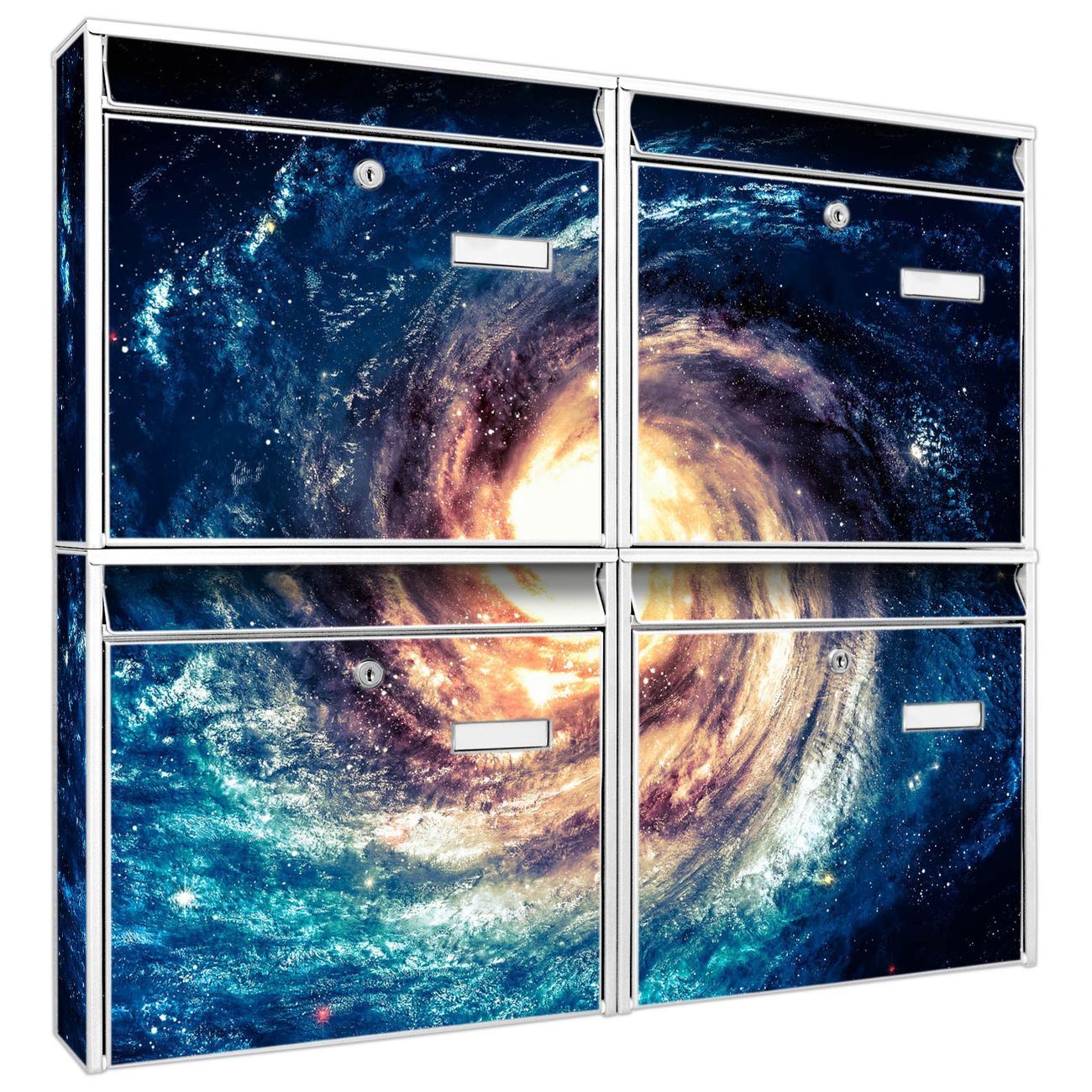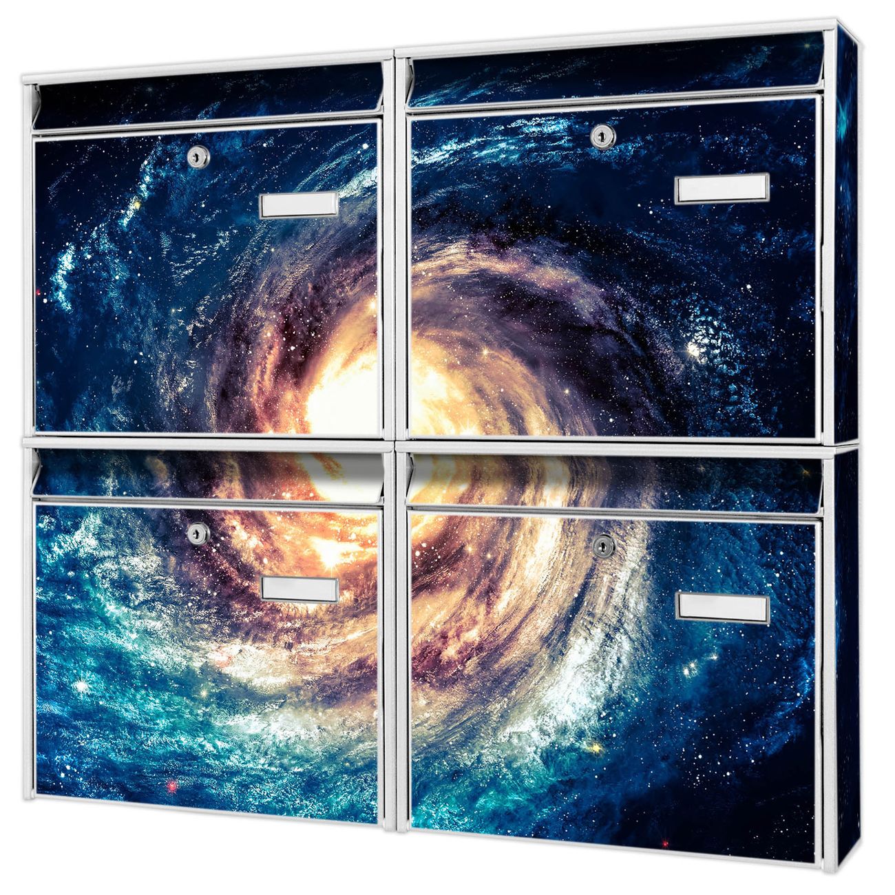 FUNKTION: Die Burg-Wächter Briefkastenanlage mit Motiv Sternenwirbel bietet Ihnen ausreichend Fassungsvermögen um auch A4 und C4 Sendungen zu empfangen. Das integrierte Namensschild lässt sich individuell beschriften. Wählen Sie aus den Grundfarben weiß, silber und schwarz. DESIGN: Die 4 Briefkästen haben ein ansprechendes und zeitloses Design, ohne dabei auf Funktionalität zu verzichten. Das Material ist sehr stabil, wetterfest und rostfrei. Durch das Motiv Sternenwirbel werden die Postkästen zu einem Blickfang. DETAILS: Die Postkästen bestehen aus verzinktem Stahl der zusätzlich mit Klarlack versiegelt wurde. Die Kästen sind gesamt 64,5cm hoch, 72,5cm breit und 10cm tief. Das Motiv besteht aus einer wetter- und UV-festen Folie, die Ihren Briefkasten zusätzlich vor Kratzern schützt. Die Postkästen werden mit Montagematerial, je einem Namensschild und je zwei Schlüsseln geliefert. NUTZEN: Das Briefkastenset eignet sich für die Wandmontage, die Größe bietet genügend Platz für Sendungen aller Art. Das zeitlose Design sowie die stabile Bauart bieten Ihnen einen treuen Begleiter für Ihre Post. BANJADO: