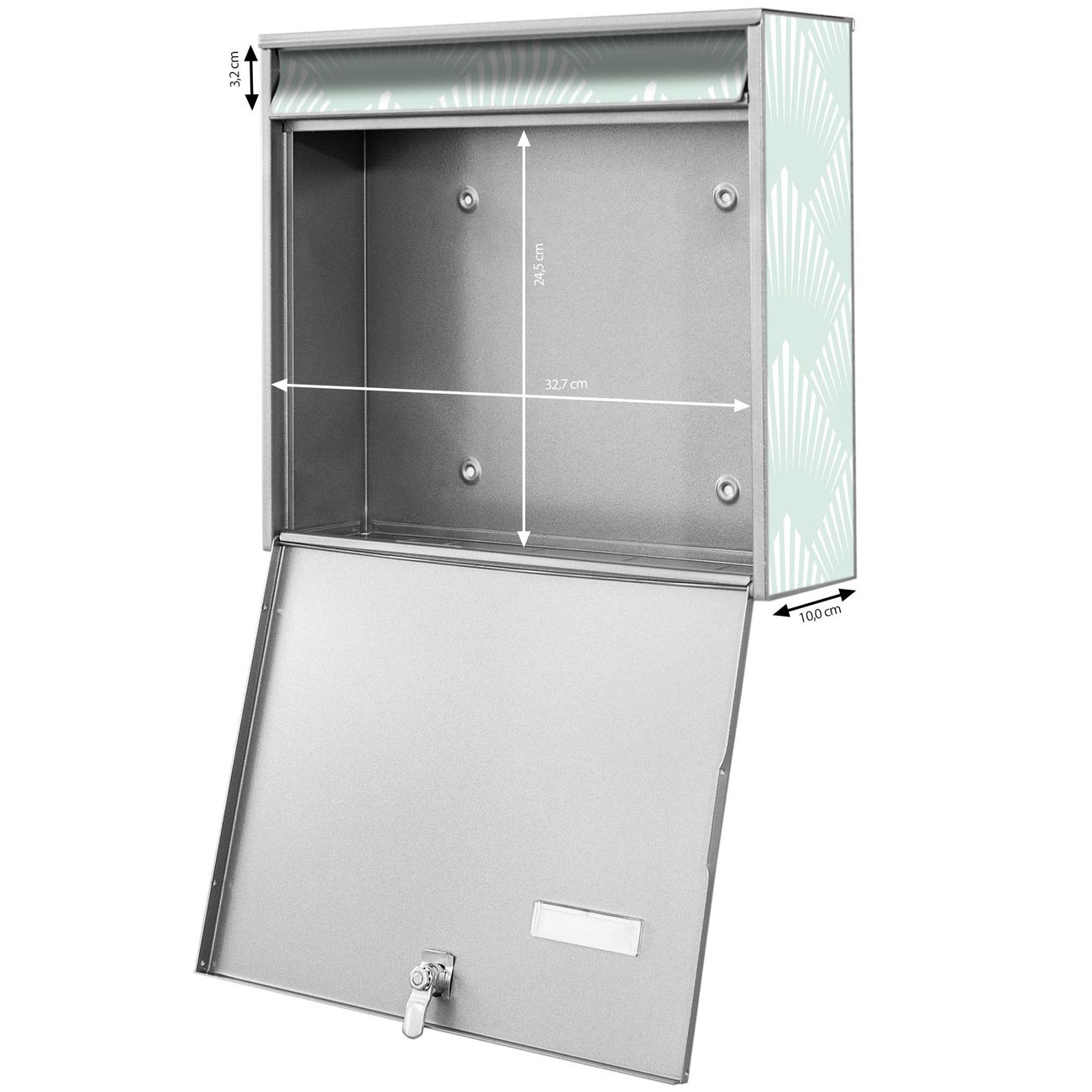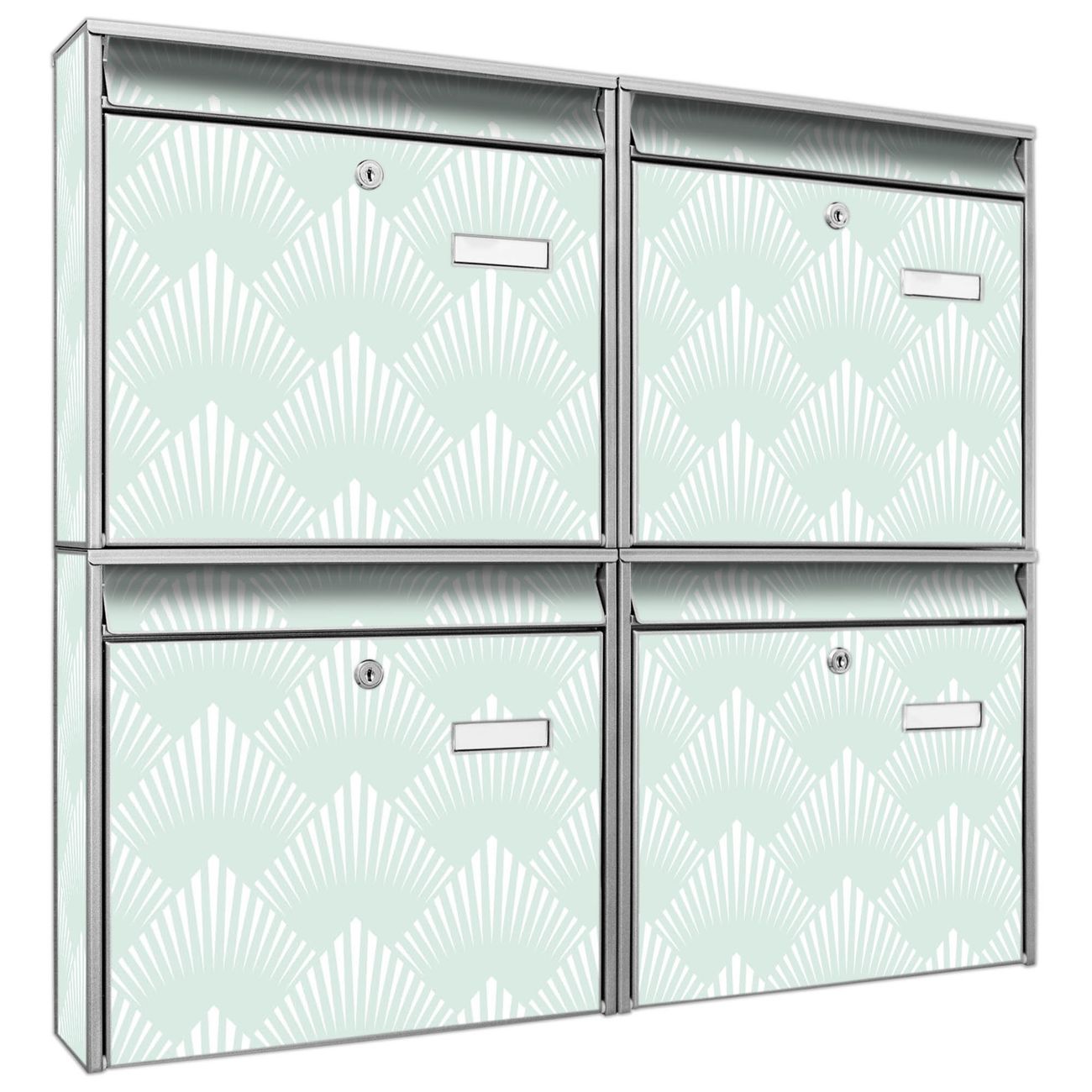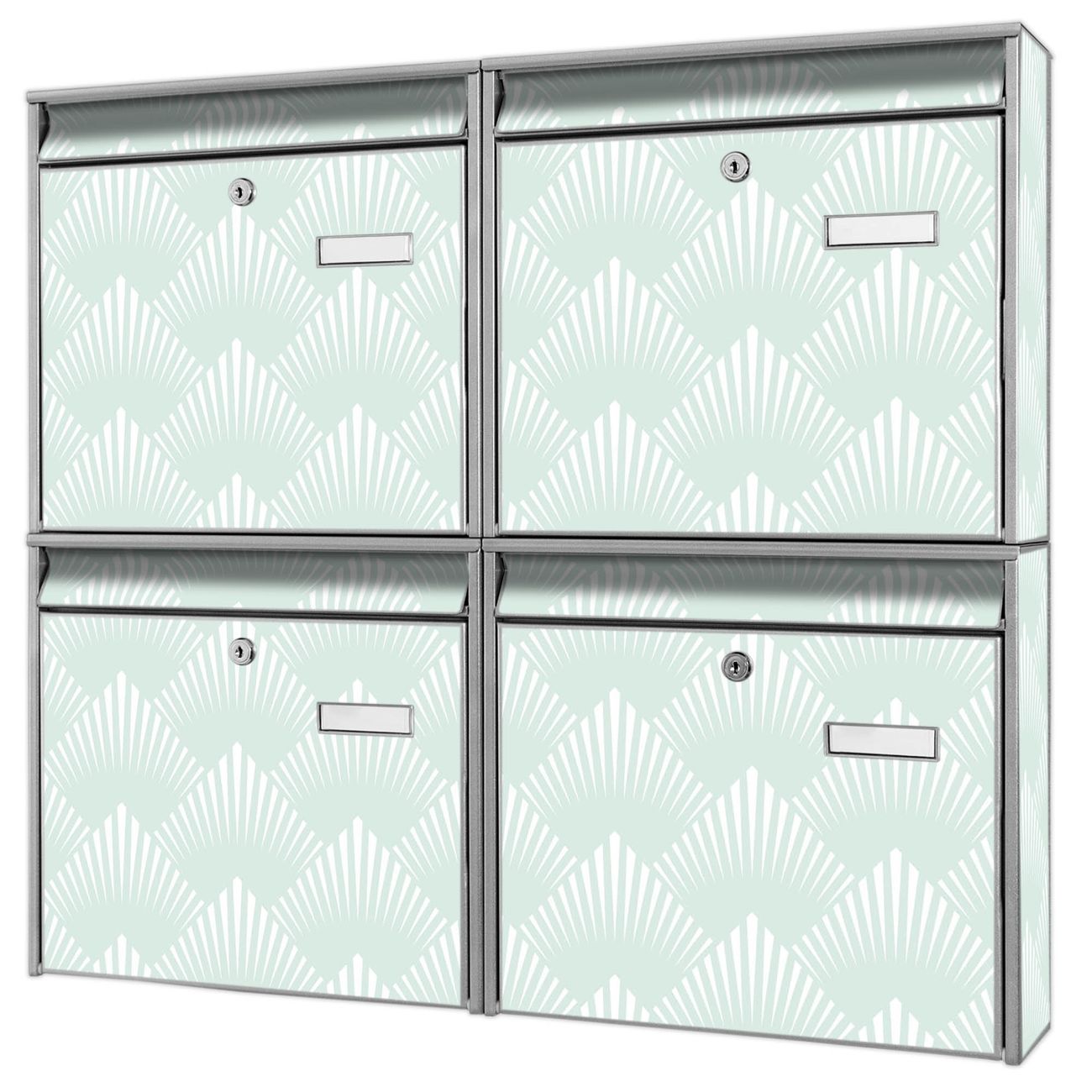 FUNKTION: Die Burg-Wächter Briefkastenanlage mit Motiv Strahlen Mint bietet Ihnen ausreichend Fassungsvermögen um auch A4 und C4 Sendungen zu empfangen. Das integrierte Namensschild lässt sich individuell beschriften. Wählen Sie aus den Grundfarben weiß, silber und schwarz. DESIGN: Die 4 Briefkästen haben ein ansprechendes und zeitloses Design, ohne dabei auf Funktionalität zu verzichten. Das Material ist sehr stabil, wetterfest und rostfrei. Durch das Motiv Strahlen Mint werden die Postkästen zu einem Blickfang. DETAILS: Die Postkästen bestehen aus verzinktem Stahl der zusätzlich mit Klarlack versiegelt wurde. Die Kästen sind gesamt 64,5cm hoch, 72,5cm breit und 10cm tief. Das Motiv besteht aus einer wetter- und UV-festen Folie, die Ihren Briefkasten zusätzlich vor Kratzern schützt. Die Postkästen werden mit Montagematerial, je einem Namensschild und je zwei Schlüsseln geliefert. NUTZEN: Das Briefkastenset eignet sich für die Wandmontage, die Größe bietet genügend Platz für Sendungen aller Art. Das zeitlose Design sowie die stabile Bauart bieten Ihnen einen treuen Begleiter für Ihre Post. BANJADO: