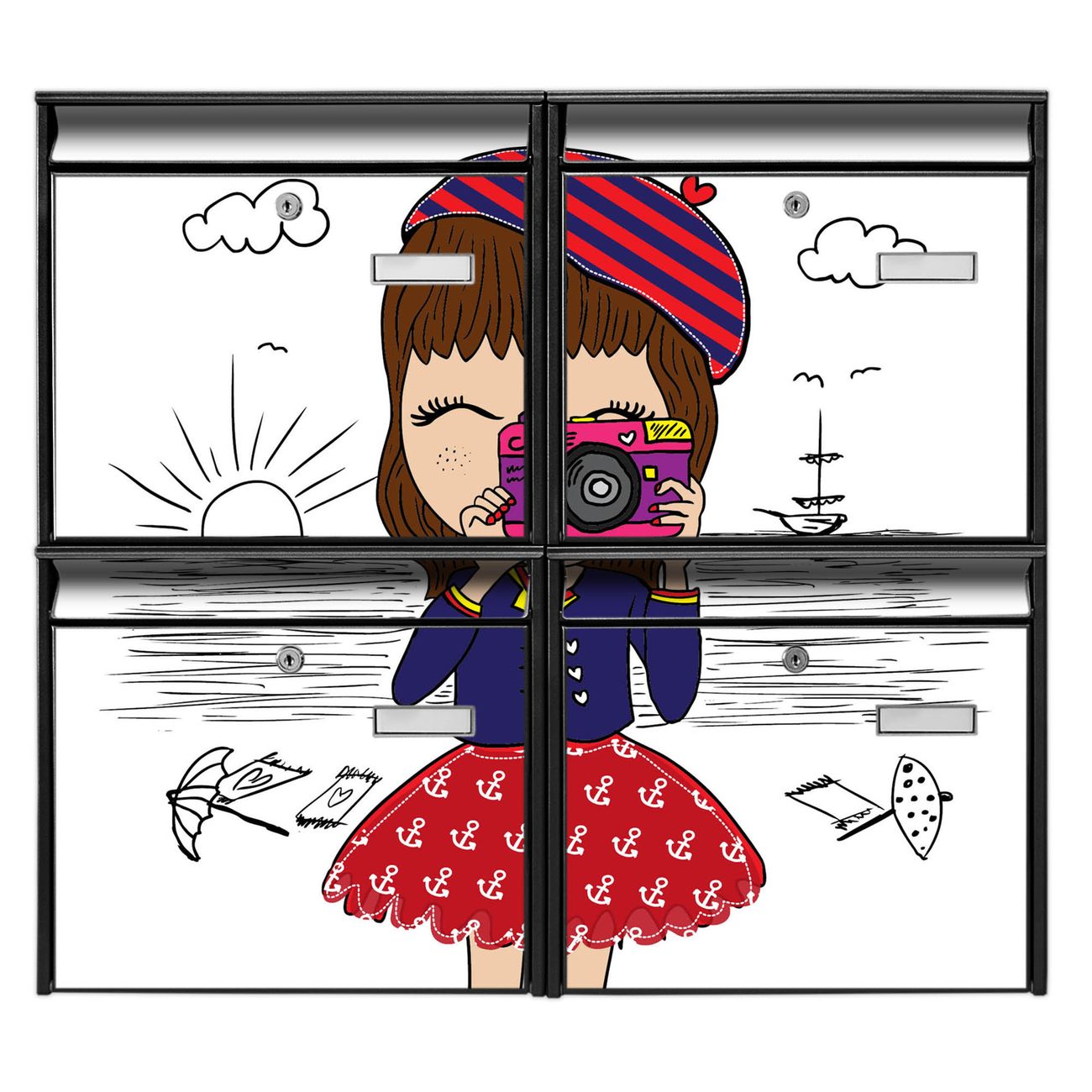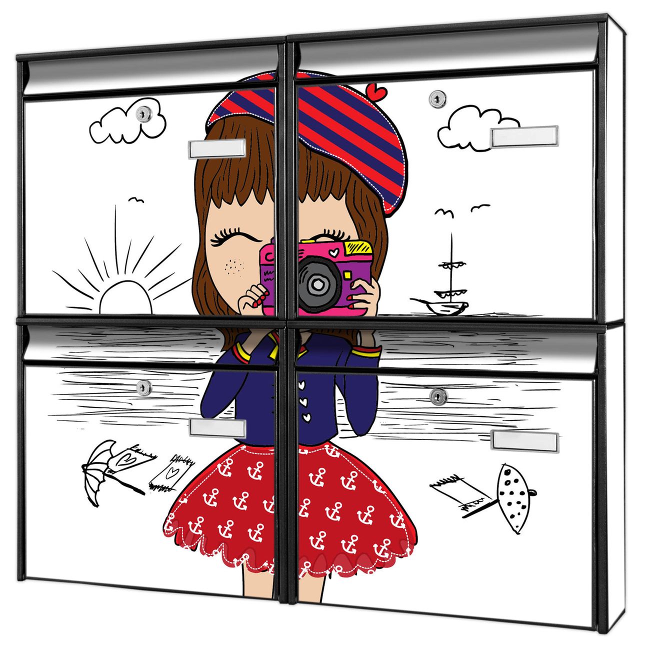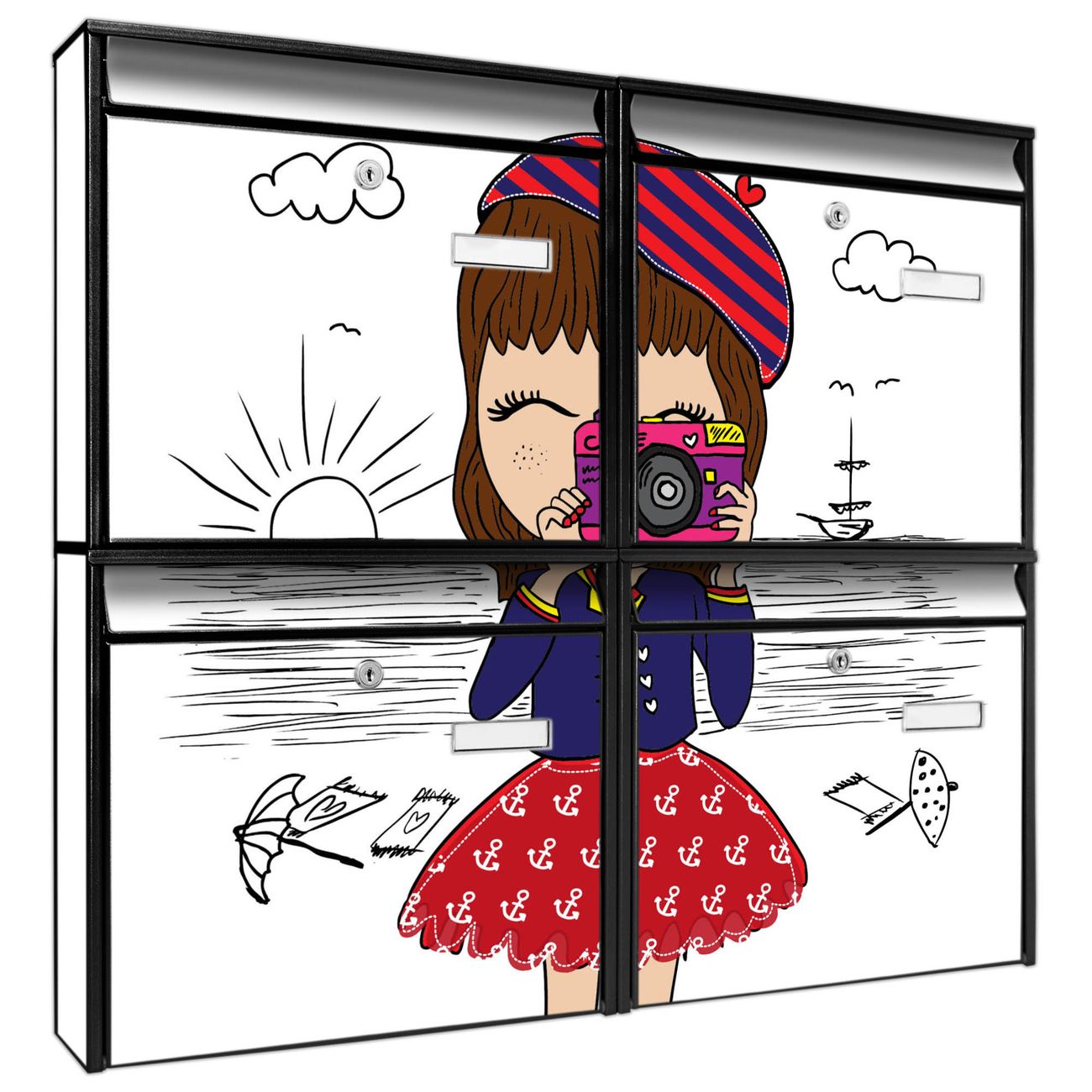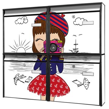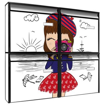 FUNKTION: Die Burg-Wächter Briefkastenanlage mit Motiv Süße Kamera bietet Ihnen ausreichend Fassungsvermögen um auch A4 und C4 Sendungen zu empfangen. Das integrierte Namensschild lässt sich individuell beschriften. Wählen Sie aus den Grundfarben weiß, silber und schwarz. DESIGN: Die 4 Briefkästen haben ein ansprechendes und zeitloses Design, ohne dabei auf Funktionalität zu verzichten. Das Material ist sehr stabil, wetterfest und rostfrei. Durch das Motiv Süße Kamera werden die Postkästen zu einem Blickfang. DETAILS: Die Postkästen bestehen aus verzinktem Stahl der zusätzlich mit Klarlack versiegelt wurde. Die Kästen sind gesamt 64,5cm hoch, 72,5cm breit und 10cm tief. Das Motiv besteht aus einer wetter- und UV-festen Folie, die Ihren Briefkasten zusätzlich vor Kratzern schützt. Die Postkästen werden mit Montagematerial, je einem Namensschild und je zwei Schlüsseln geliefert. NUTZEN: Das Briefkastenset eignet sich für die Wandmontage, die Größe bietet genügend Platz für Sendungen aller Art. Das zeitlose Design sowie die stabile Bauart bieten Ihnen einen treuen Begleiter für Ihre Post. BANJADO: