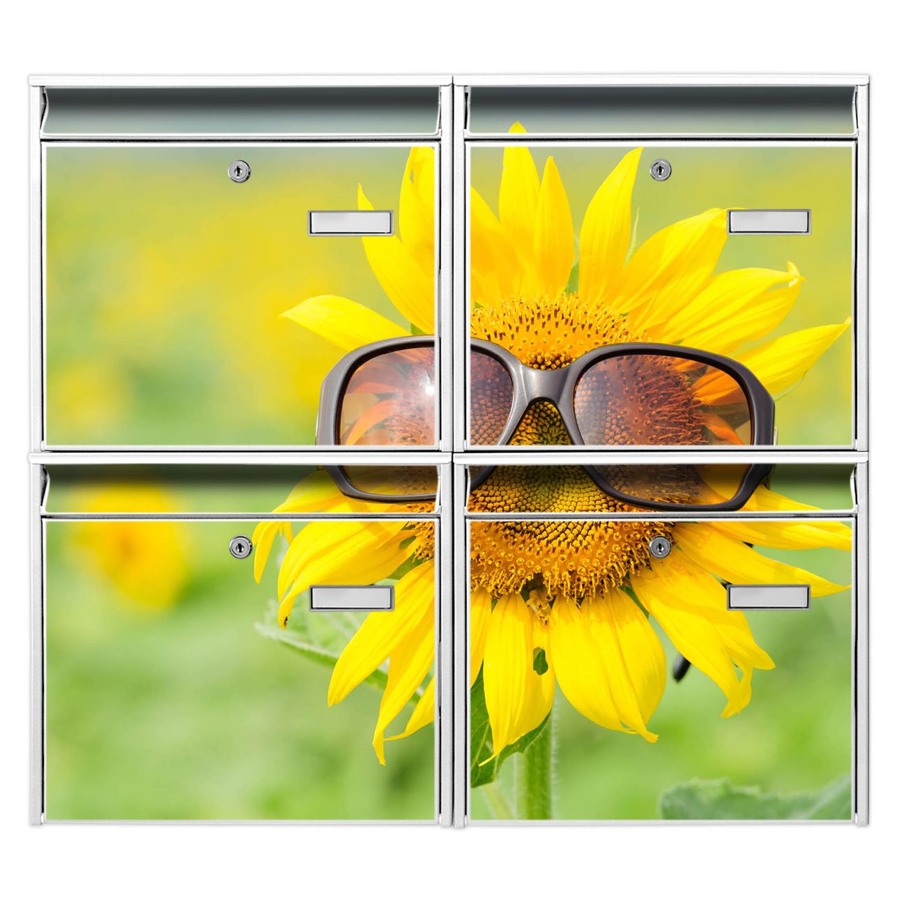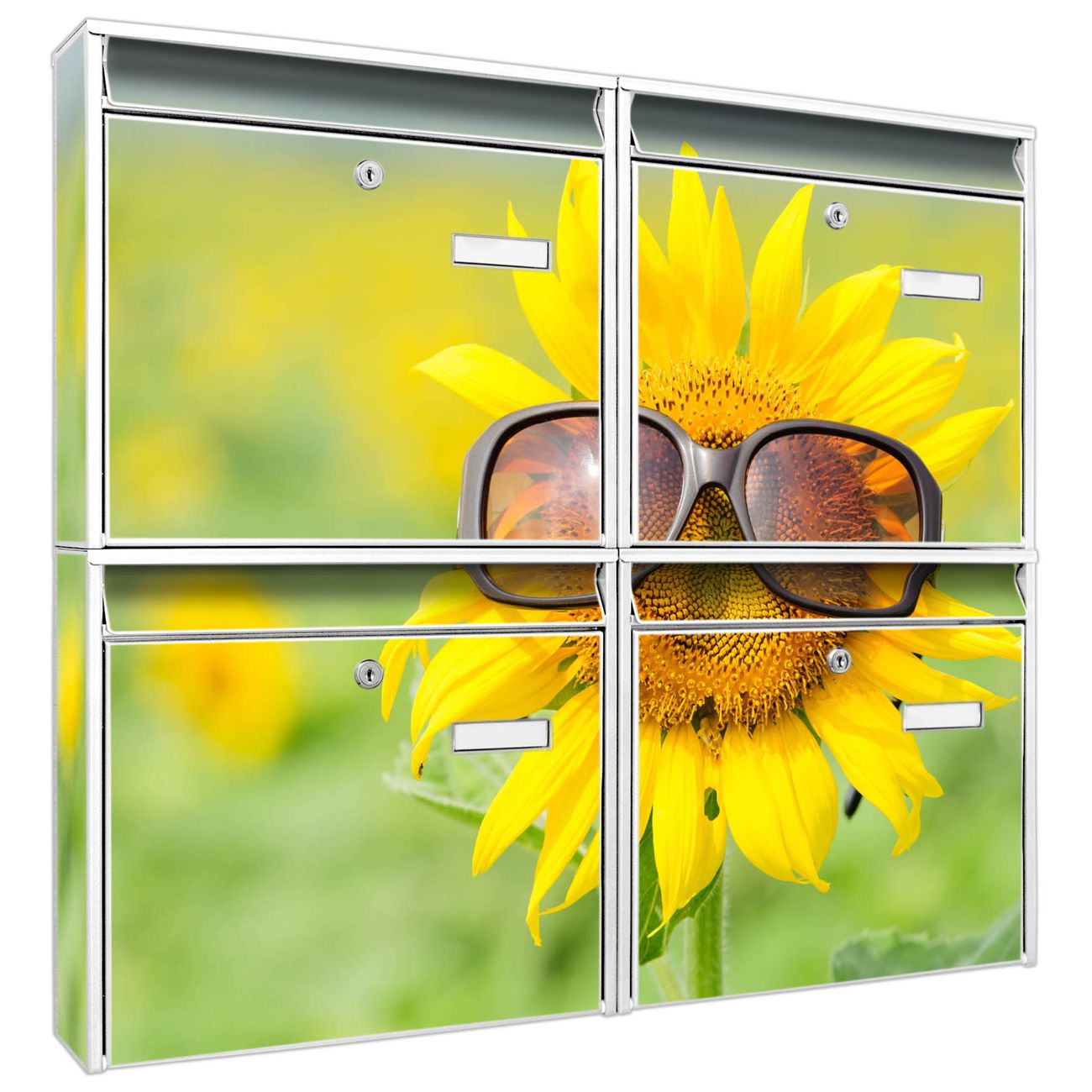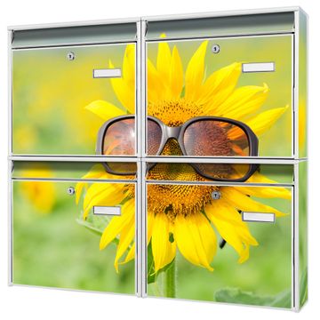 FUNKTION: Die Burg-Wächter Briefkastenanlage mit Motiv Sunny bietet Ihnen ausreichend Fassungsvermögen um auch A4 und C4 Sendungen zu empfangen. Das integrierte Namensschild lässt sich individuell beschriften. Wählen Sie aus den Grundfarben weiß, silber und schwarz. DESIGN: Die 4 Briefkästen haben ein ansprechendes und zeitloses Design, ohne dabei auf Funktionalität zu verzichten. Das Material ist sehr stabil, wetterfest und rostfrei. Durch das Motiv Sunny werden die Postkästen zu einem Blickfang. DETAILS: Die Postkästen bestehen aus verzinktem Stahl der zusätzlich mit Klarlack versiegelt wurde. Die Kästen sind gesamt 64,5cm hoch, 72,5cm breit und 10cm tief. Das Motiv besteht aus einer wetter- und UV-festen Folie, die Ihren Briefkasten zusätzlich vor Kratzern schützt. Die Postkästen werden mit Montagematerial, je einem Namensschild und je zwei Schlüsseln geliefert. NUTZEN: Das Briefkastenset eignet sich für die Wandmontage, die Größe bietet genügend Platz für Sendungen aller Art. Das zeitlose Design sowie die stabile Bauart bieten Ihnen einen treuen Begleiter für Ihre Post. BANJADO: