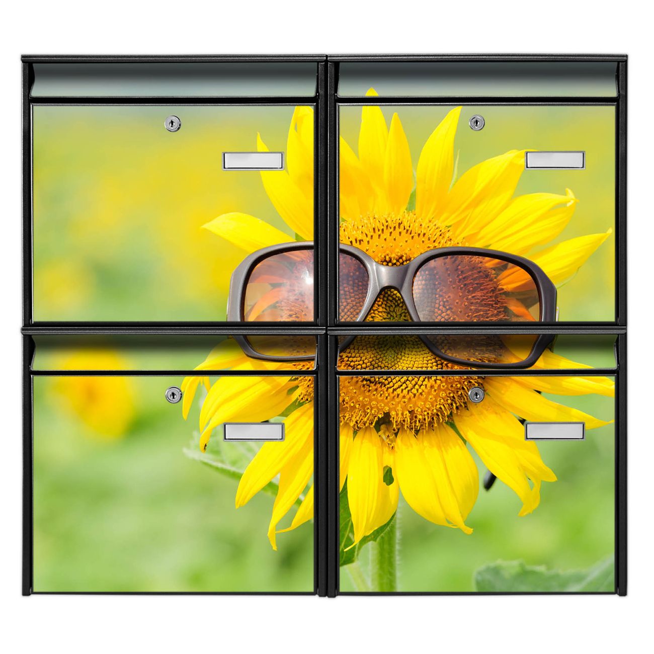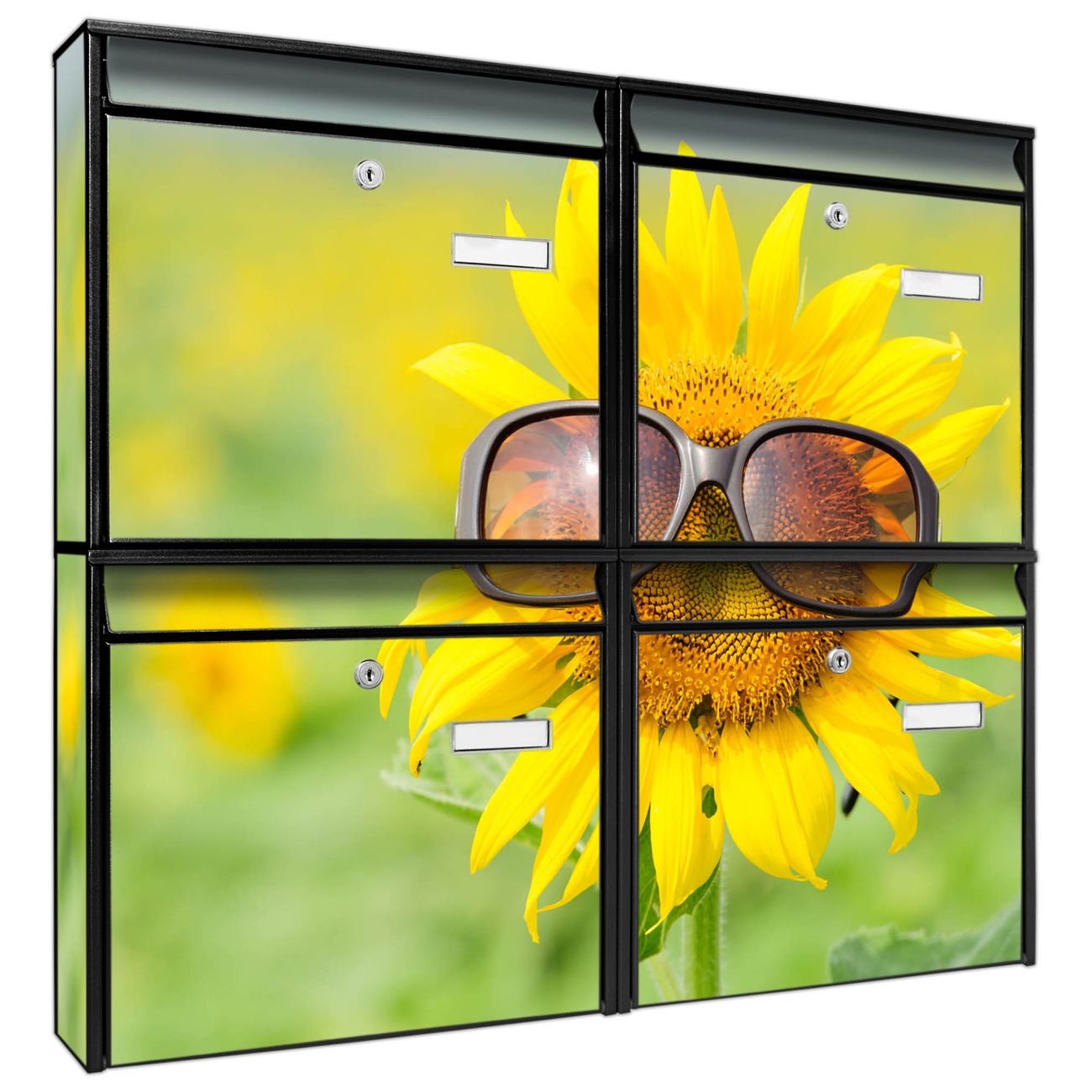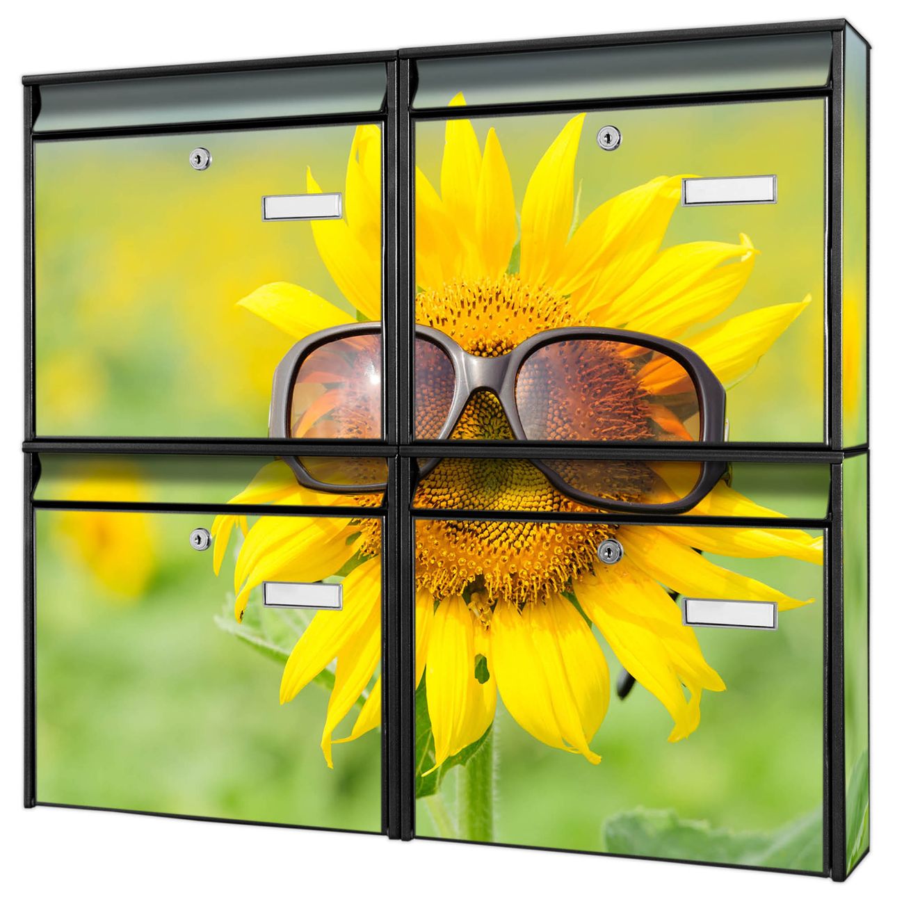 FUNKTION: Die Burg-Wächter Briefkastenanlage mit Motiv Sunny bietet Ihnen ausreichend Fassungsvermögen um auch A4 und C4 Sendungen zu empfangen. Das integrierte Namensschild lässt sich individuell beschriften. Wählen Sie aus den Grundfarben weiß, silber und schwarz. DESIGN: Die 4 Briefkästen haben ein ansprechendes und zeitloses Design, ohne dabei auf Funktionalität zu verzichten. Das Material ist sehr stabil, wetterfest und rostfrei. Durch das Motiv Sunny werden die Postkästen zu einem Blickfang. DETAILS: Die Postkästen bestehen aus verzinktem Stahl der zusätzlich mit Klarlack versiegelt wurde. Die Kästen sind gesamt 64,5cm hoch, 72,5cm breit und 10cm tief. Das Motiv besteht aus einer wetter- und UV-festen Folie, die Ihren Briefkasten zusätzlich vor Kratzern schützt. Die Postkästen werden mit Montagematerial, je einem Namensschild und je zwei Schlüsseln geliefert. NUTZEN: Das Briefkastenset eignet sich für die Wandmontage, die Größe bietet genügend Platz für Sendungen aller Art. Das zeitlose Design sowie die stabile Bauart bieten Ihnen einen treuen Begleiter für Ihre Post. BANJADO: