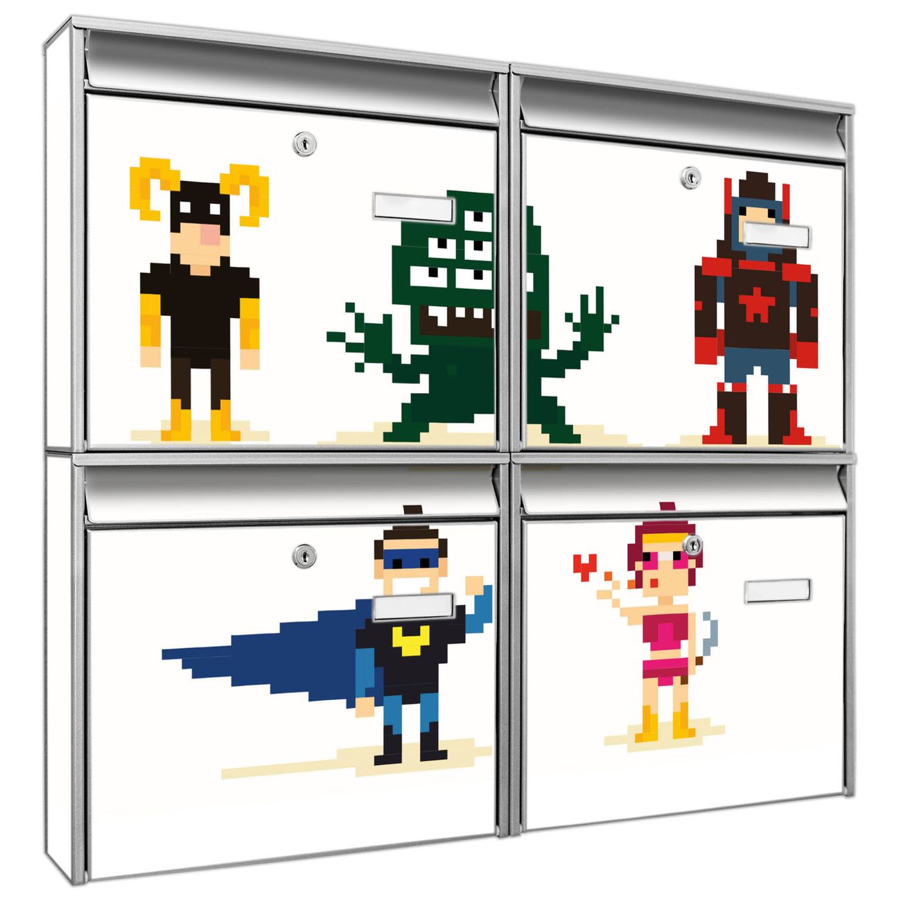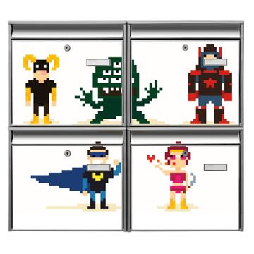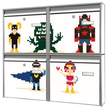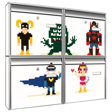FUNKTION: Die Burg-Wächter Briefkastenanlage mit Motiv Superhelden bietet Ihnen ausreichend Fassungsvermögen um auch A4 und C4 Sendungen zu empfangen. Das integrierte Namensschild lässt sich individuell beschriften. Wählen Sie aus den Grundfarben weiß, silber und schwarz. DESIGN: Die 4 Briefkästen haben ein ansprechendes und zeitloses Design, ohne dabei auf Funktionalität zu verzichten. Das Material ist sehr stabil, wetterfest und rostfrei. Durch das Motiv Superhelden werden die Postkästen zu einem Blickfang. DETAILS: Die Postkästen bestehen aus verzinktem Stahl der zusätzlich mit Klarlack versiegelt wurde. Die Kästen sind gesamt 64,5cm hoch, 72,5cm breit und 10cm tief. Das Motiv besteht aus einer wetter- und UV-festen Folie, die Ihren Briefkasten zusätzlich vor Kratzern schützt. Die Postkästen werden mit Montagematerial, je einem Namensschild und je zwei Schlüsseln geliefert. NUTZEN: Das Briefkastenset eignet sich für die Wandmontage, die Größe bietet genügend Platz für Sendungen aller Art. Das zeitlose Design sowie die stabile Bauart bieten Ihnen einen treuen Begleiter für Ihre Post. BANJADO: