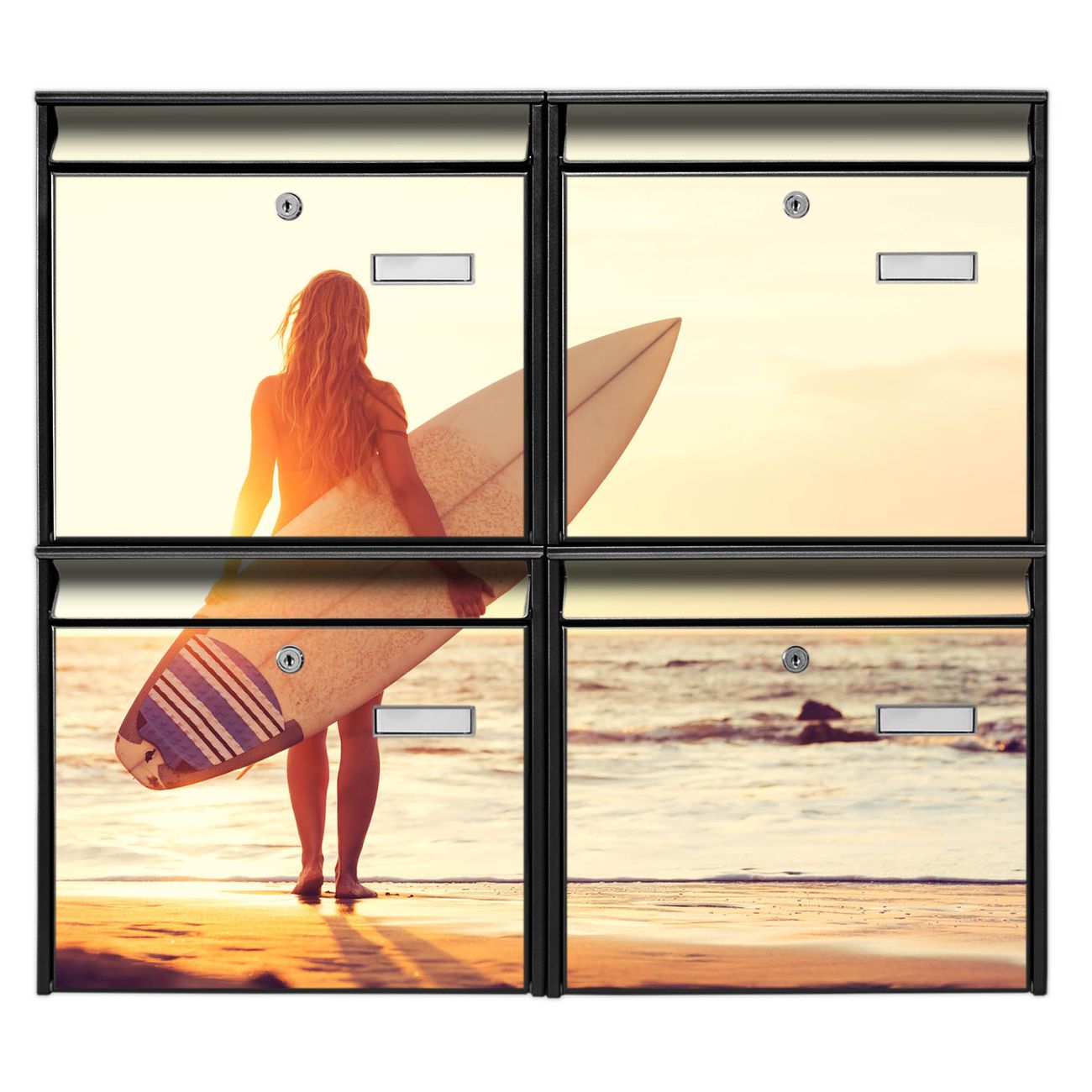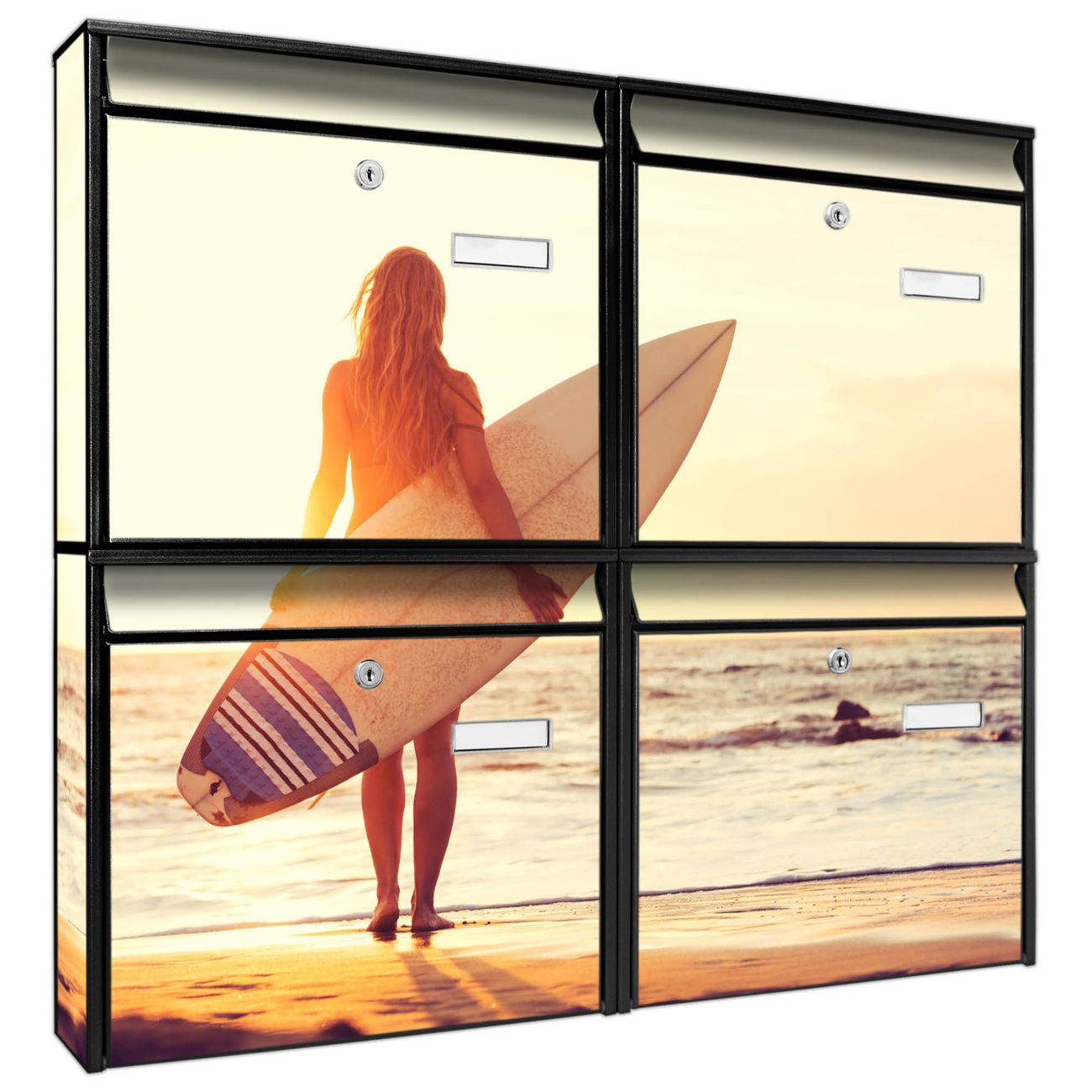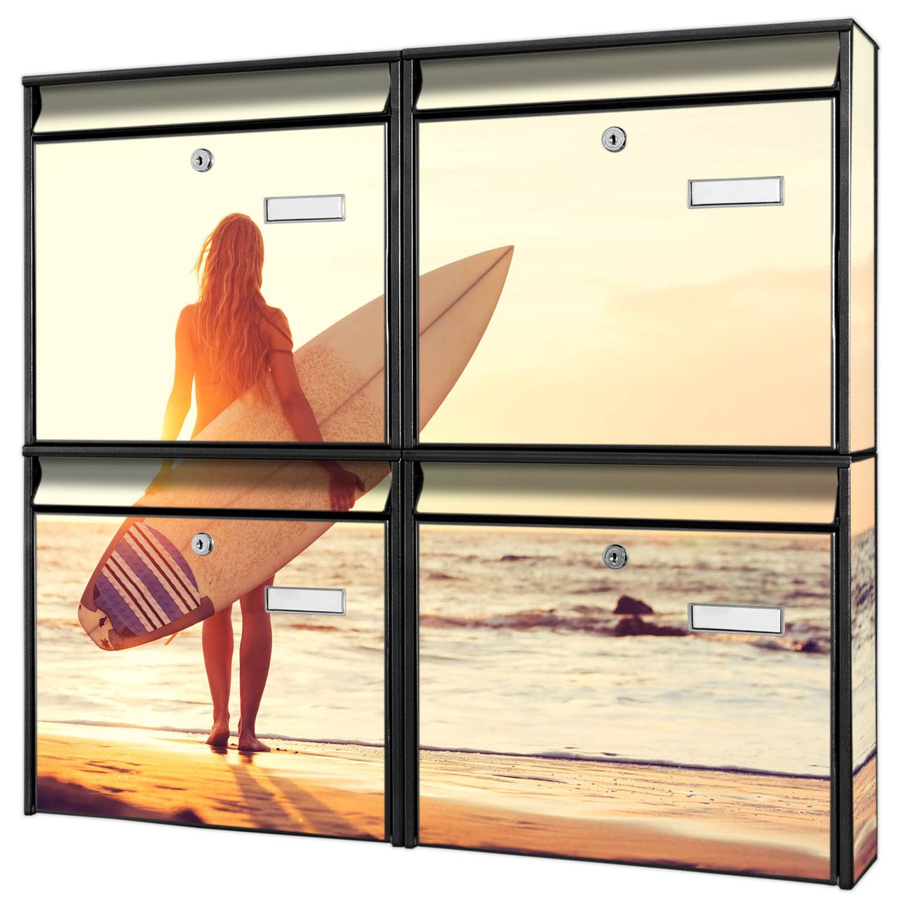 FUNKTION: Die Burg-Wächter Briefkastenanlage mit Motiv Surfer Girl bietet Ihnen ausreichend Fassungsvermögen um auch A4 und C4 Sendungen zu empfangen. Das integrierte Namensschild lässt sich individuell beschriften. Wählen Sie aus den Grundfarben weiß, silber und schwarz. DESIGN: Die 4 Briefkästen haben ein ansprechendes und zeitloses Design, ohne dabei auf Funktionalität zu verzichten. Das Material ist sehr stabil, wetterfest und rostfrei. Durch das Motiv Surfer Girl werden die Postkästen zu einem Blickfang. DETAILS: Die Postkästen bestehen aus verzinktem Stahl der zusätzlich mit Klarlack versiegelt wurde. Die Kästen sind gesamt 64,5cm hoch, 72,5cm breit und 10cm tief. Das Motiv besteht aus einer wetter- und UV-festen Folie, die Ihren Briefkasten zusätzlich vor Kratzern schützt. Die Postkästen werden mit Montagematerial, je einem Namensschild und je zwei Schlüsseln geliefert. NUTZEN: Das Briefkastenset eignet sich für die Wandmontage, die Größe bietet genügend Platz für Sendungen aller Art. Das zeitlose Design sowie die stabile Bauart bieten Ihnen einen treuen Begleiter für Ihre Post. BANJADO: