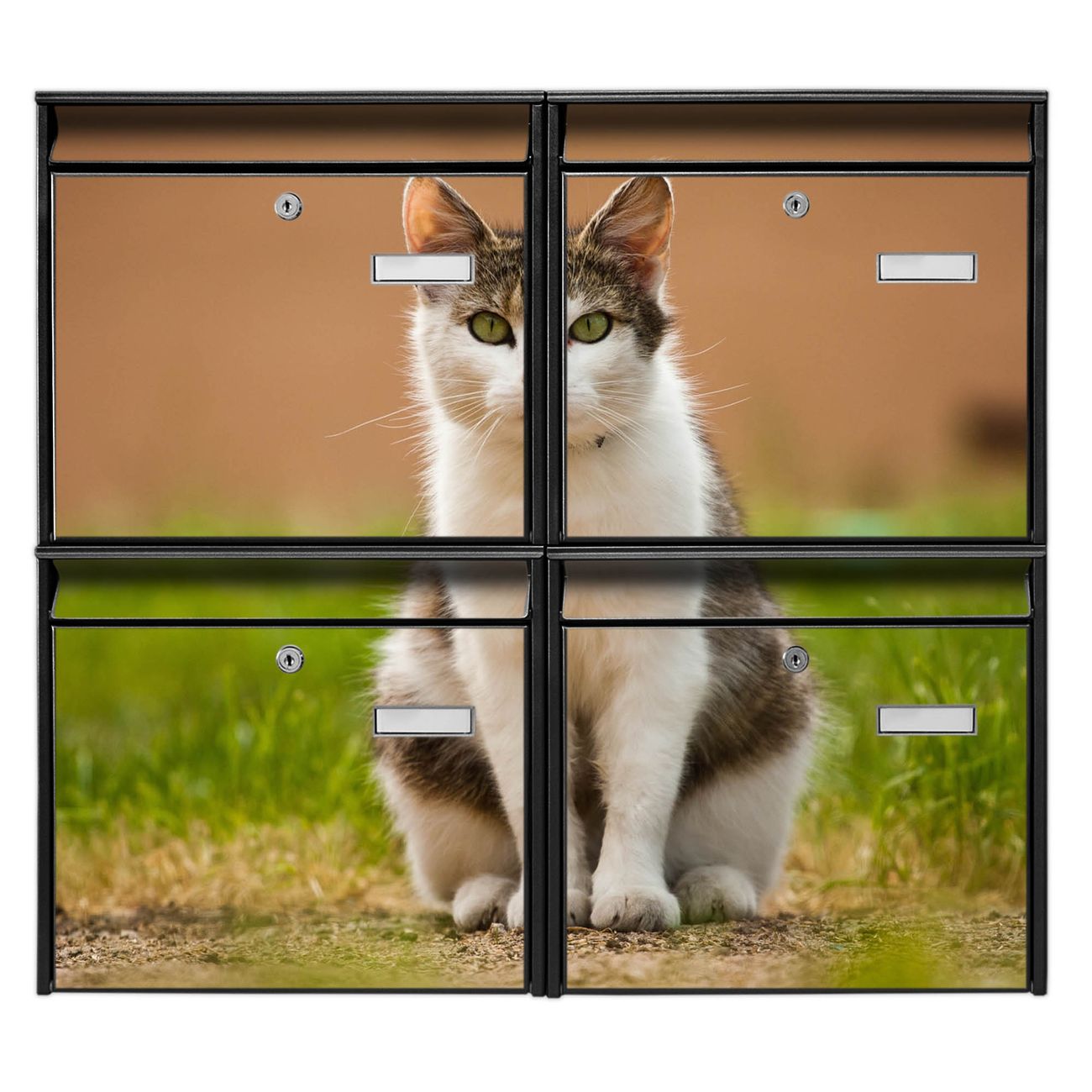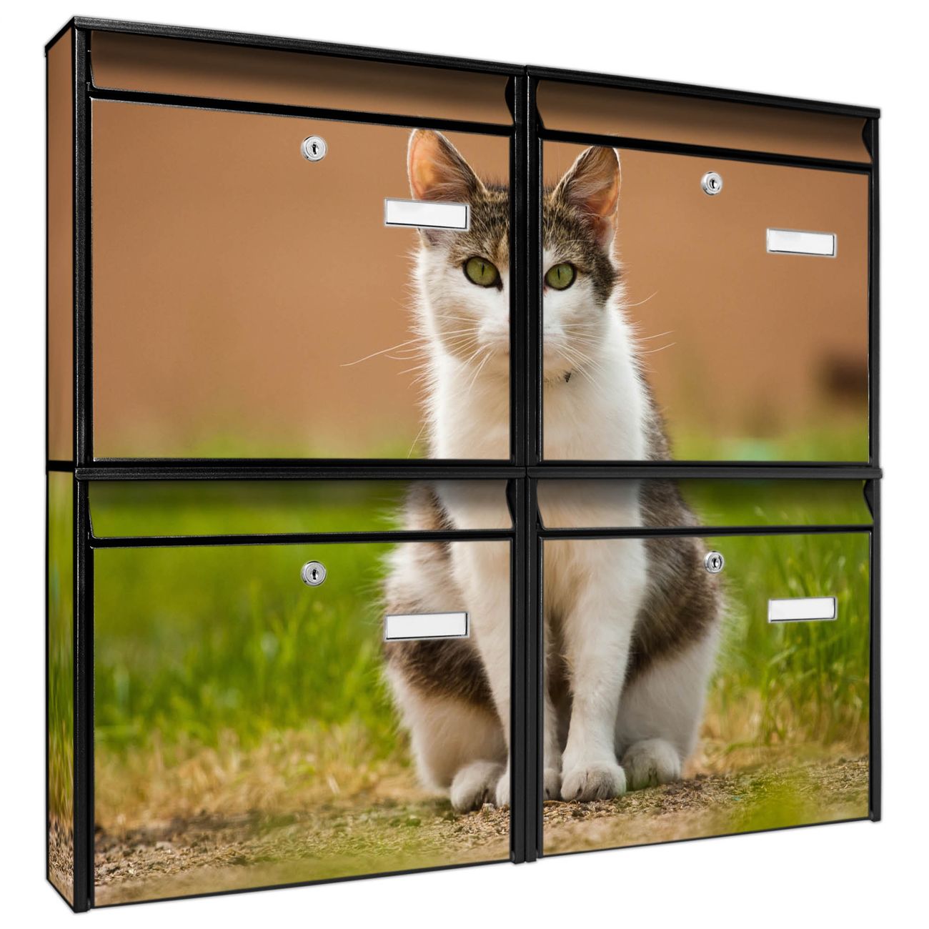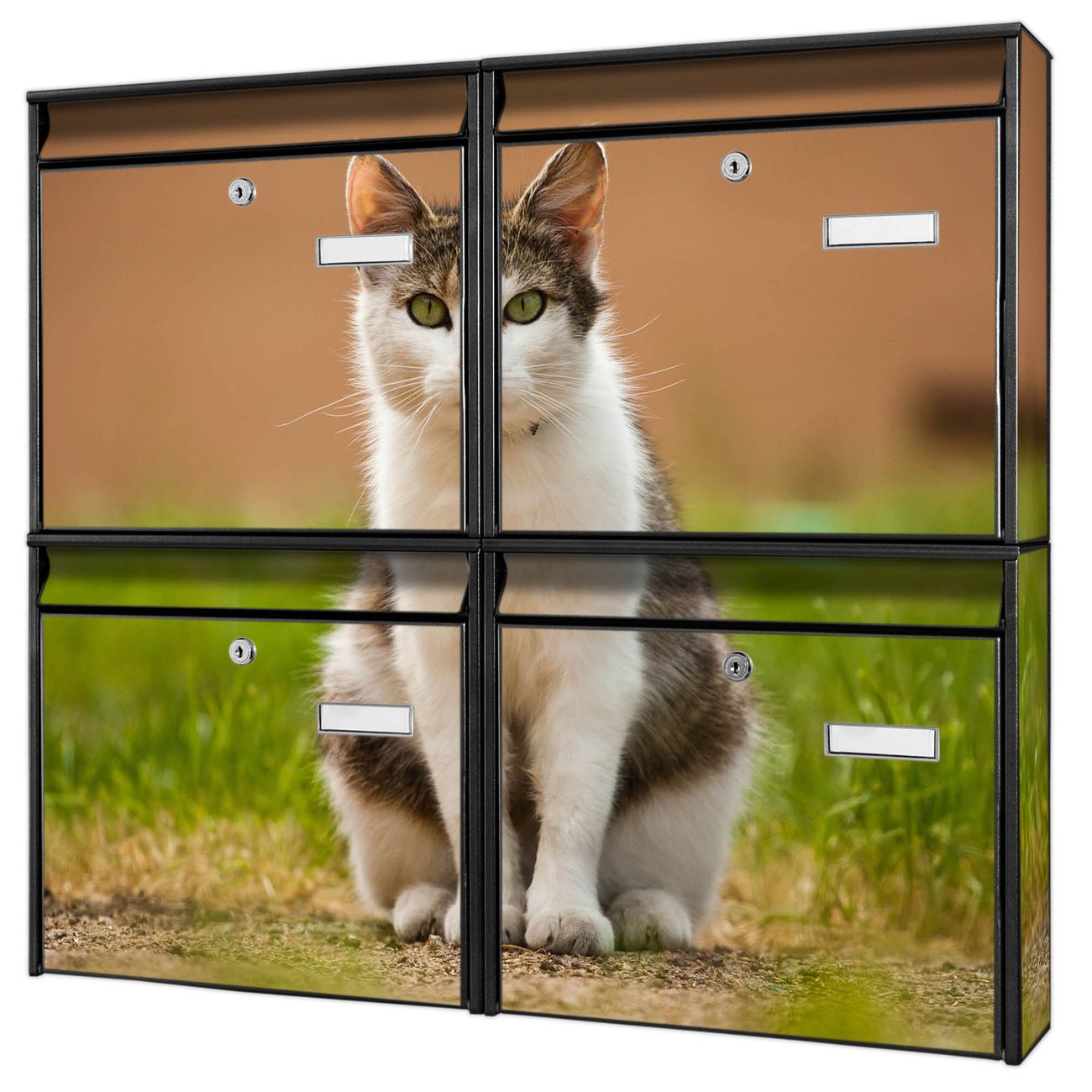 FUNKTION: Die Burg-Wächter Briefkastenanlage mit Motiv Suse bietet Ihnen ausreichend Fassungsvermögen um auch A4 und C4 Sendungen zu empfangen. Das integrierte Namensschild lässt sich individuell beschriften. Wählen Sie aus den Grundfarben weiß, silber und schwarz. DESIGN: Die 4 Briefkästen haben ein ansprechendes und zeitloses Design, ohne dabei auf Funktionalität zu verzichten. Das Material ist sehr stabil, wetterfest und rostfrei. Durch das Motiv Suse werden die Postkästen zu einem Blickfang. DETAILS: Die Postkästen bestehen aus verzinktem Stahl der zusätzlich mit Klarlack versiegelt wurde. Die Kästen sind gesamt 64,5cm hoch, 72,5cm breit und 10cm tief. Das Motiv besteht aus einer wetter- und UV-festen Folie, die Ihren Briefkasten zusätzlich vor Kratzern schützt. Die Postkästen werden mit Montagematerial, je einem Namensschild und je zwei Schlüsseln geliefert. NUTZEN: Das Briefkastenset eignet sich für die Wandmontage, die Größe bietet genügend Platz für Sendungen aller Art. Das zeitlose Design sowie die stabile Bauart bieten Ihnen einen treuen Begleiter für Ihre Post. BANJADO: