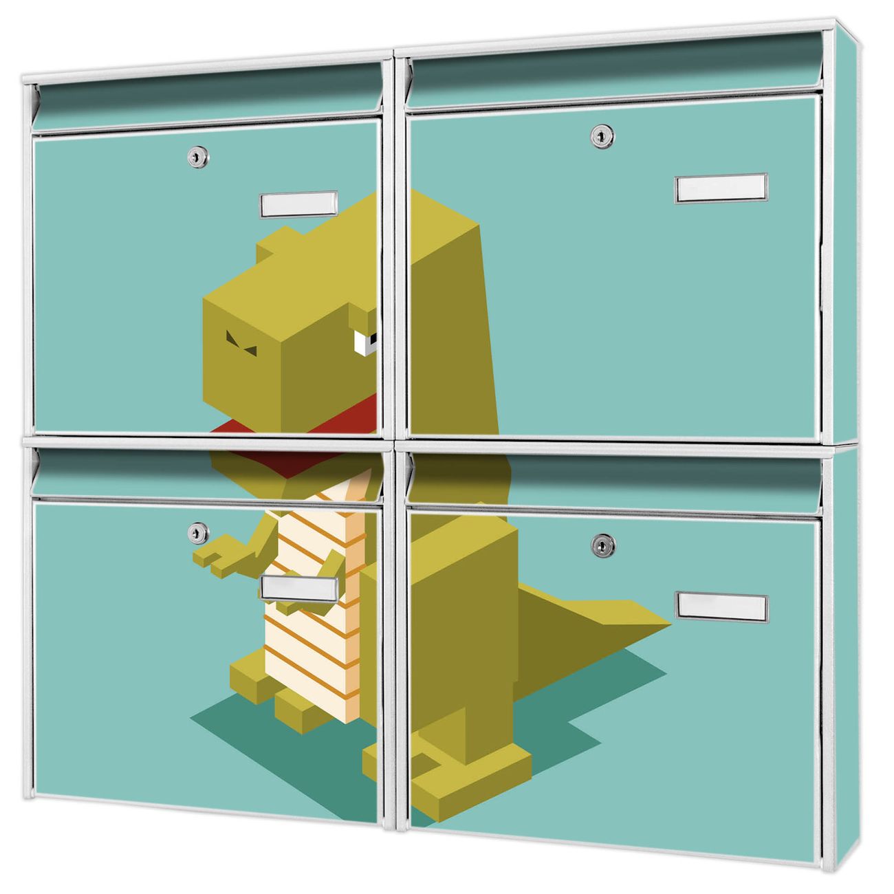 FUNKTION: Die Burg-Wächter Briefkastenanlage mit Motiv T-Rex Block bietet Ihnen ausreichend Fassungsvermögen um auch A4 und C4 Sendungen zu empfangen. Das integrierte Namensschild lässt sich individuell beschriften. Wählen Sie aus den Grundfarben weiß, silber und schwarz. DESIGN: Die 4 Briefkästen haben ein ansprechendes und zeitloses Design, ohne dabei auf Funktionalität zu verzichten. Das Material ist sehr stabil, wetterfest und rostfrei. Durch das Motiv T-Rex Block werden die Postkästen zu einem Blickfang. DETAILS: Die Postkästen bestehen aus verzinktem Stahl der zusätzlich mit Klarlack versiegelt wurde. Die Kästen sind gesamt 64,5cm hoch, 72,5cm breit und 10cm tief. Das Motiv besteht aus einer wetter- und UV-festen Folie, die Ihren Briefkasten zusätzlich vor Kratzern schützt. Die Postkästen werden mit Montagematerial, je einem Namensschild und je zwei Schlüsseln geliefert. NUTZEN: Das Briefkastenset eignet sich für die Wandmontage, die Größe bietet genügend Platz für Sendungen aller Art. Das zeitlose Design sowie die stabile Bauart bieten Ihnen einen treuen Begleiter für Ihre Post. BANJADO: