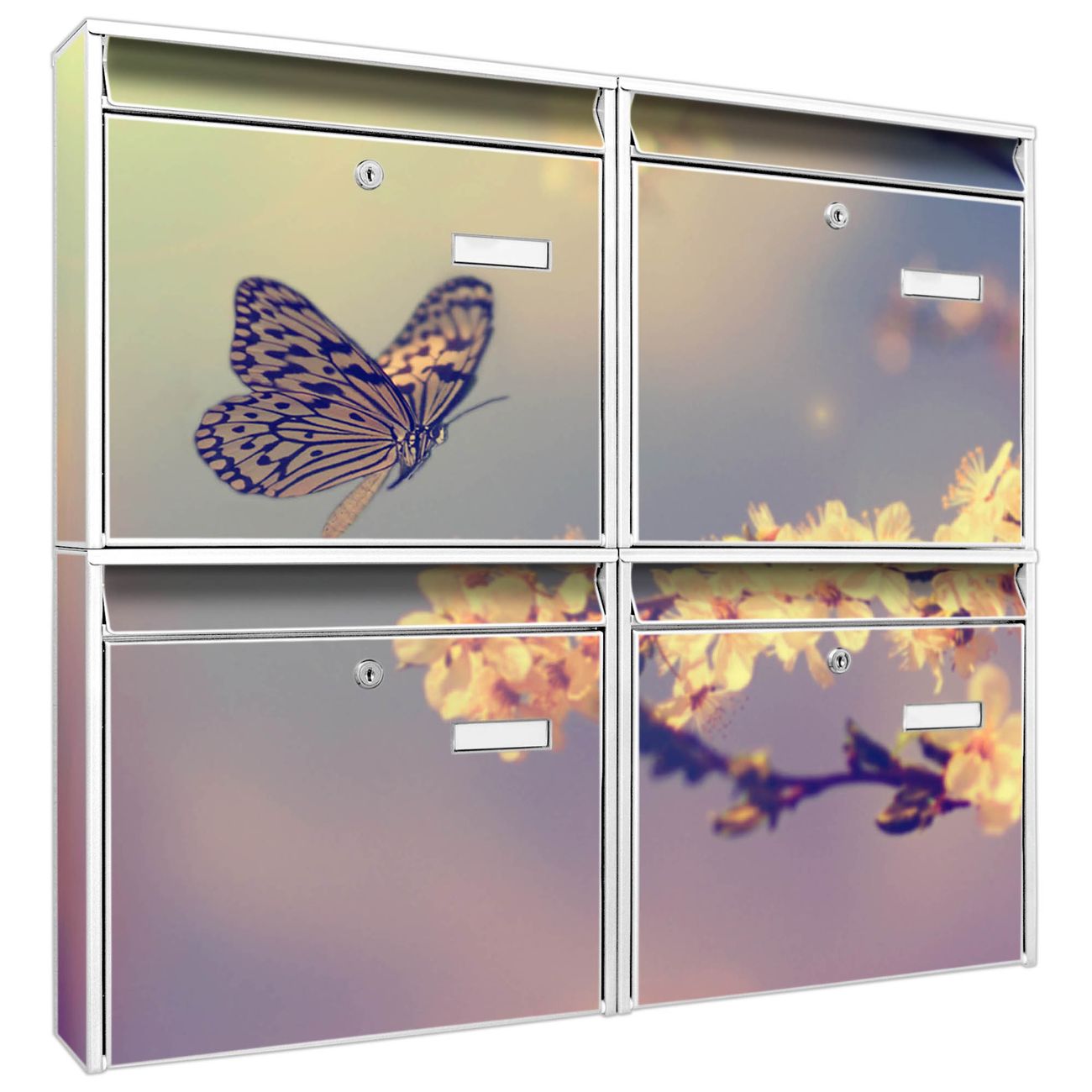 FUNKTION: Die Burg-Wächter Briefkastenanlage mit Motiv Tag Im Mai bietet Ihnen ausreichend Fassungsvermögen um auch A4 und C4 Sendungen zu empfangen. Das integrierte Namensschild lässt sich individuell beschriften. Wählen Sie aus den Grundfarben weiß, silber und schwarz. DESIGN: Die 4 Briefkästen haben ein ansprechendes und zeitloses Design, ohne dabei auf Funktionalität zu verzichten. Das Material ist sehr stabil, wetterfest und rostfrei. Durch das Motiv Tag Im Mai werden die Postkästen zu einem Blickfang. DETAILS: Die Postkästen bestehen aus verzinktem Stahl der zusätzlich mit Klarlack versiegelt wurde. Die Kästen sind gesamt 64,5cm hoch, 72,5cm breit und 10cm tief. Das Motiv besteht aus einer wetter- und UV-festen Folie, die Ihren Briefkasten zusätzlich vor Kratzern schützt. Die Postkästen werden mit Montagematerial, je einem Namensschild und je zwei Schlüsseln geliefert. NUTZEN: Das Briefkastenset eignet sich für die Wandmontage, die Größe bietet genügend Platz für Sendungen aller Art. Das zeitlose Design sowie die stabile Bauart bieten Ihnen einen treuen Begleiter für Ihre Post. BANJADO: