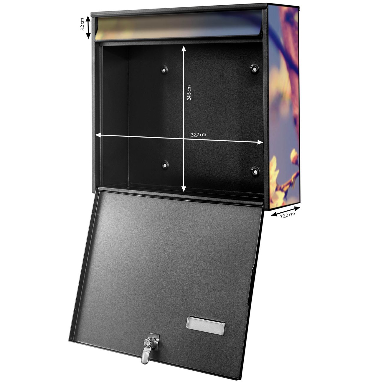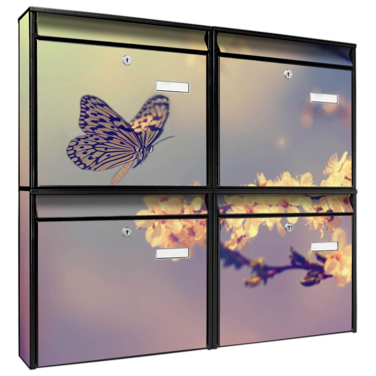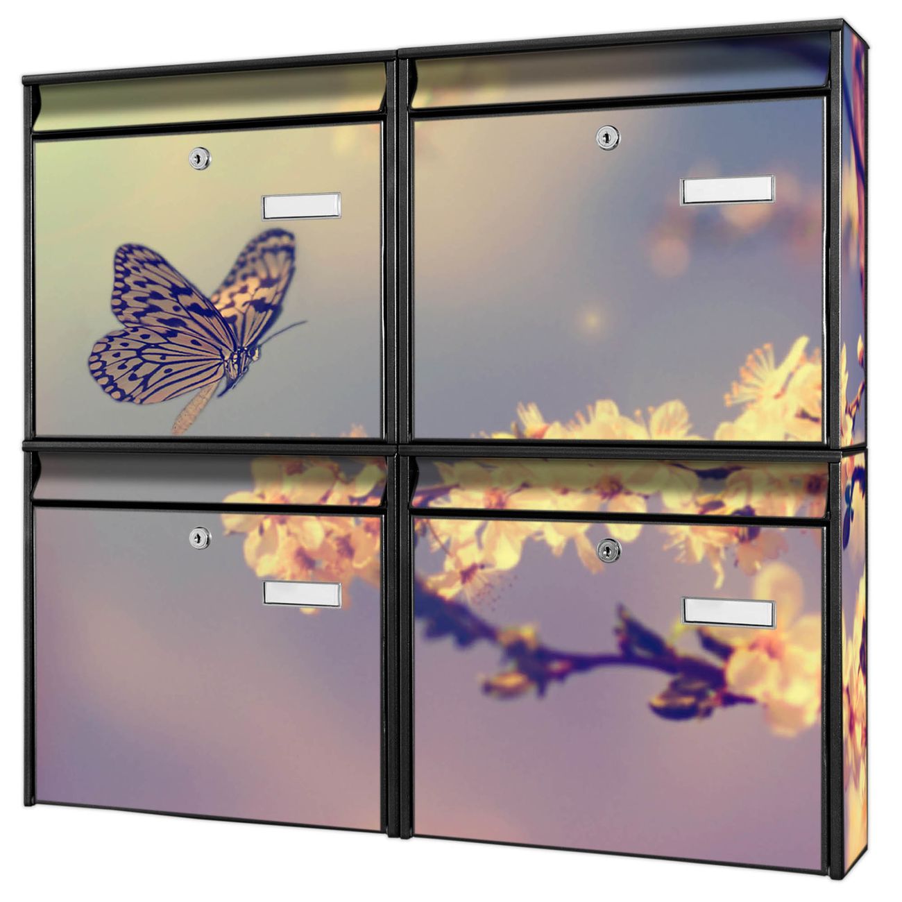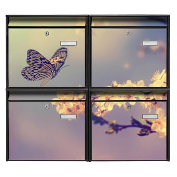 FUNKTION: Die Burg-Wächter Briefkastenanlage mit Motiv Tag Im Mai bietet Ihnen ausreichend Fassungsvermögen um auch A4 und C4 Sendungen zu empfangen. Das integrierte Namensschild lässt sich individuell beschriften. Wählen Sie aus den Grundfarben weiß, silber und schwarz. DESIGN: Die 4 Briefkästen haben ein ansprechendes und zeitloses Design, ohne dabei auf Funktionalität zu verzichten. Das Material ist sehr stabil, wetterfest und rostfrei. Durch das Motiv Tag Im Mai werden die Postkästen zu einem Blickfang. DETAILS: Die Postkästen bestehen aus verzinktem Stahl der zusätzlich mit Klarlack versiegelt wurde. Die Kästen sind gesamt 64,5cm hoch, 72,5cm breit und 10cm tief. Das Motiv besteht aus einer wetter- und UV-festen Folie, die Ihren Briefkasten zusätzlich vor Kratzern schützt. Die Postkästen werden mit Montagematerial, je einem Namensschild und je zwei Schlüsseln geliefert. NUTZEN: Das Briefkastenset eignet sich für die Wandmontage, die Größe bietet genügend Platz für Sendungen aller Art. Das zeitlose Design sowie die stabile Bauart bieten Ihnen einen treuen Begleiter für Ihre Post. BANJADO: