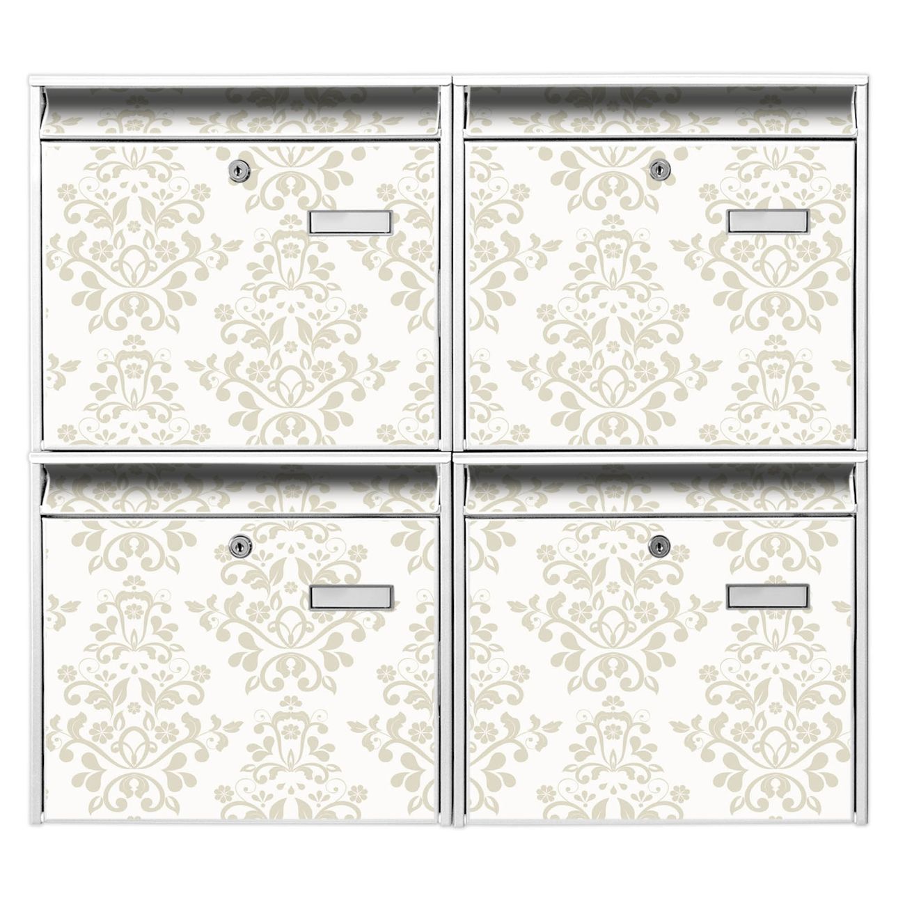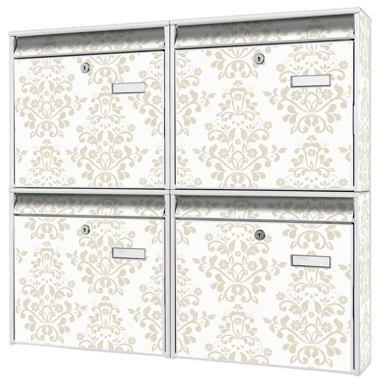 FUNKTION: Die Burg-Wächter Briefkastenanlage mit Motiv Tapete Weiß bietet Ihnen ausreichend Fassungsvermögen um auch A4 und C4 Sendungen zu empfangen. Das integrierte Namensschild lässt sich individuell beschriften. Wählen Sie aus den Grundfarben weiß, silber und schwarz. DESIGN: Die 4 Briefkästen haben ein ansprechendes und zeitloses Design, ohne dabei auf Funktionalität zu verzichten. Das Material ist sehr stabil, wetterfest und rostfrei. Durch das Motiv Tapete Weiß werden die Postkästen zu einem Blickfang. DETAILS: Die Postkästen bestehen aus verzinktem Stahl der zusätzlich mit Klarlack versiegelt wurde. Die Kästen sind gesamt 64,5cm hoch, 72,5cm breit und 10cm tief. Das Motiv besteht aus einer wetter- und UV-festen Folie, die Ihren Briefkasten zusätzlich vor Kratzern schützt. Die Postkästen werden mit Montagematerial, je einem Namensschild und je zwei Schlüsseln geliefert. NUTZEN: Das Briefkastenset eignet sich für die Wandmontage, die Größe bietet genügend Platz für Sendungen aller Art. Das zeitlose Design sowie die stabile Bauart bieten Ihnen einen treuen Begleiter für Ihre Post. BANJADO: