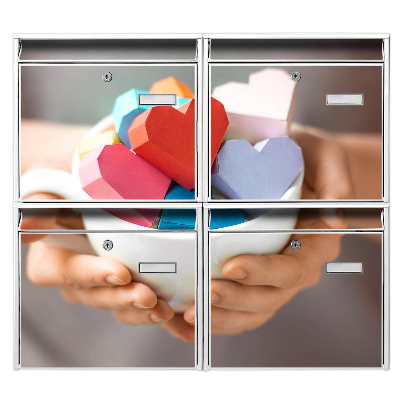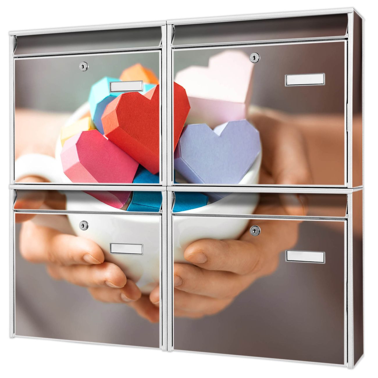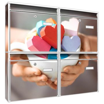 FUNKTION: Die Burg-Wächter Briefkastenanlage mit Motiv Tasse voller Herzen bietet Ihnen ausreichend Fassungsvermögen um auch A4 und C4 Sendungen zu empfangen. Das integrierte Namensschild lässt sich individuell beschriften. Wählen Sie aus den Grundfarben weiß, silber und schwarz. DESIGN: Die 4 Briefkästen haben ein ansprechendes und zeitloses Design, ohne dabei auf Funktionalität zu verzichten. Das Material ist sehr stabil, wetterfest und rostfrei. Durch das Motiv Tasse voller Herzen werden die Postkästen zu einem Blickfang. DETAILS: Die Postkästen bestehen aus verzinktem Stahl der zusätzlich mit Klarlack versiegelt wurde. Die Kästen sind gesamt 64,5cm hoch, 72,5cm breit und 10cm tief. Das Motiv besteht aus einer wetter- und UV-festen Folie, die Ihren Briefkasten zusätzlich vor Kratzern schützt. Die Postkästen werden mit Montagematerial, je einem Namensschild und je zwei Schlüsseln geliefert. NUTZEN: Das Briefkastenset eignet sich für die Wandmontage, die Größe bietet genügend Platz für Sendungen aller Art. Das zeitlose Design sowie die stabile Bauart bieten Ihnen einen treuen Begleiter für Ihre Post. BANJADO: