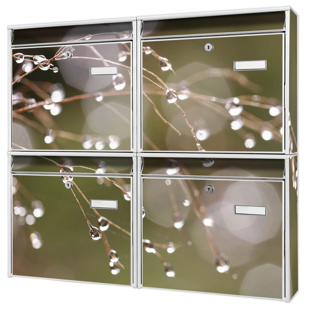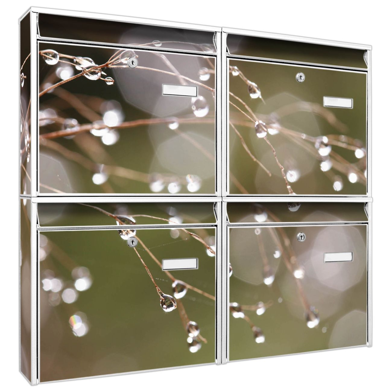 FUNKTION: Die Burg-Wächter Briefkastenanlage mit Motiv Tau Auf Zweigen bietet Ihnen ausreichend Fassungsvermögen um auch A4 und C4 Sendungen zu empfangen. Das integrierte Namensschild lässt sich individuell beschriften. Wählen Sie aus den Grundfarben weiß, silber und schwarz. DESIGN: Die 4 Briefkästen haben ein ansprechendes und zeitloses Design, ohne dabei auf Funktionalität zu verzichten. Das Material ist sehr stabil, wetterfest und rostfrei. Durch das Motiv Tau Auf Zweigen werden die Postkästen zu einem Blickfang. DETAILS: Die Postkästen bestehen aus verzinktem Stahl der zusätzlich mit Klarlack versiegelt wurde. Die Kästen sind gesamt 64,5cm hoch, 72,5cm breit und 10cm tief. Das Motiv besteht aus einer wetter- und UV-festen Folie, die Ihren Briefkasten zusätzlich vor Kratzern schützt. Die Postkästen werden mit Montagematerial, je einem Namensschild und je zwei Schlüsseln geliefert. NUTZEN: Das Briefkastenset eignet sich für die Wandmontage, die Größe bietet genügend Platz für Sendungen aller Art. Das zeitlose Design sowie die stabile Bauart bieten Ihnen einen treuen Begleiter für Ihre Post. BANJADO: