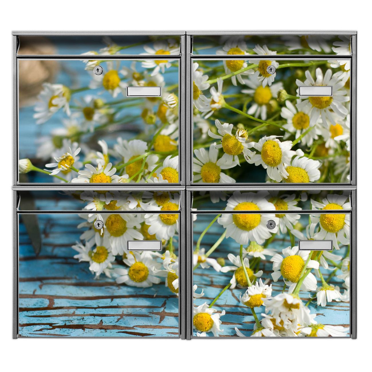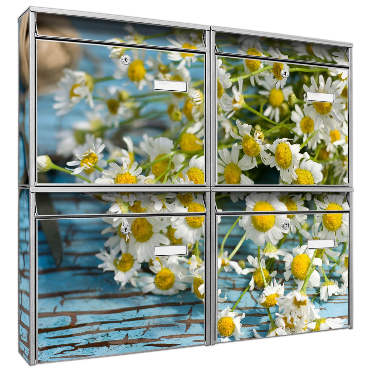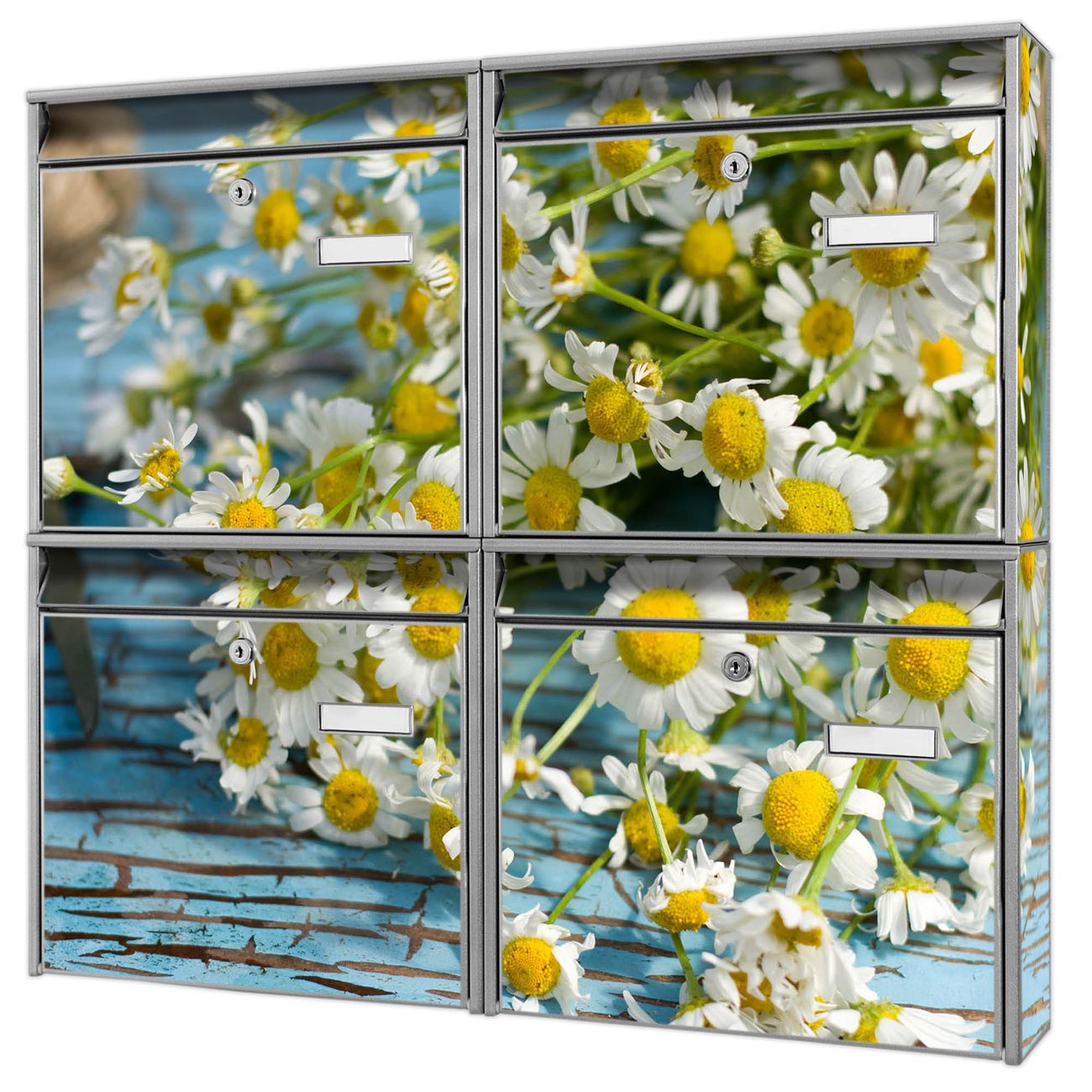 FUNKTION: Die Burg-Wächter Briefkastenanlage mit Motiv Tausendschön bietet Ihnen ausreichend Fassungsvermögen um auch A4 und C4 Sendungen zu empfangen. Das integrierte Namensschild lässt sich individuell beschriften. Wählen Sie aus den Grundfarben weiß, silber und schwarz. DESIGN: Die 4 Briefkästen haben ein ansprechendes und zeitloses Design, ohne dabei auf Funktionalität zu verzichten. Das Material ist sehr stabil, wetterfest und rostfrei. Durch das Motiv Tausendschön werden die Postkästen zu einem Blickfang. DETAILS: Die Postkästen bestehen aus verzinktem Stahl der zusätzlich mit Klarlack versiegelt wurde. Die Kästen sind gesamt 64,5cm hoch, 72,5cm breit und 10cm tief. Das Motiv besteht aus einer wetter- und UV-festen Folie, die Ihren Briefkasten zusätzlich vor Kratzern schützt. Die Postkästen werden mit Montagematerial, je einem Namensschild und je zwei Schlüsseln geliefert. NUTZEN: Das Briefkastenset eignet sich für die Wandmontage, die Größe bietet genügend Platz für Sendungen aller Art. Das zeitlose Design sowie die stabile Bauart bieten Ihnen einen treuen Begleiter für Ihre Post. BANJADO: