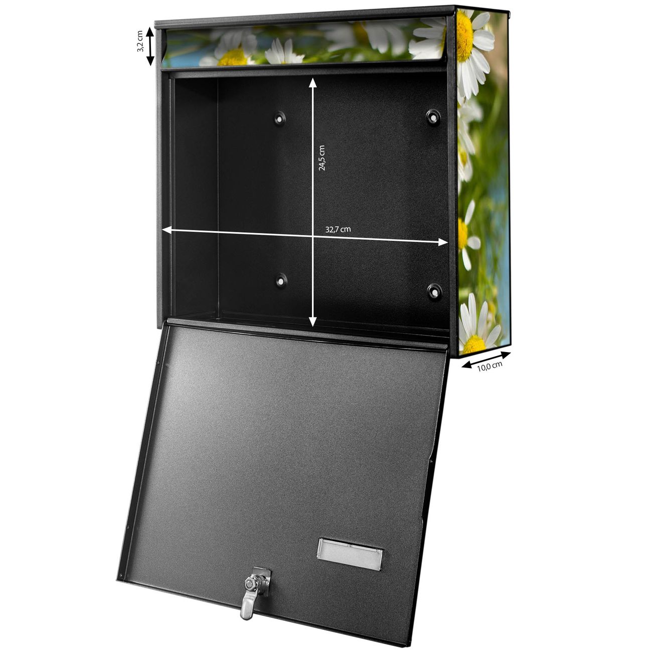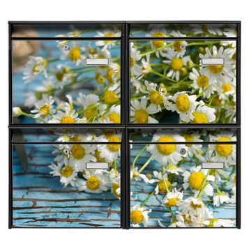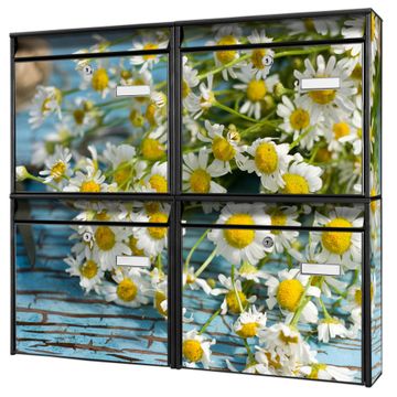 FUNKTION: Die Burg-Wächter Briefkastenanlage mit Motiv Tausendschön bietet Ihnen ausreichend Fassungsvermögen um auch A4 und C4 Sendungen zu empfangen. Das integrierte Namensschild lässt sich individuell beschriften. Wählen Sie aus den Grundfarben weiß, silber und schwarz. DESIGN: Die 4 Briefkästen haben ein ansprechendes und zeitloses Design, ohne dabei auf Funktionalität zu verzichten. Das Material ist sehr stabil, wetterfest und rostfrei. Durch das Motiv Tausendschön werden die Postkästen zu einem Blickfang. DETAILS: Die Postkästen bestehen aus verzinktem Stahl der zusätzlich mit Klarlack versiegelt wurde. Die Kästen sind gesamt 64,5cm hoch, 72,5cm breit und 10cm tief. Das Motiv besteht aus einer wetter- und UV-festen Folie, die Ihren Briefkasten zusätzlich vor Kratzern schützt. Die Postkästen werden mit Montagematerial, je einem Namensschild und je zwei Schlüsseln geliefert. NUTZEN: Das Briefkastenset eignet sich für die Wandmontage, die Größe bietet genügend Platz für Sendungen aller Art. Das zeitlose Design sowie die stabile Bauart bieten Ihnen einen treuen Begleiter für Ihre Post. BANJADO: