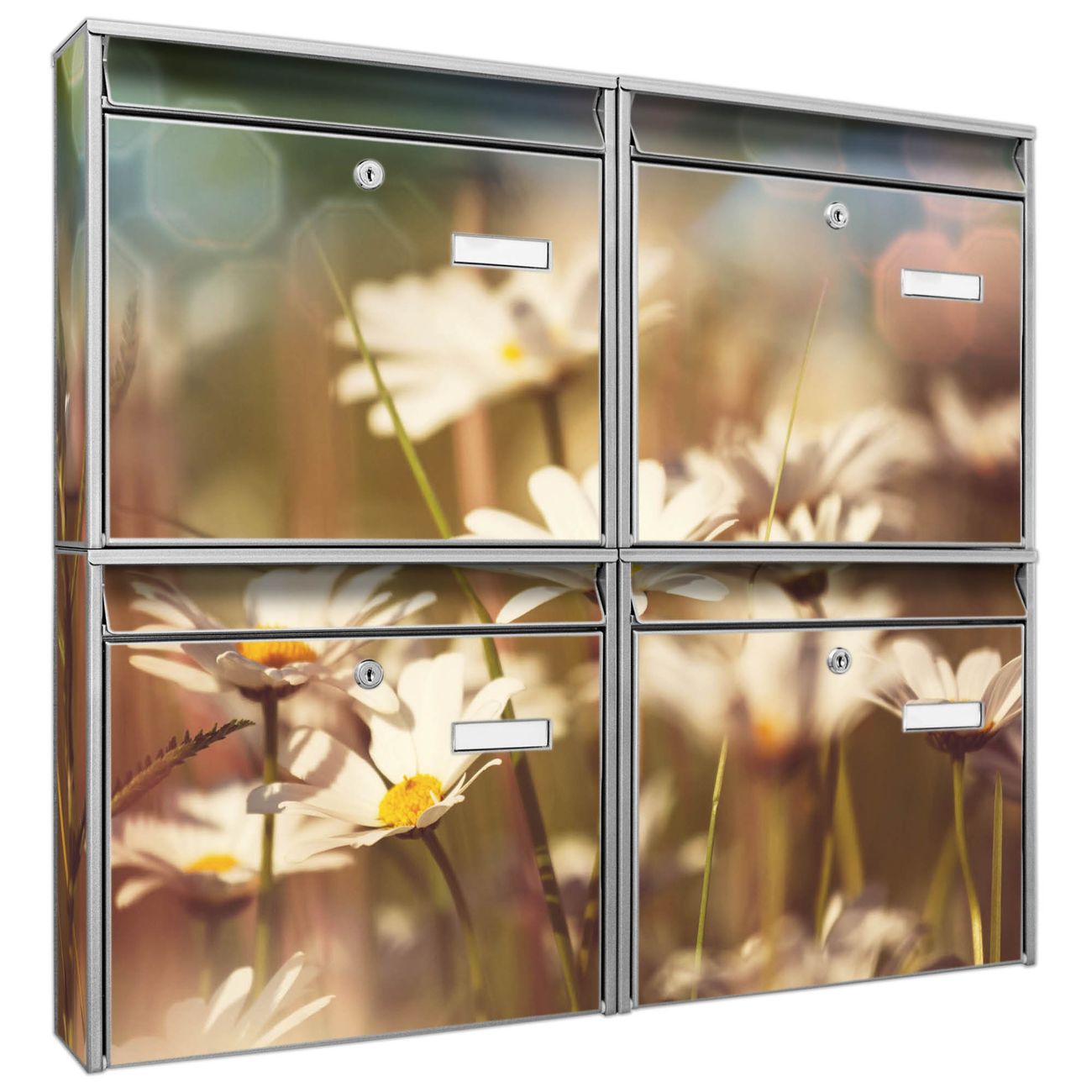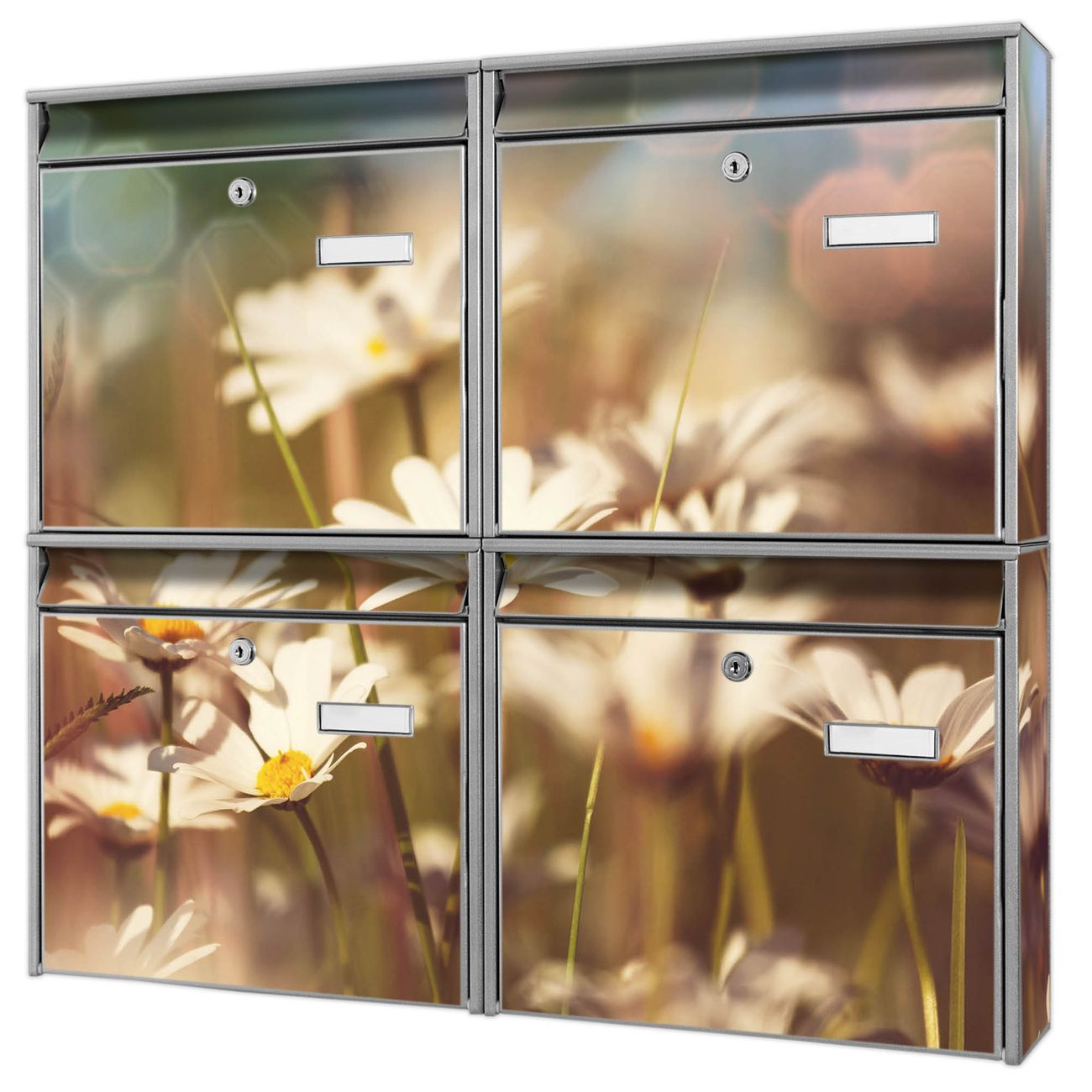 FUNKTION: Die Burg-Wächter Briefkastenanlage mit Motiv Tausendschönwiese bietet Ihnen ausreichend Fassungsvermögen um auch A4 und C4 Sendungen zu empfangen. Das integrierte Namensschild lässt sich individuell beschriften. Wählen Sie aus den Grundfarben weiß, silber und schwarz. DESIGN: Die 4 Briefkästen haben ein ansprechendes und zeitloses Design, ohne dabei auf Funktionalität zu verzichten. Das Material ist sehr stabil, wetterfest und rostfrei. Durch das Motiv Tausendschönwiese werden die Postkästen zu einem Blickfang. DETAILS: Die Postkästen bestehen aus verzinktem Stahl der zusätzlich mit Klarlack versiegelt wurde. Die Kästen sind gesamt 64,5cm hoch, 72,5cm breit und 10cm tief. Das Motiv besteht aus einer wetter- und UV-festen Folie, die Ihren Briefkasten zusätzlich vor Kratzern schützt. Die Postkästen werden mit Montagematerial, je einem Namensschild und je zwei Schlüsseln geliefert. NUTZEN: Das Briefkastenset eignet sich für die Wandmontage, die Größe bietet genügend Platz für Sendungen aller Art. Das zeitlose Design sowie die stabile Bauart bieten Ihnen einen treuen Begleiter für Ihre Post. BANJADO: